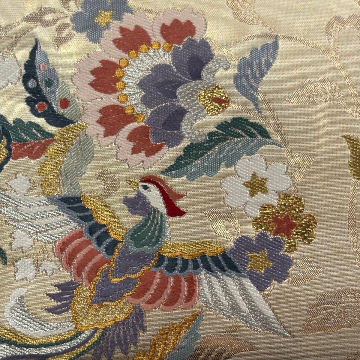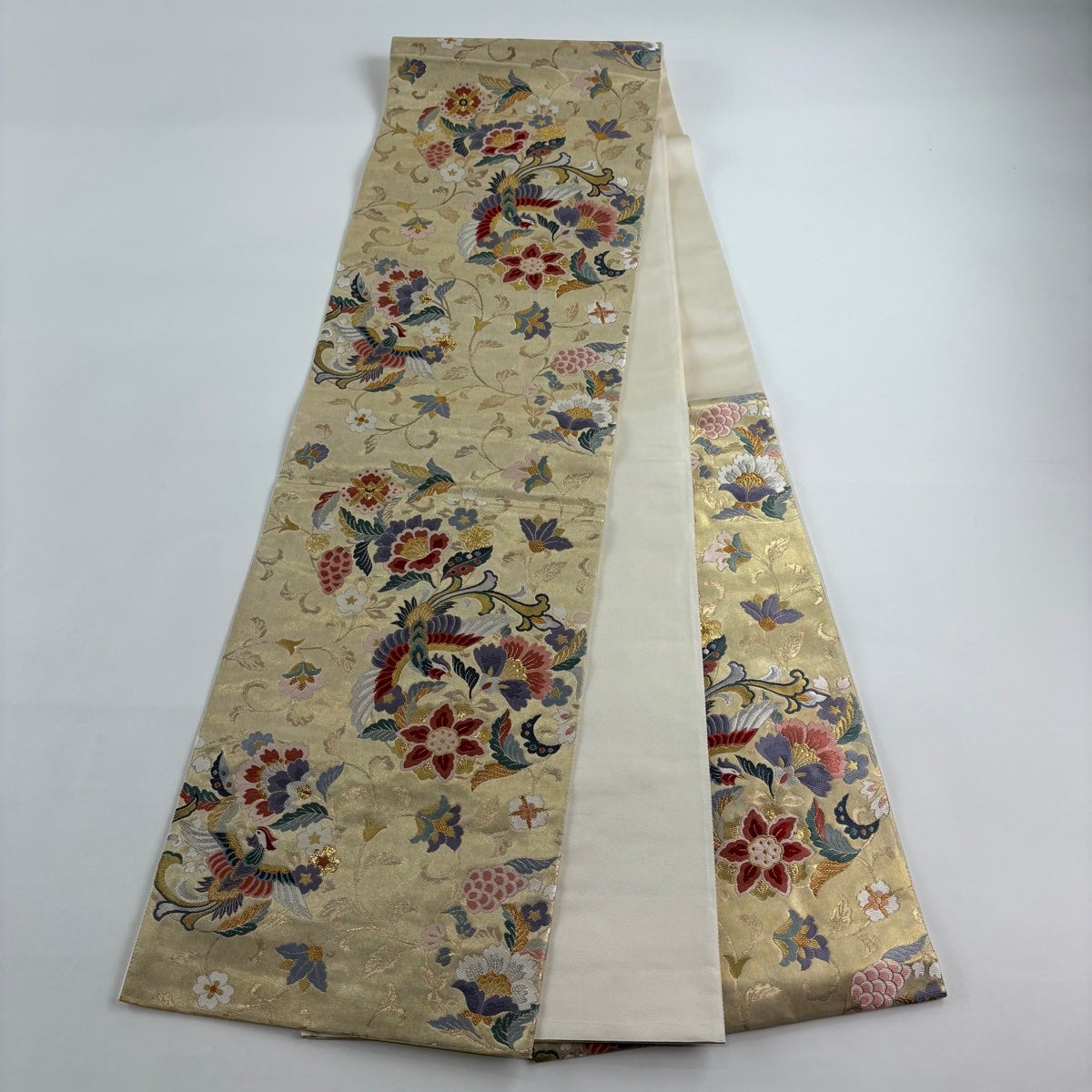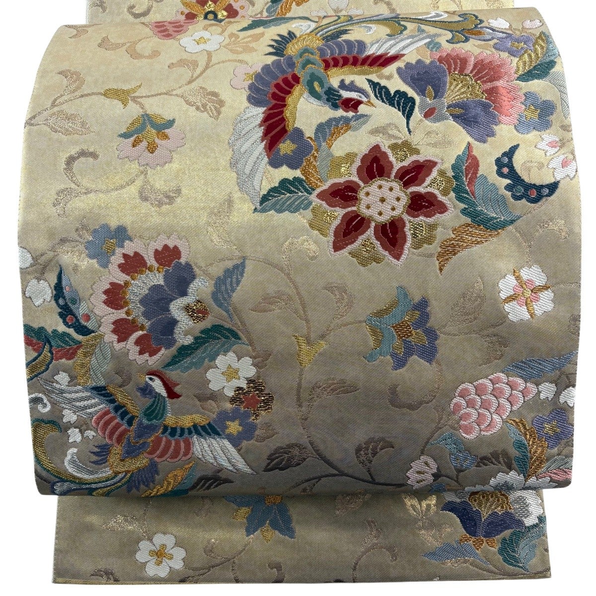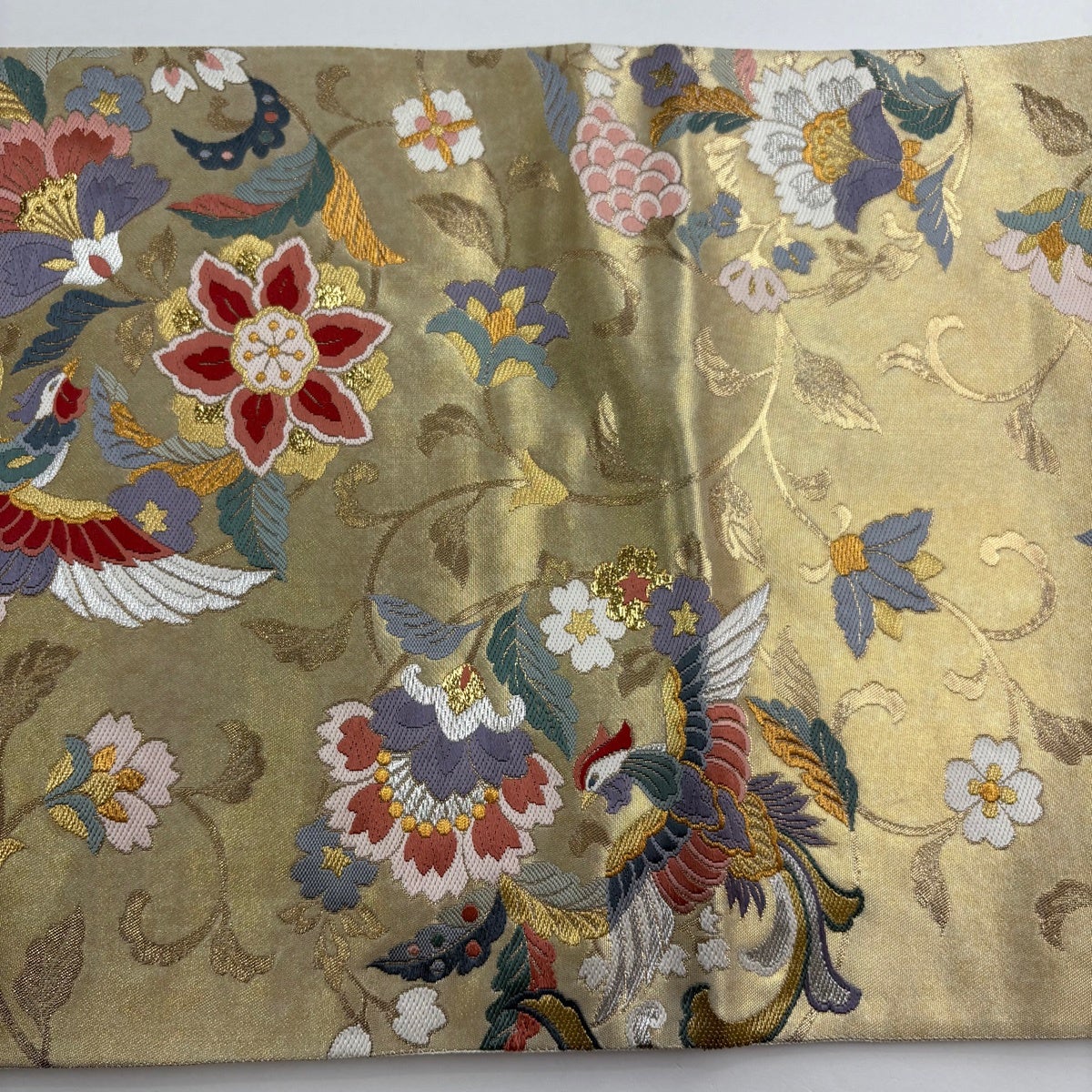 袋帯 秀品 関西仕立て 鳥 草花 箔 金糸 銀色 六通 正絹
