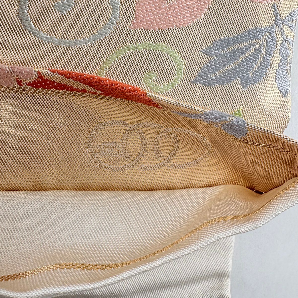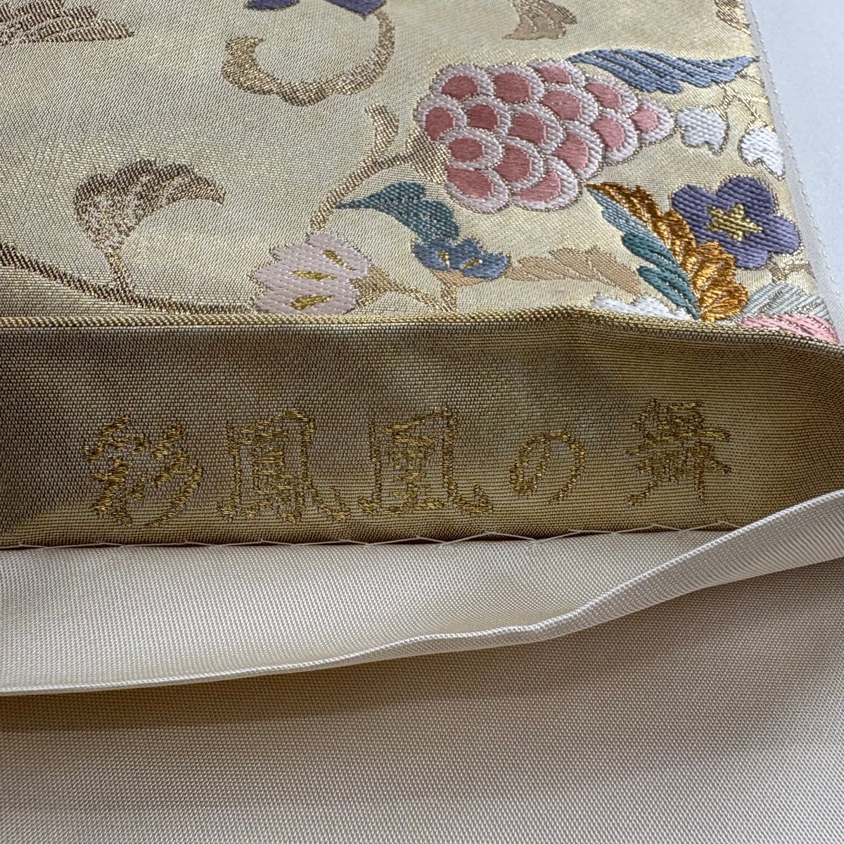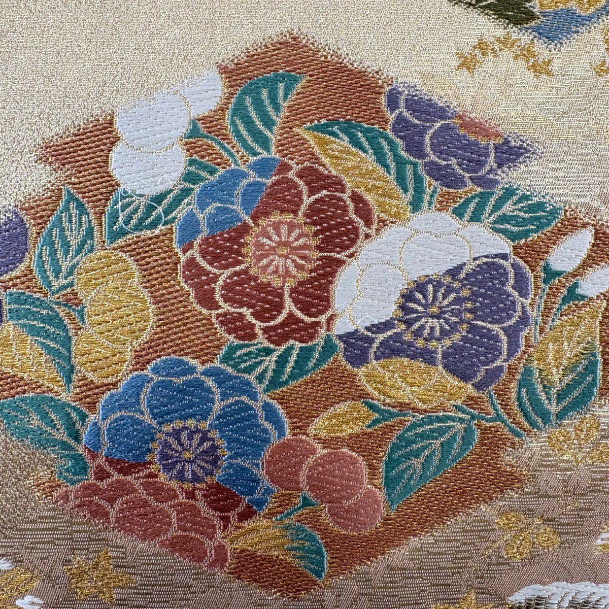 袋帯 秀品 花丸文 牡丹 唐織 箔 ベージュ 六通 正絹