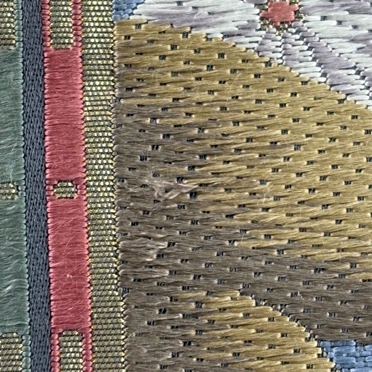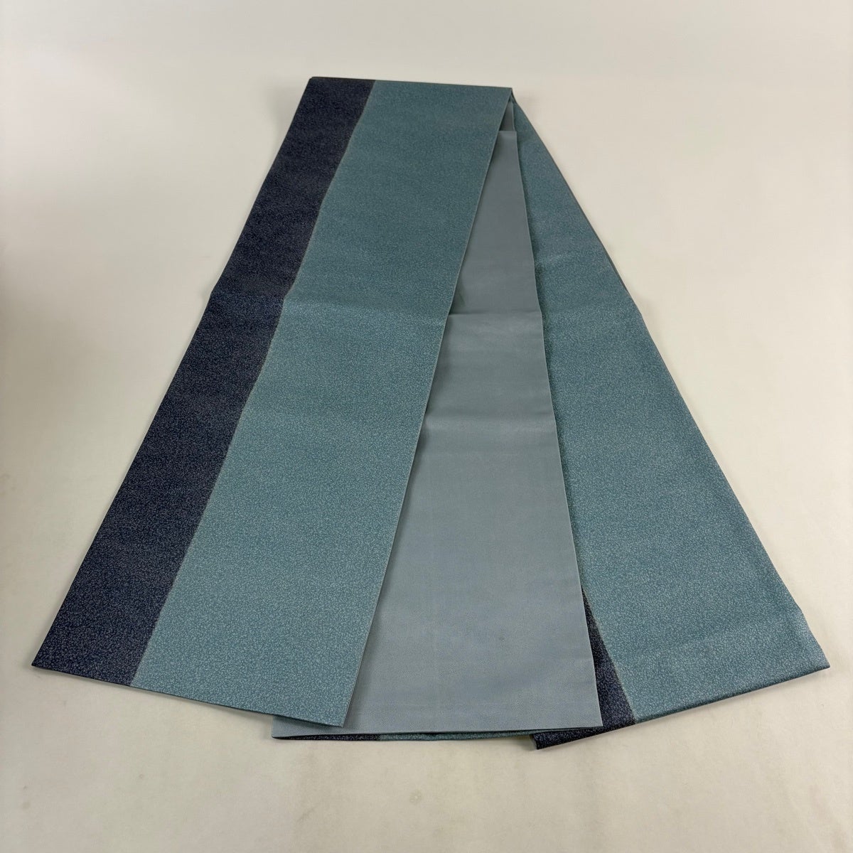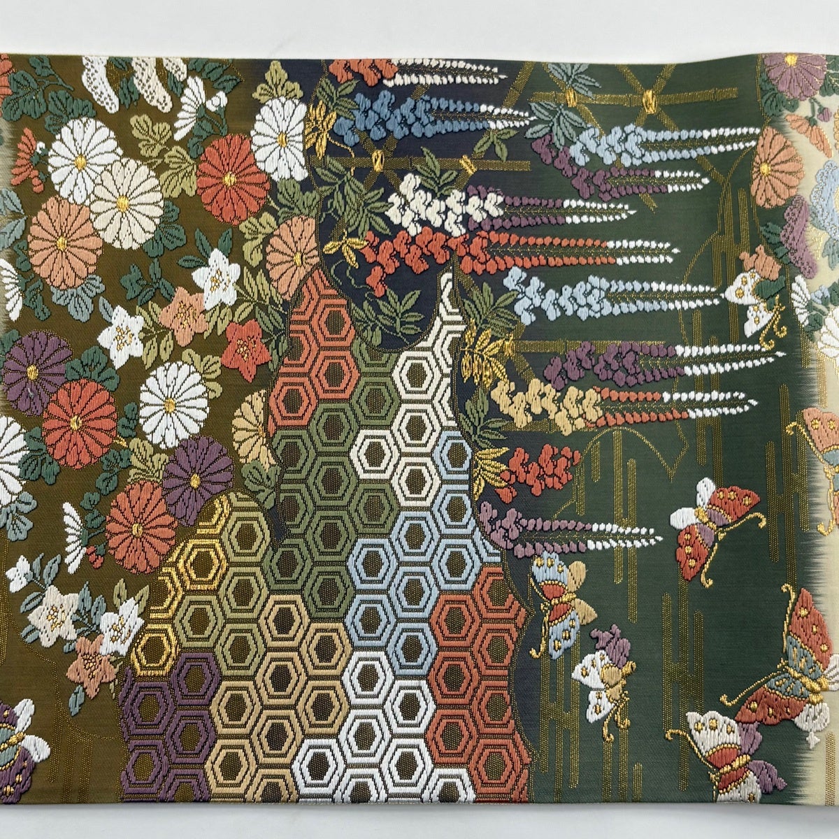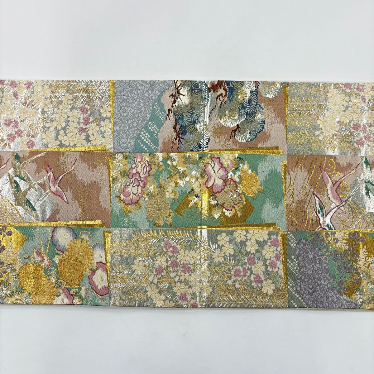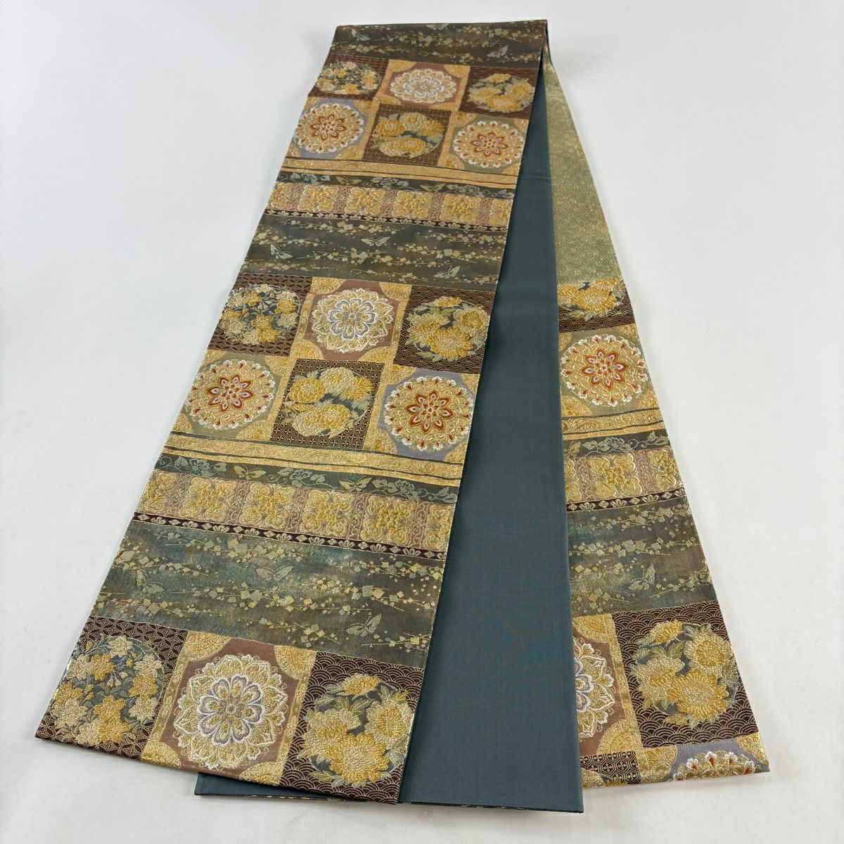 【美品】 袋帯 秀品 証紙あり 幾何学 箔 灰緑 六通 正絹