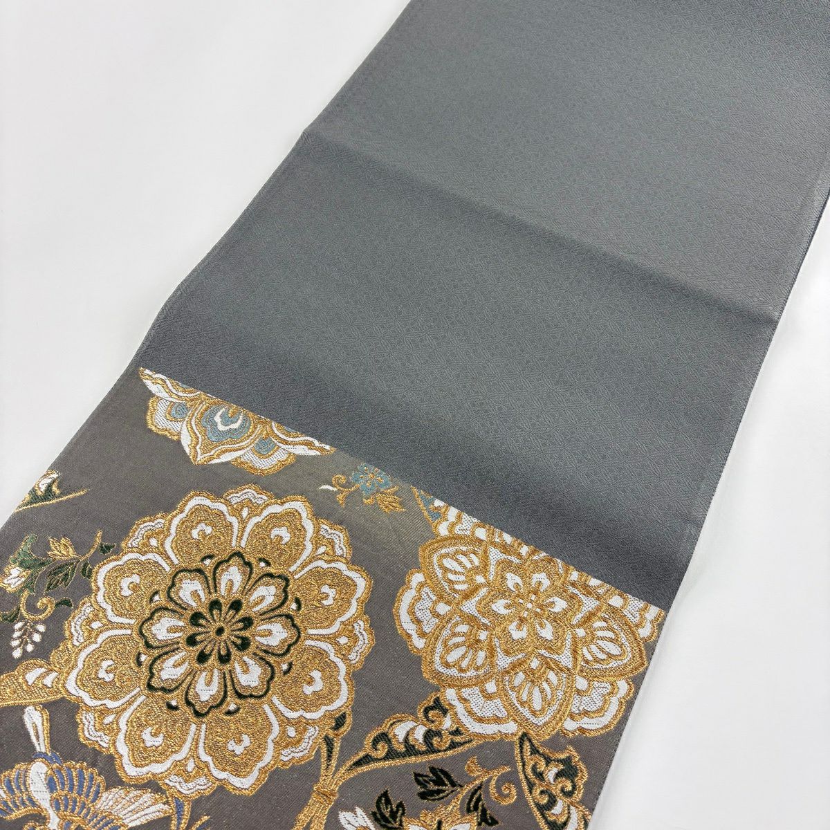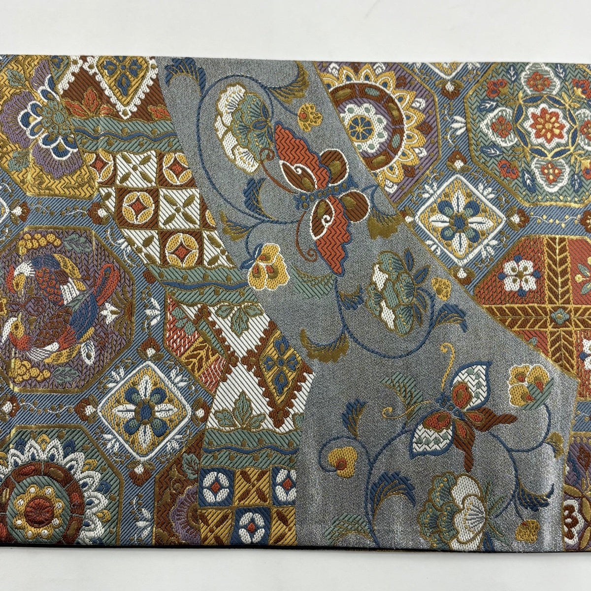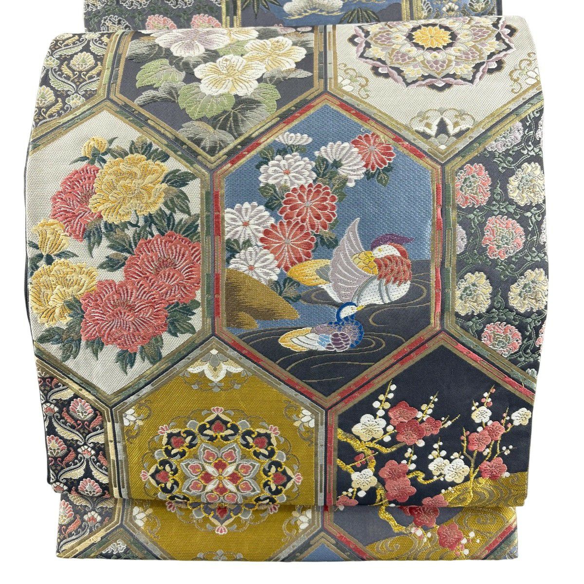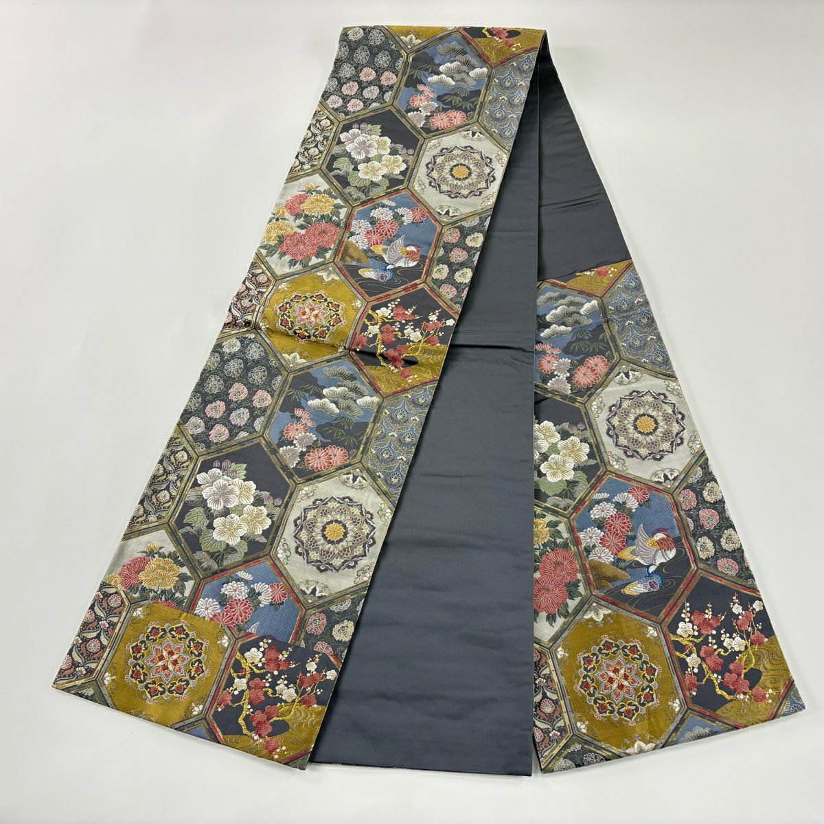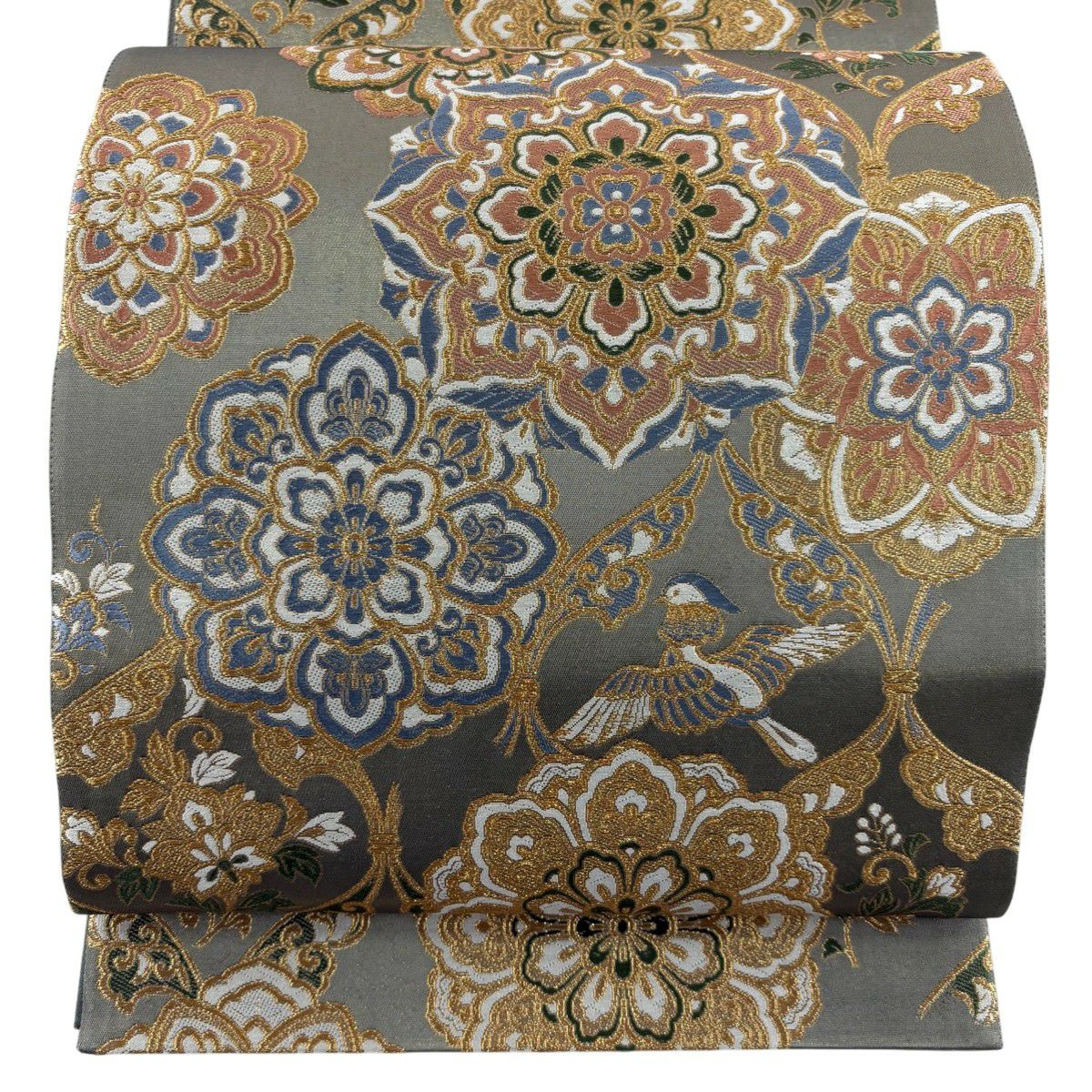 【美品】 袋帯 秀品 亀甲 花鳥 金糸 箔 灰色 六通 正絹