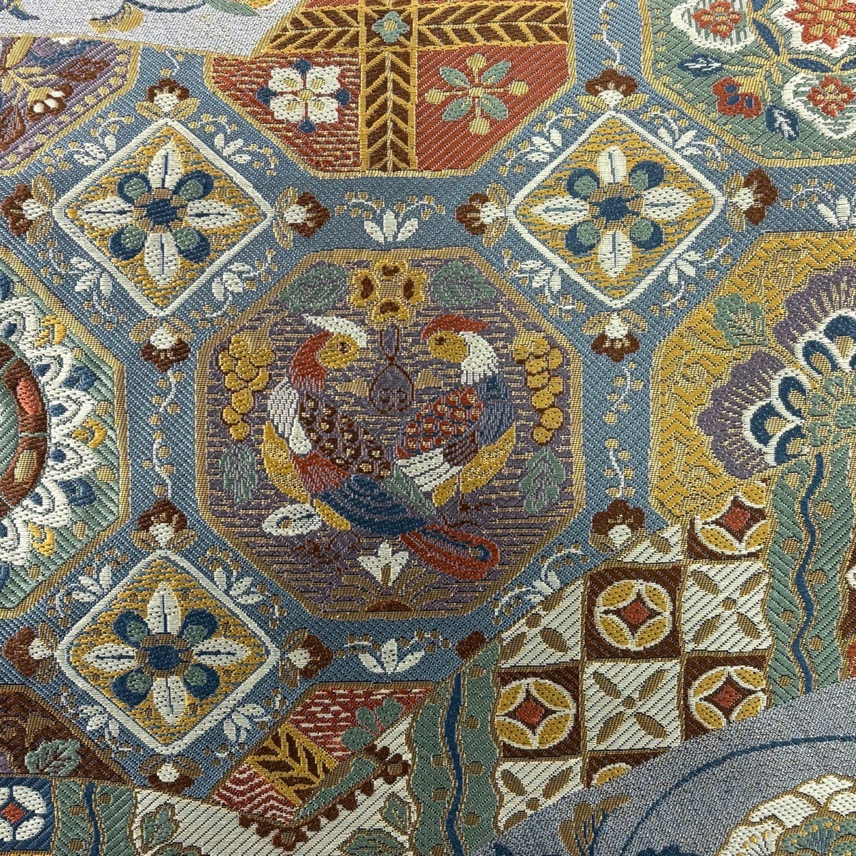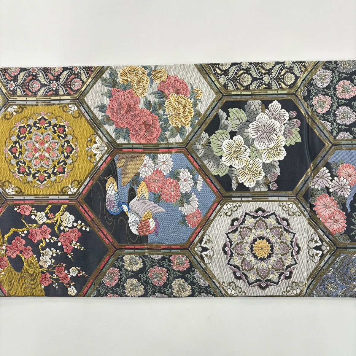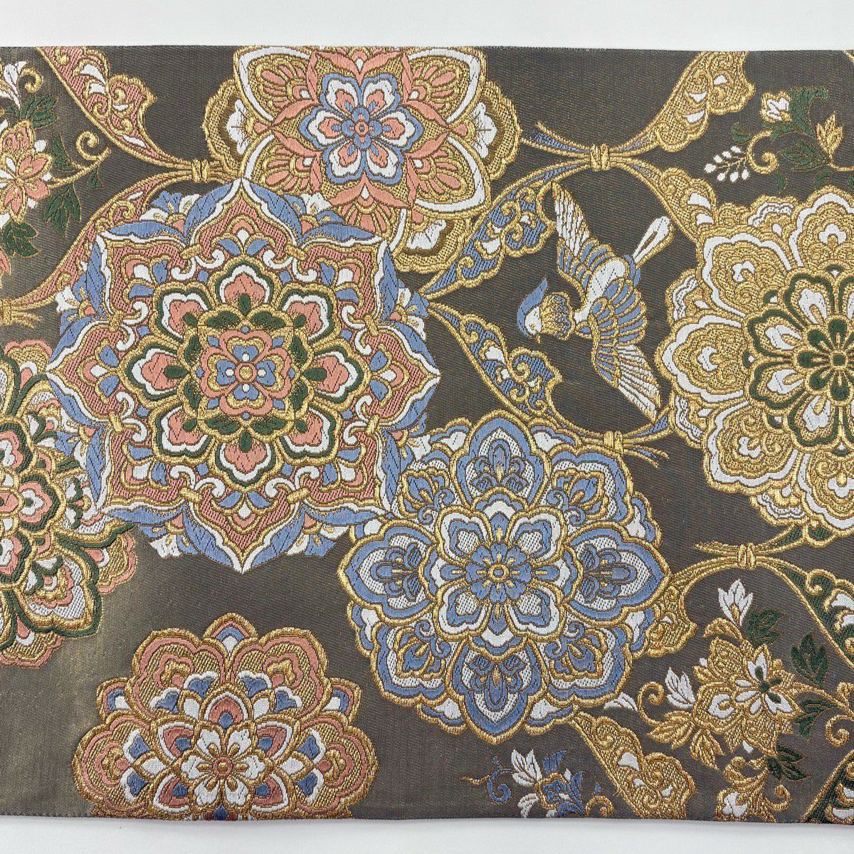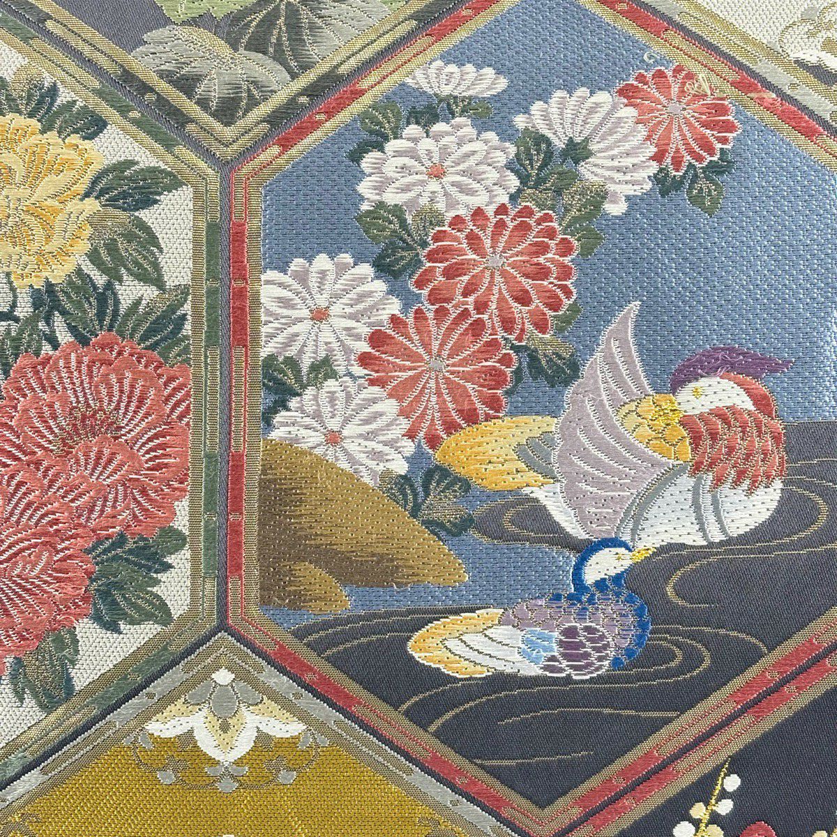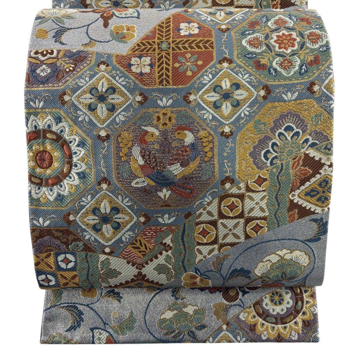 【美品】 袋帯 秀品 亀甲 花鳥 金糸 箔 灰色 六通 正絹