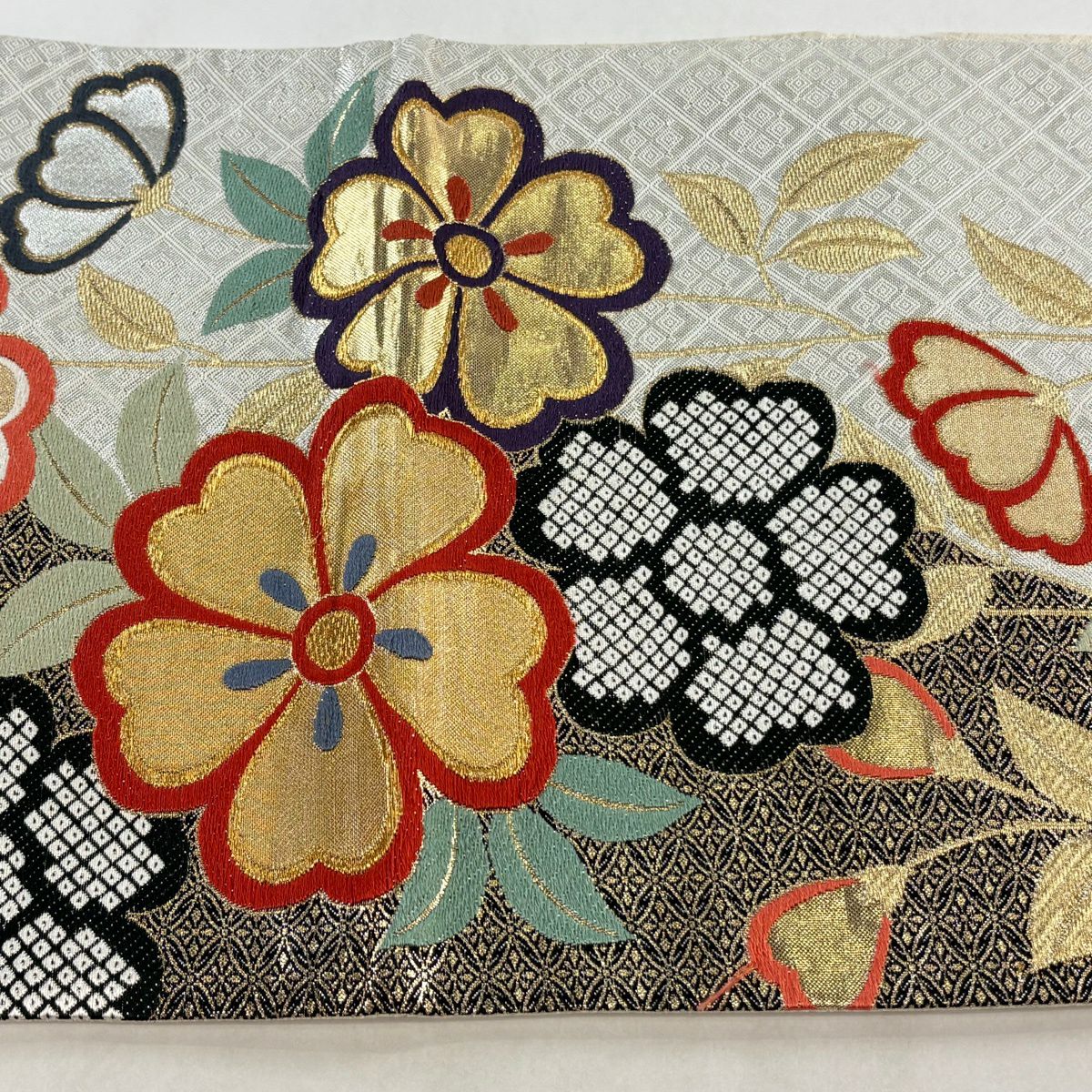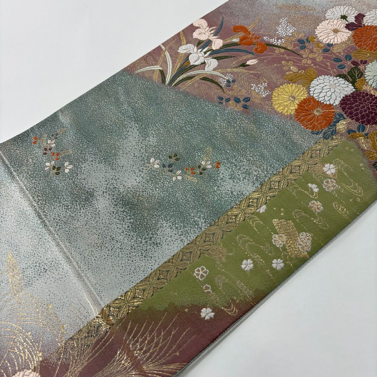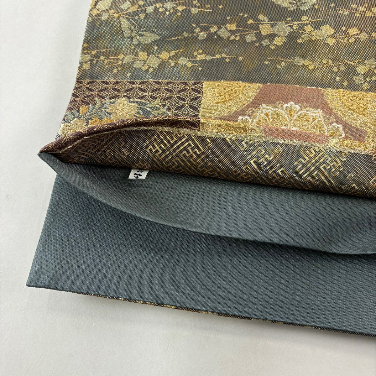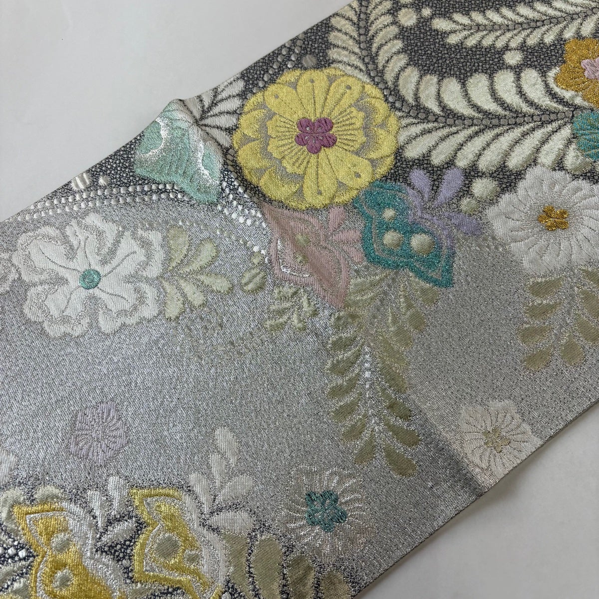 【美品】 袋帯 秀品 秋草 七宝 金糸 箔 灰色 六通 正絹