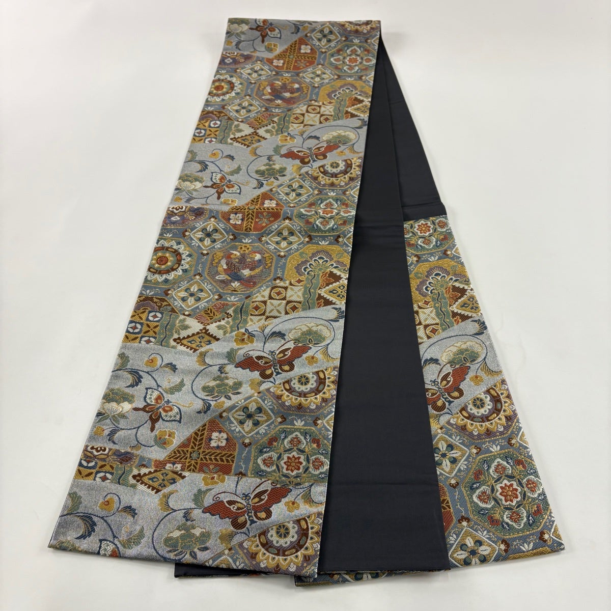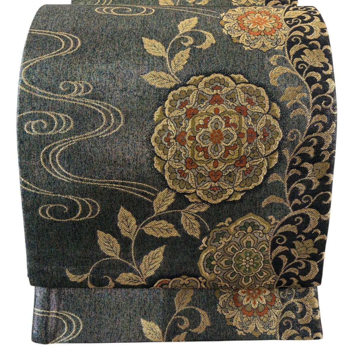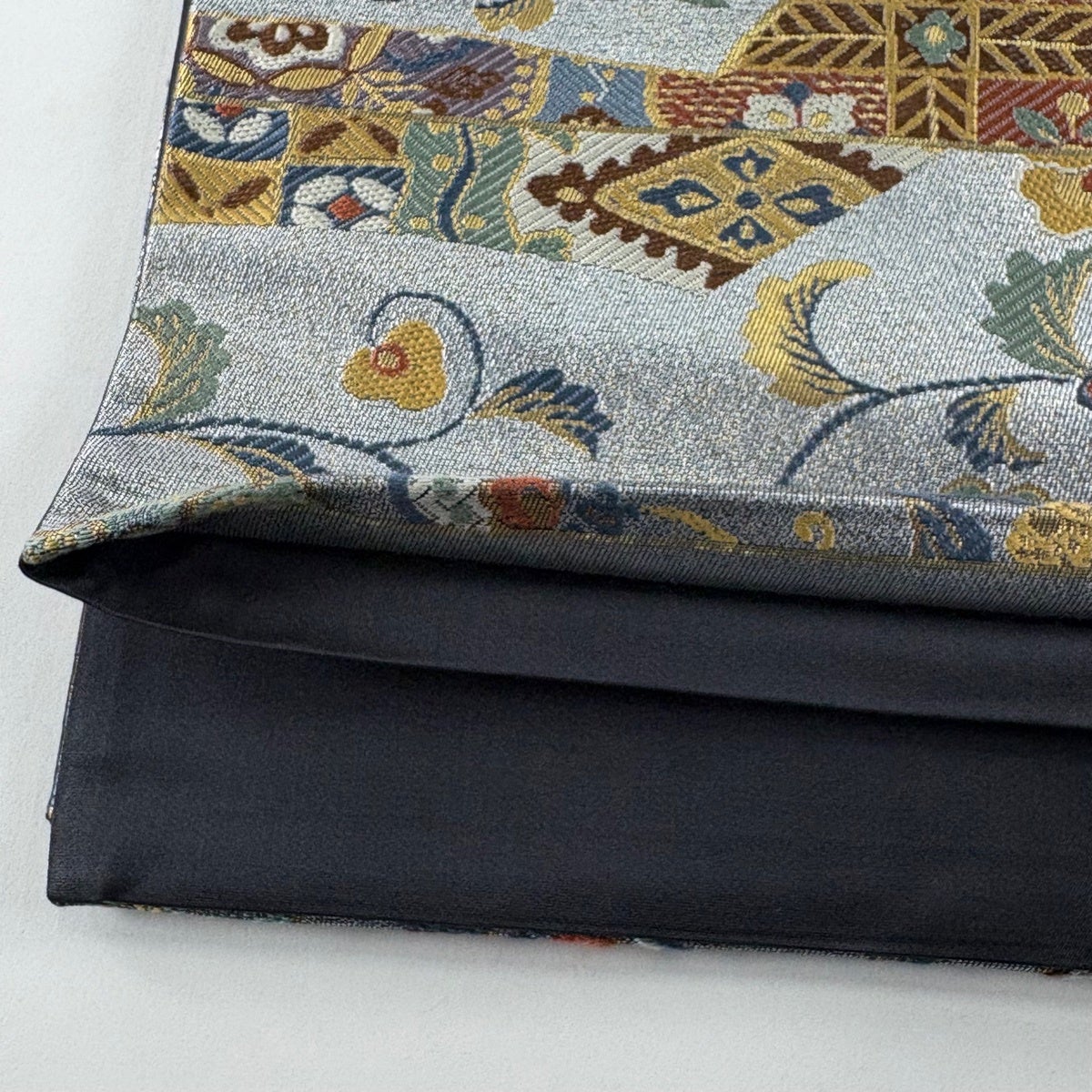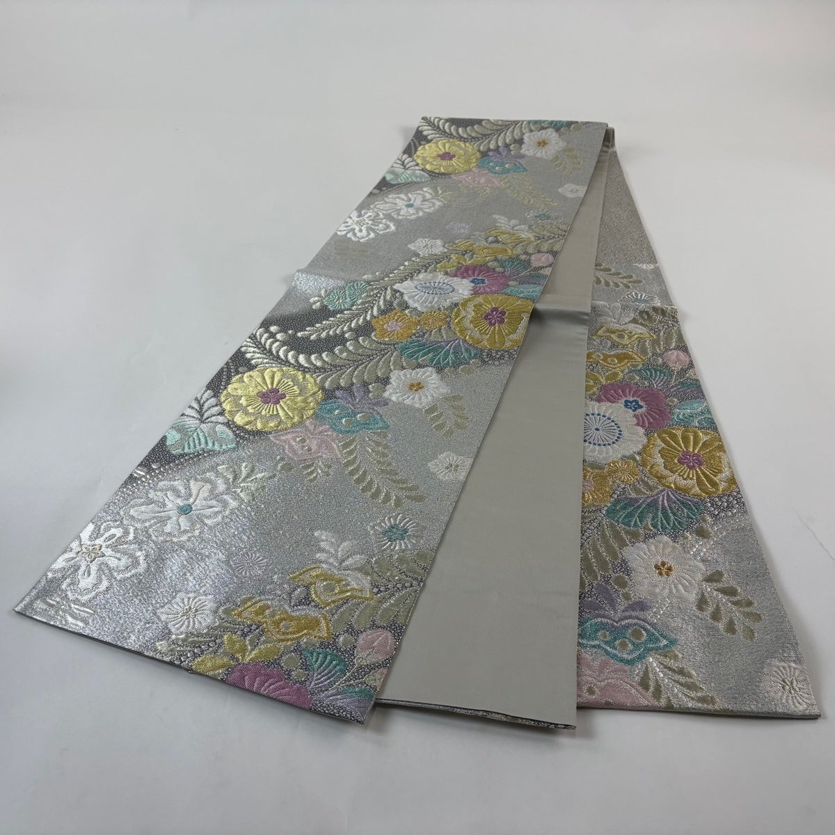 【美品】 袋帯 秀品 秋草 七宝 金糸 箔 灰色 六通 正絹