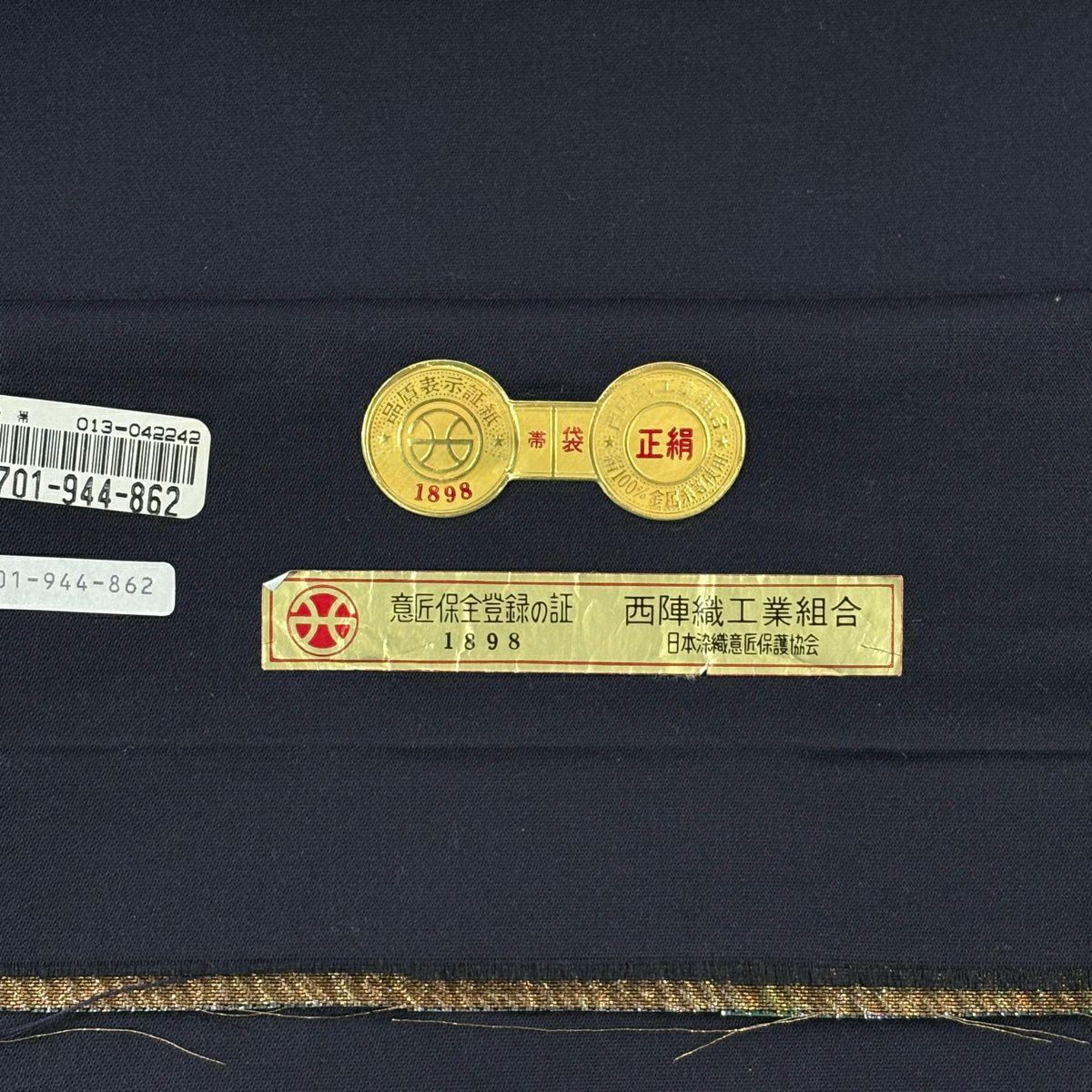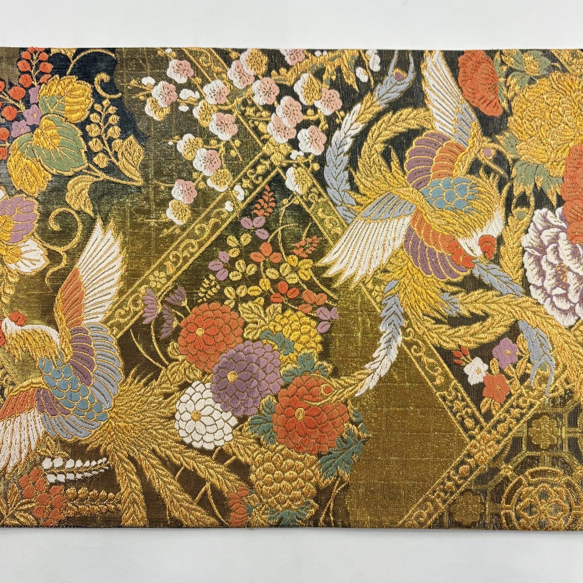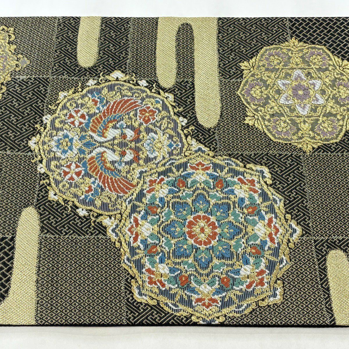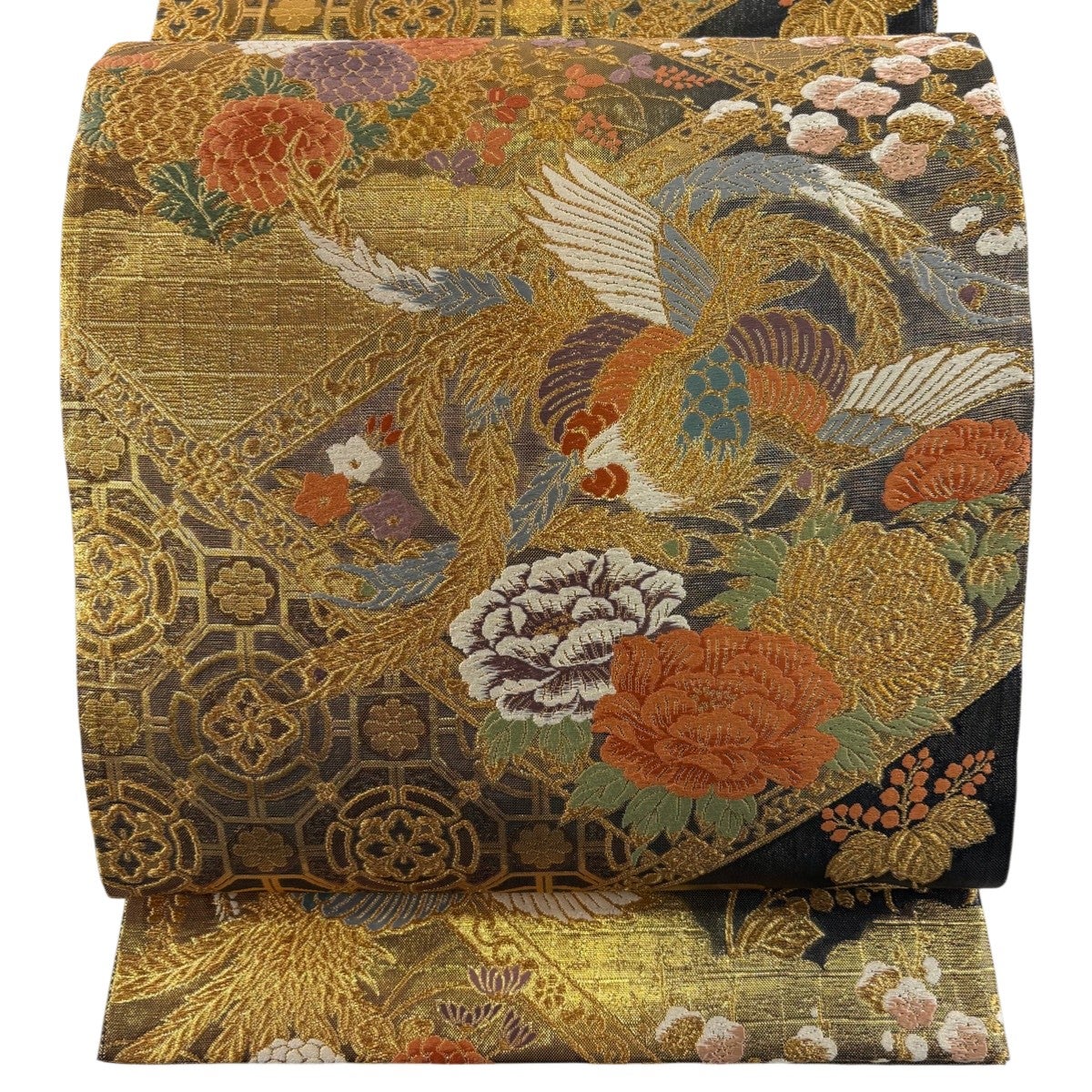 【美品】 袋帯 秀品 華文 向かい鳥 金糸 墨色 六通 正絹