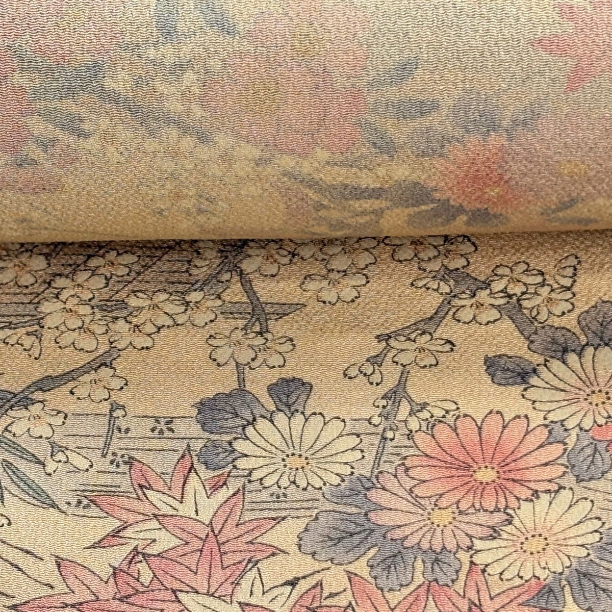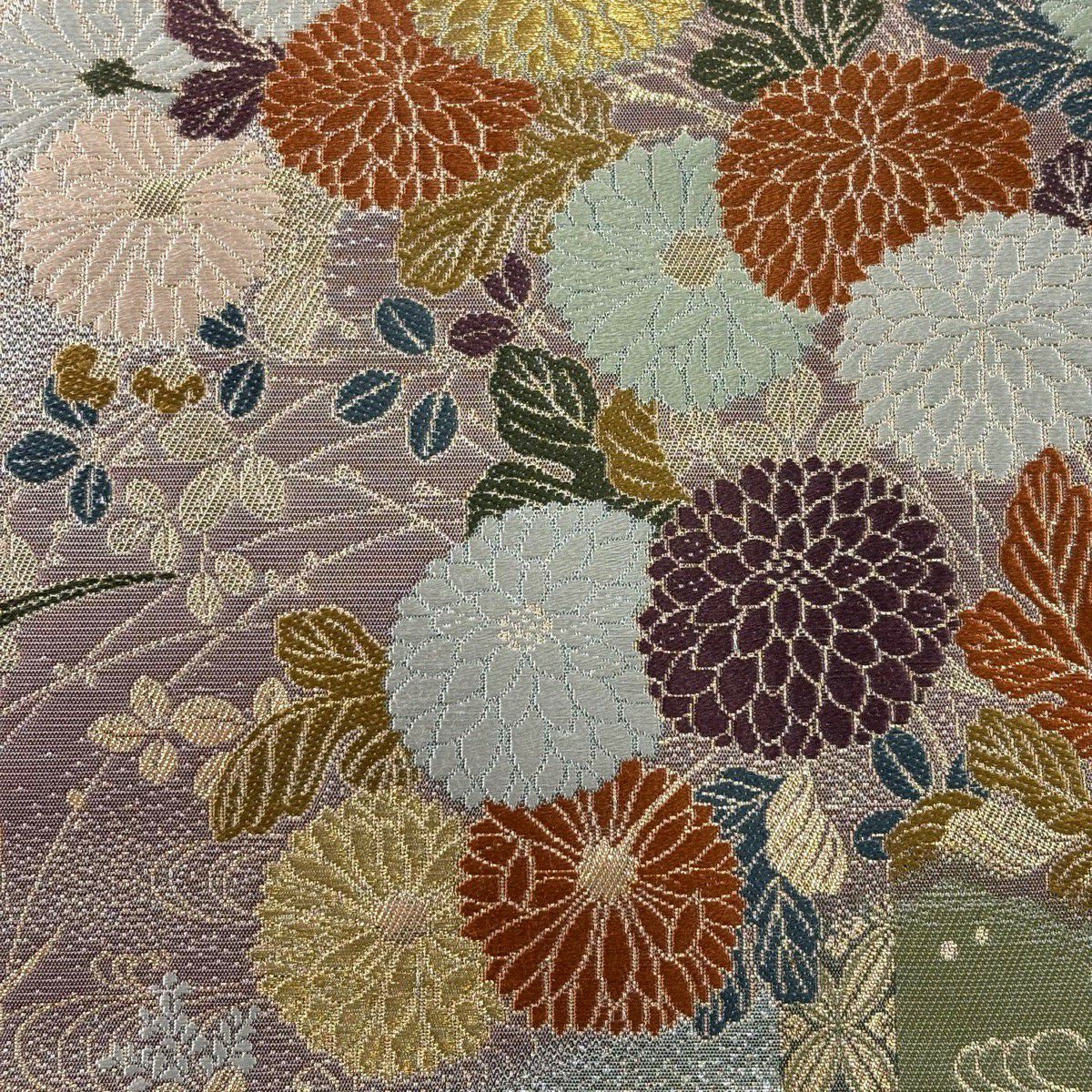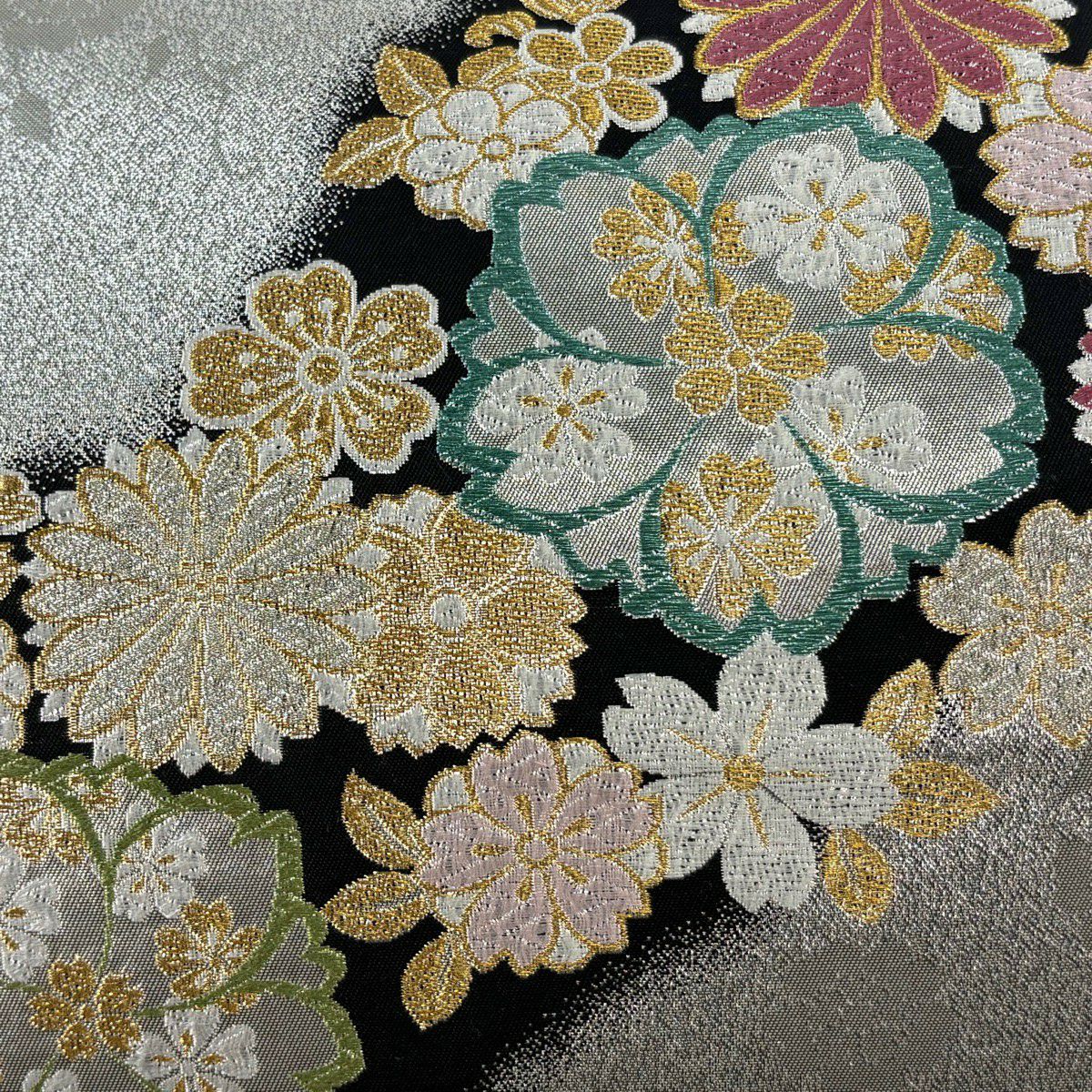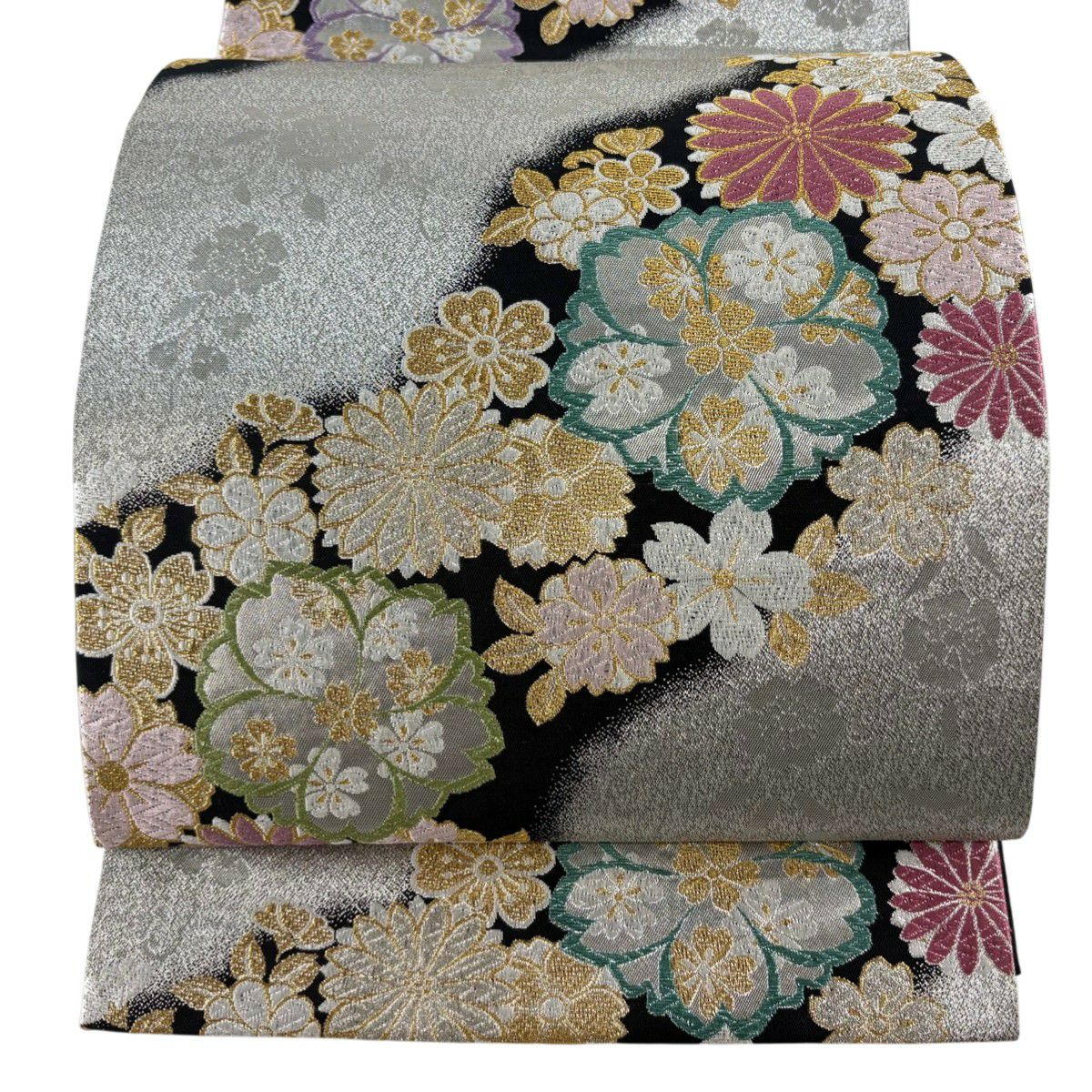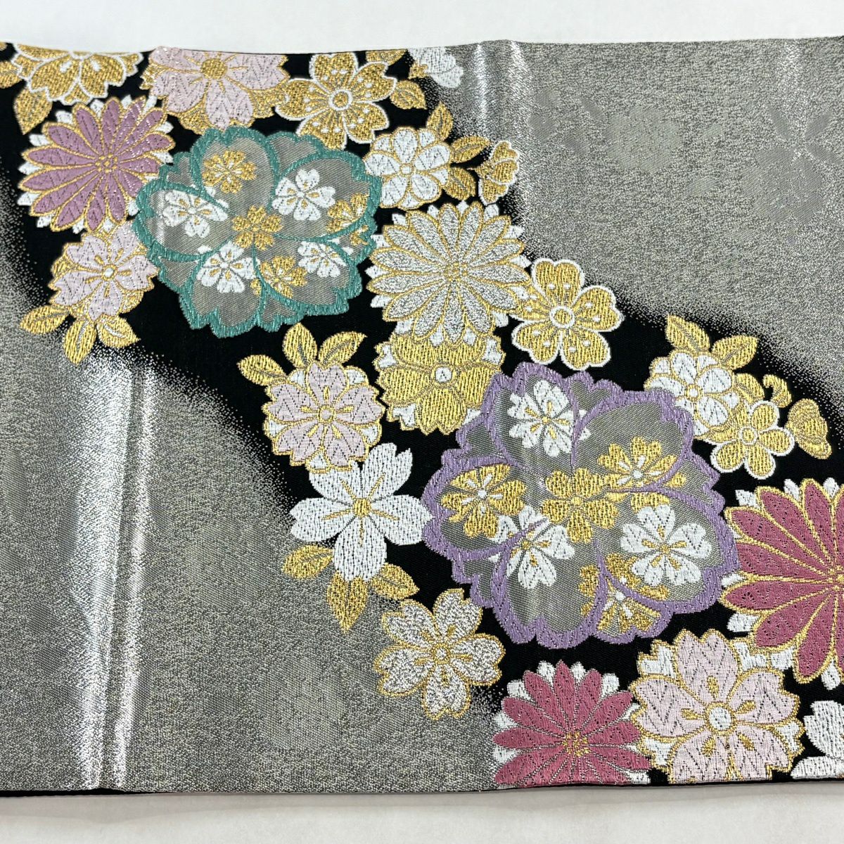 【美品】 袋帯 秀品 菊 桜 金銀糸 唐織 銀色 六通 正絹