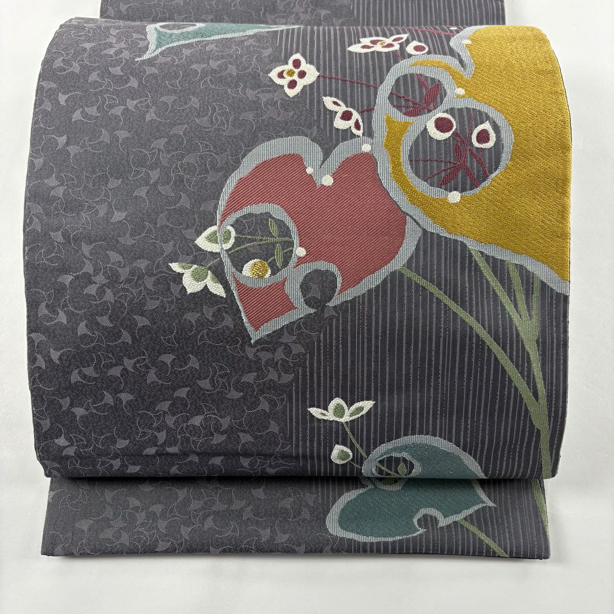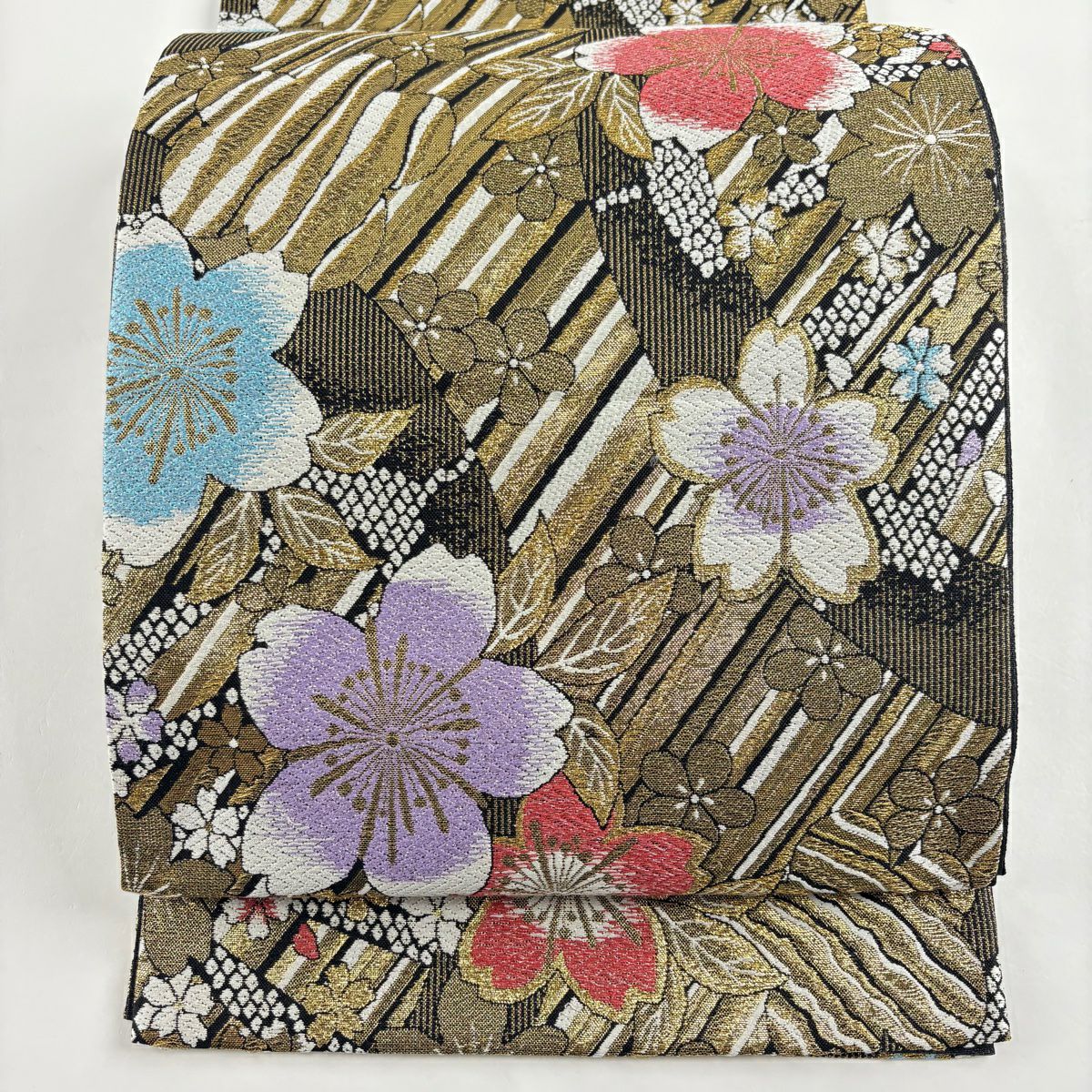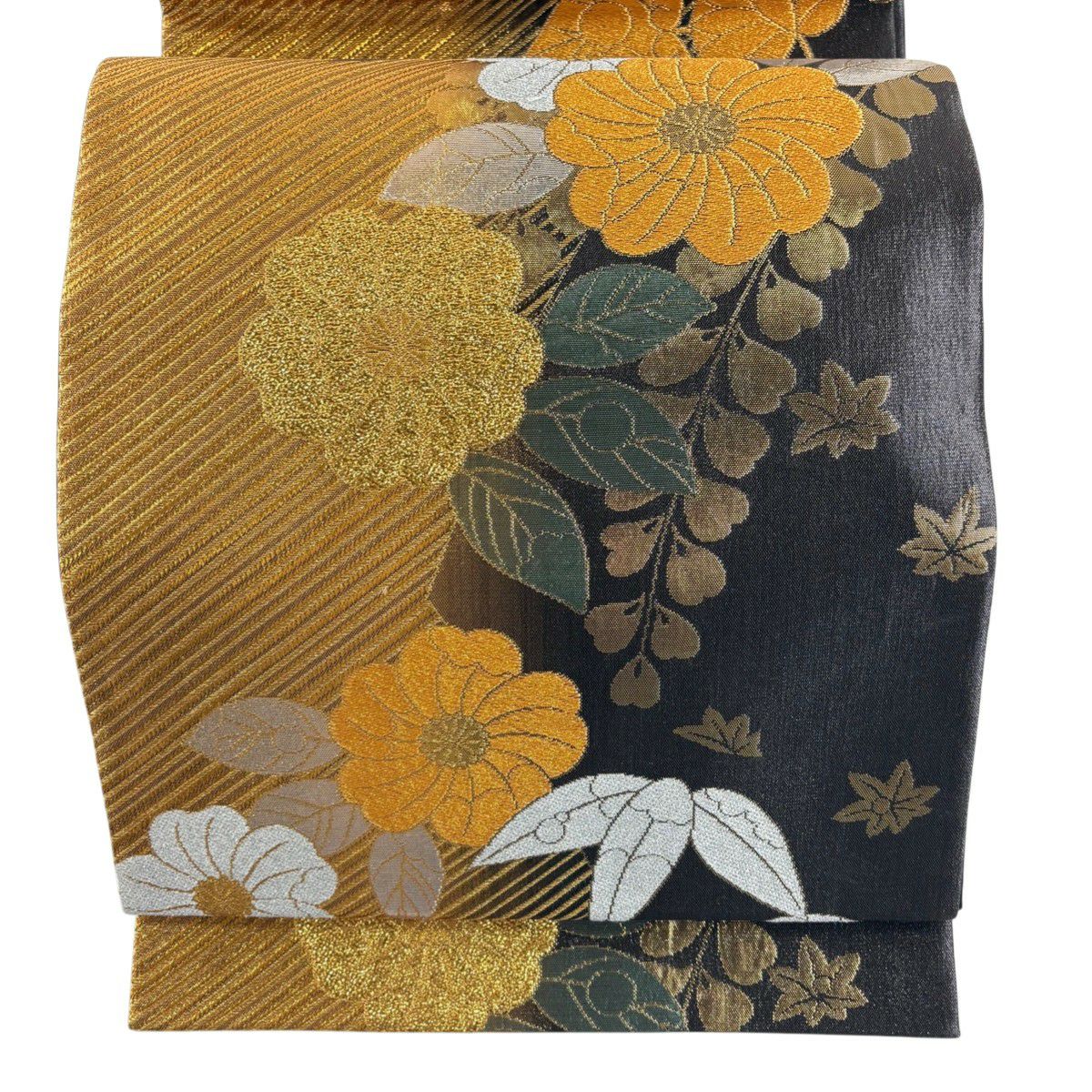 【美品】 袋帯 秀品 草花 斜縞 金糸 箔 墨色 六通 正絹