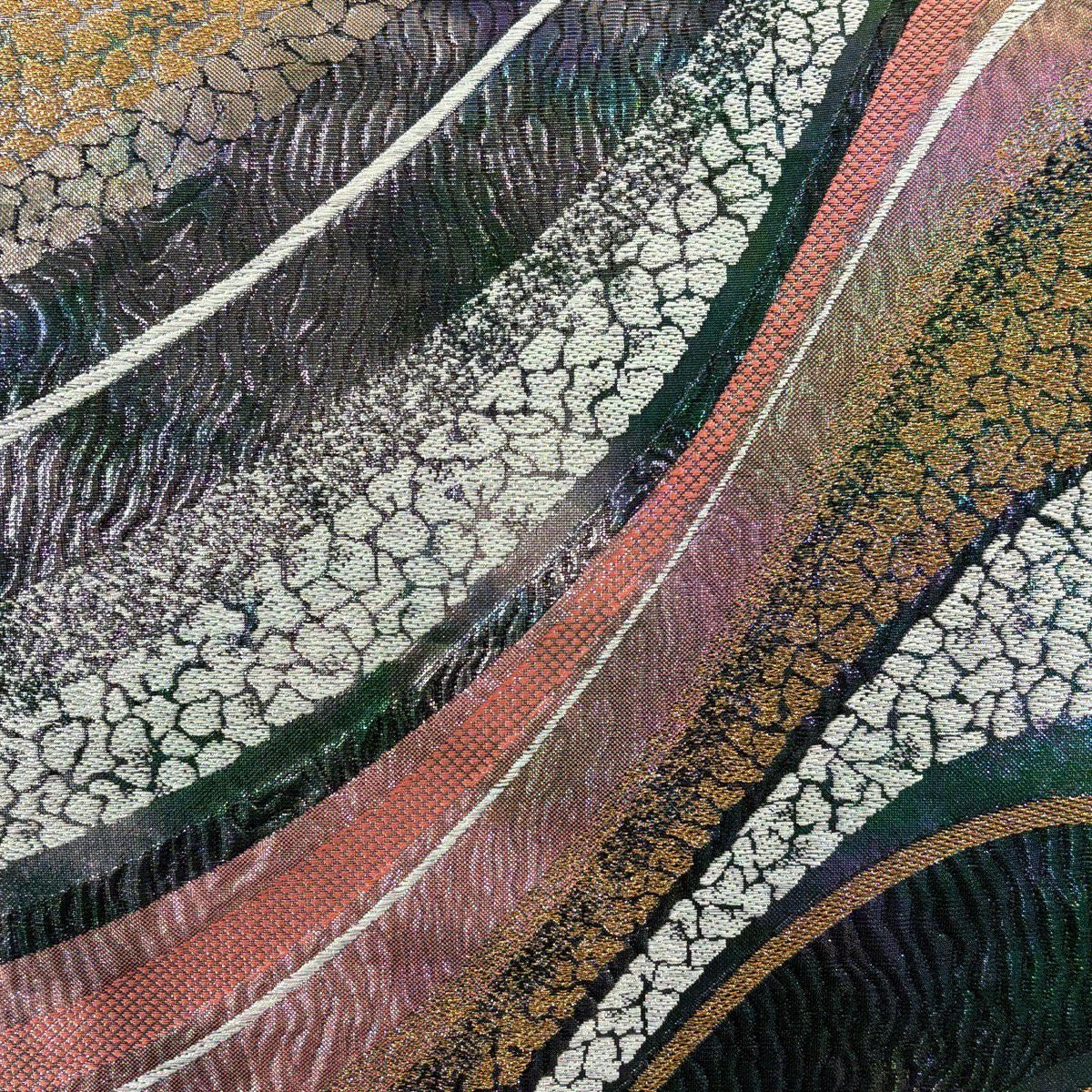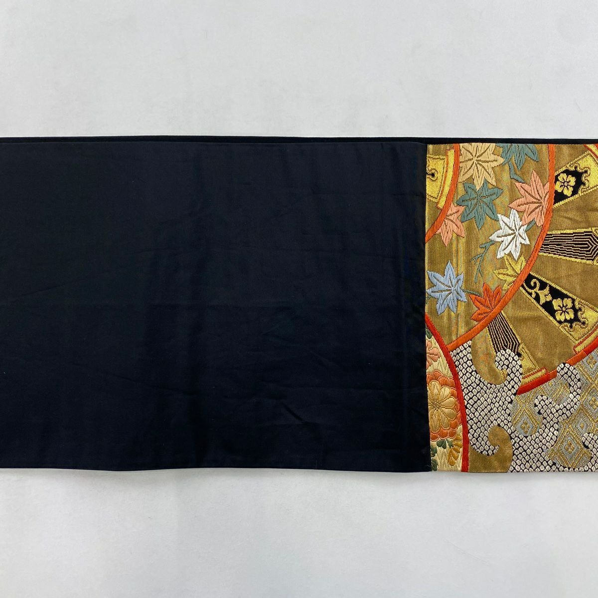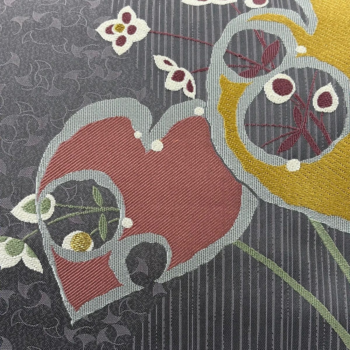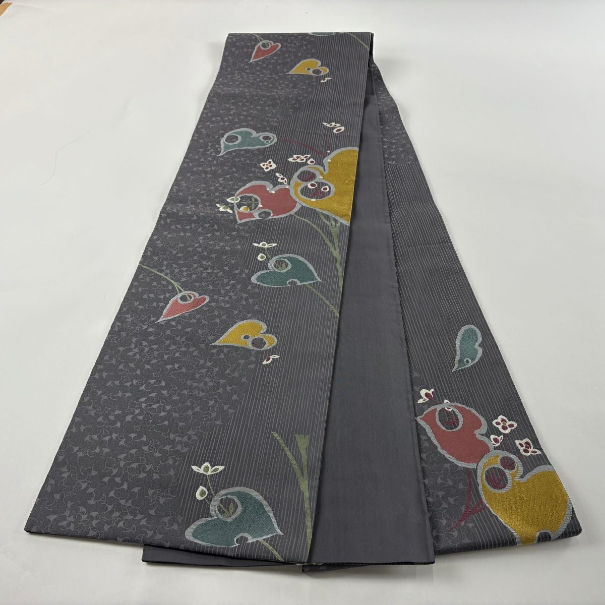 【美品】 袋帯 秀品 草花 斜縞 金糸 箔 墨色 六通 正絹