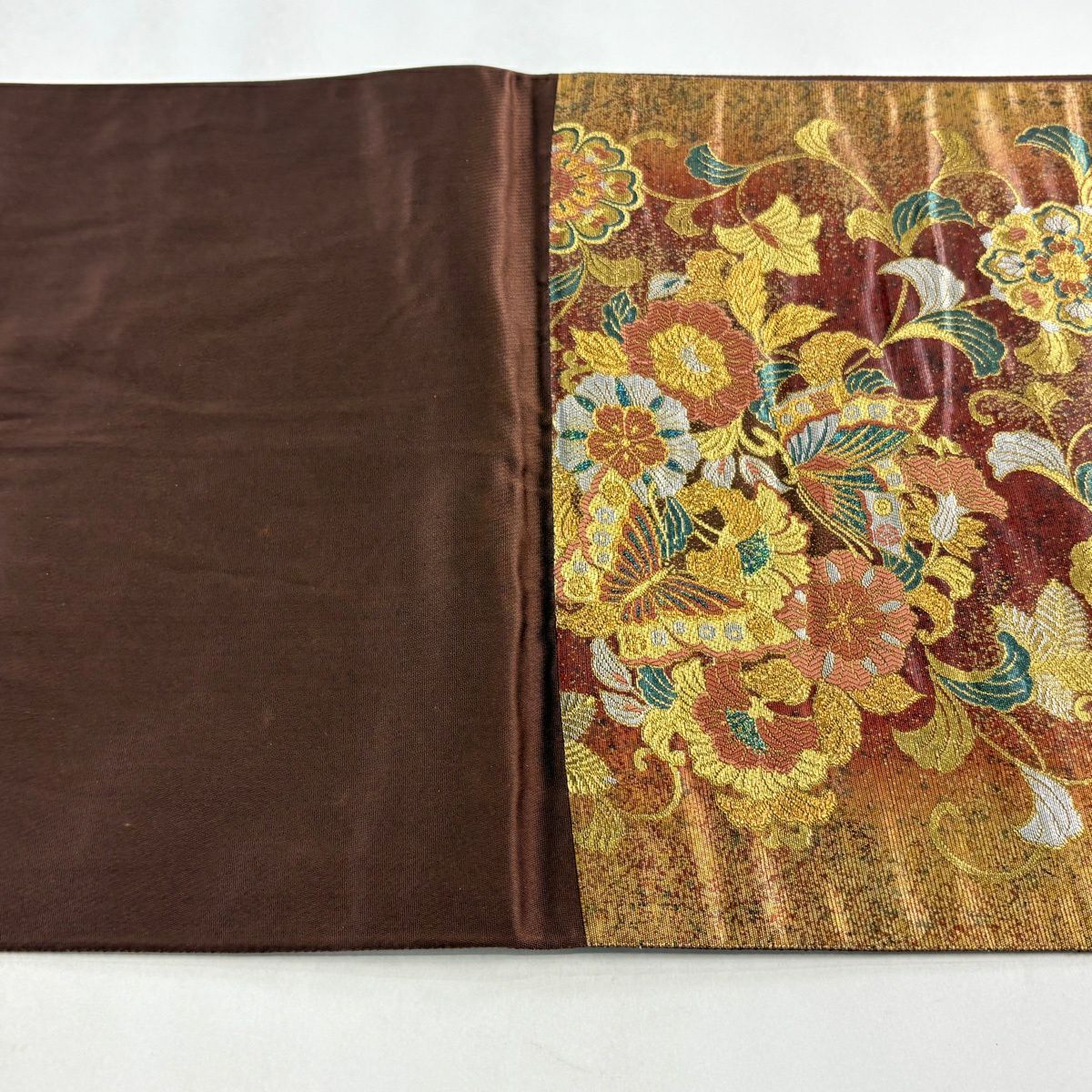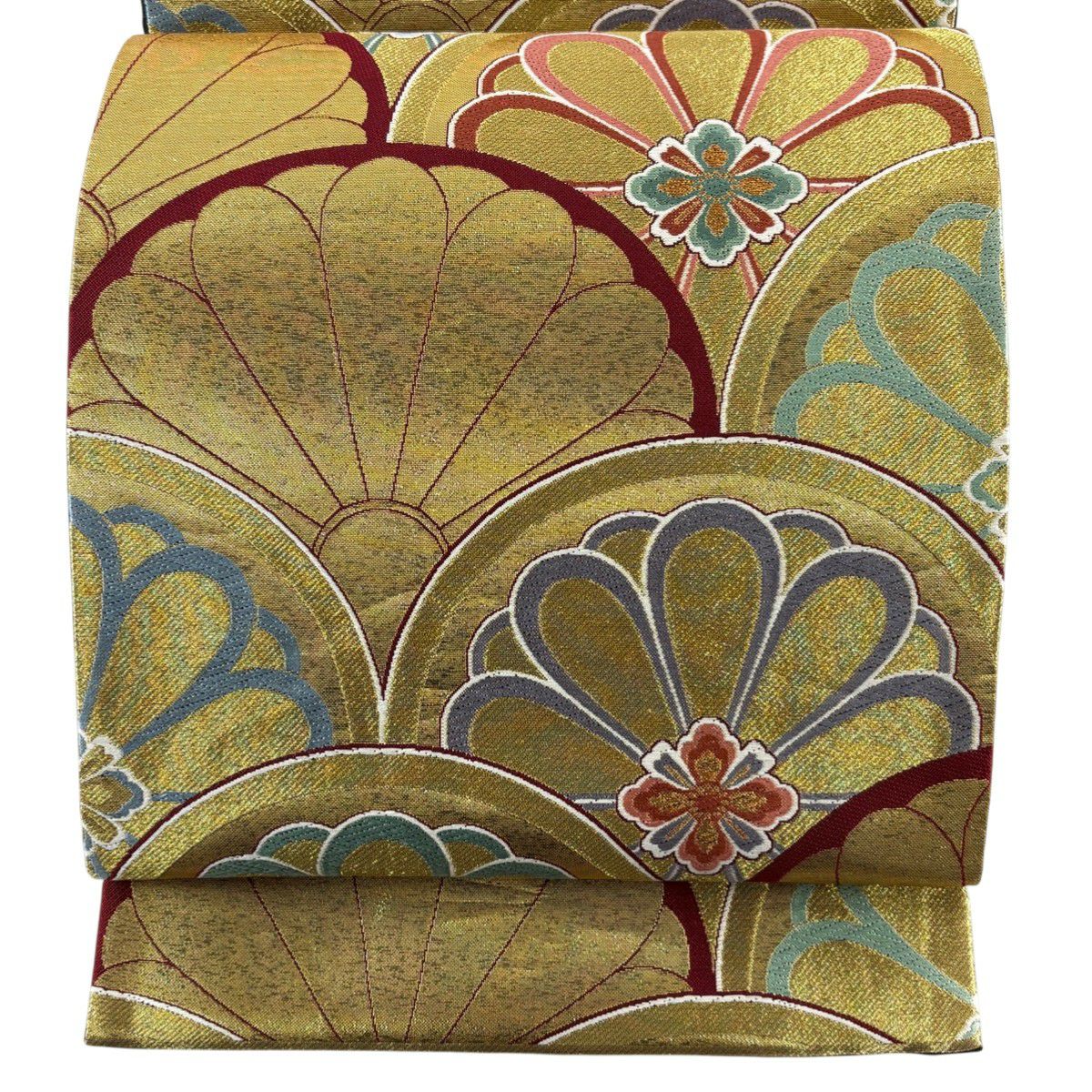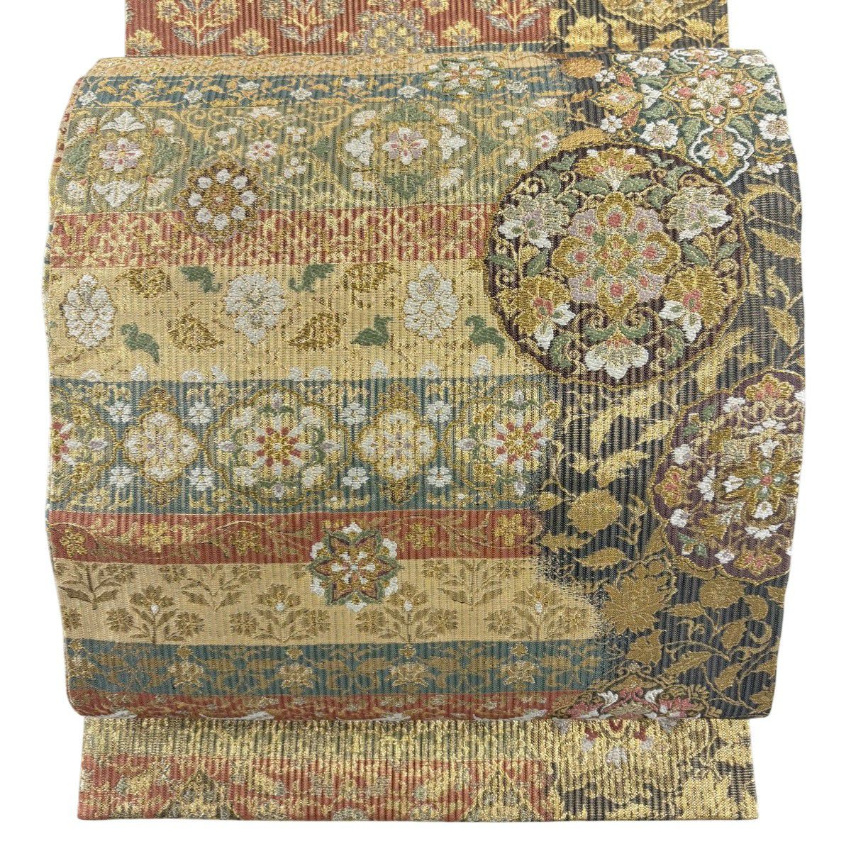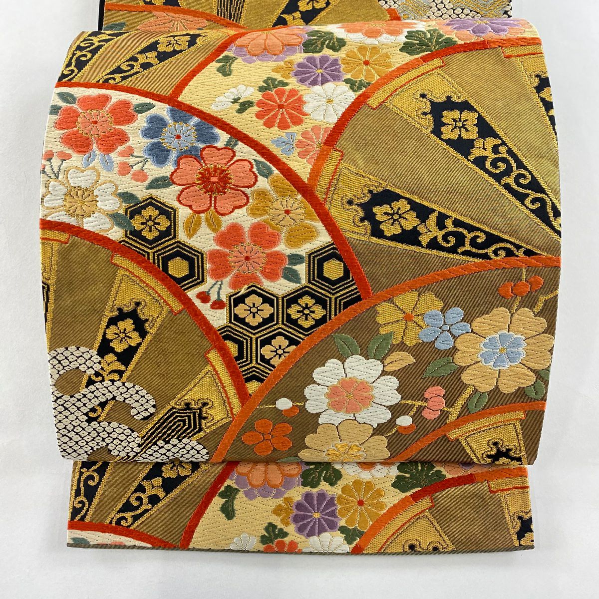 【美品】 袋帯 秀品 華文 花丸文 金糸 箔 金茶 六通 正絹