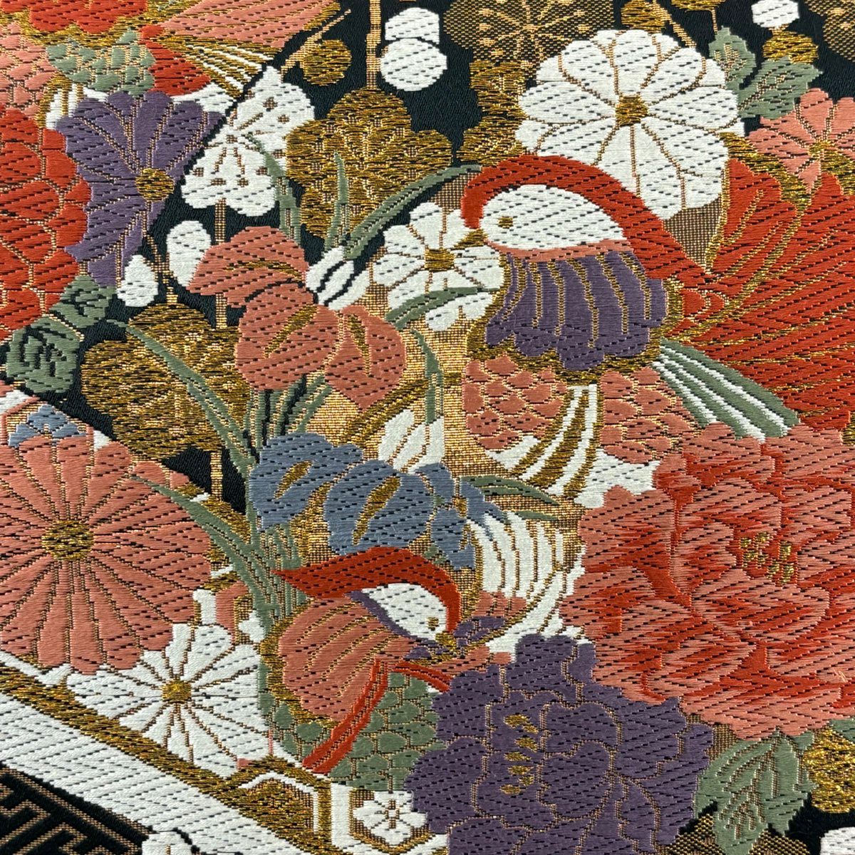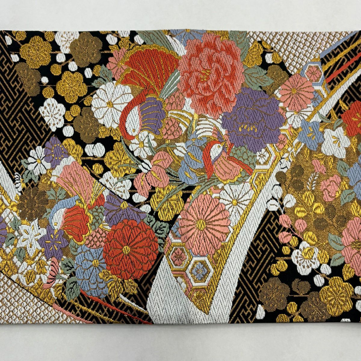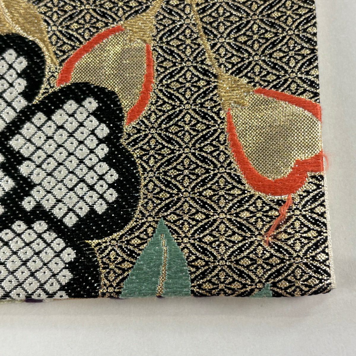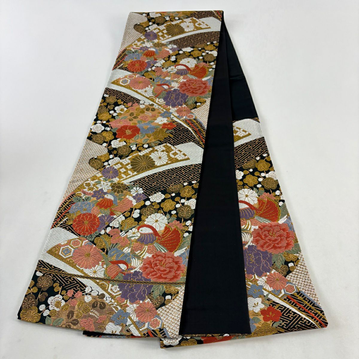 【美品】 袋帯 秀品 鴛鴦 草花 金糸 唐織 黒 六通 正絹