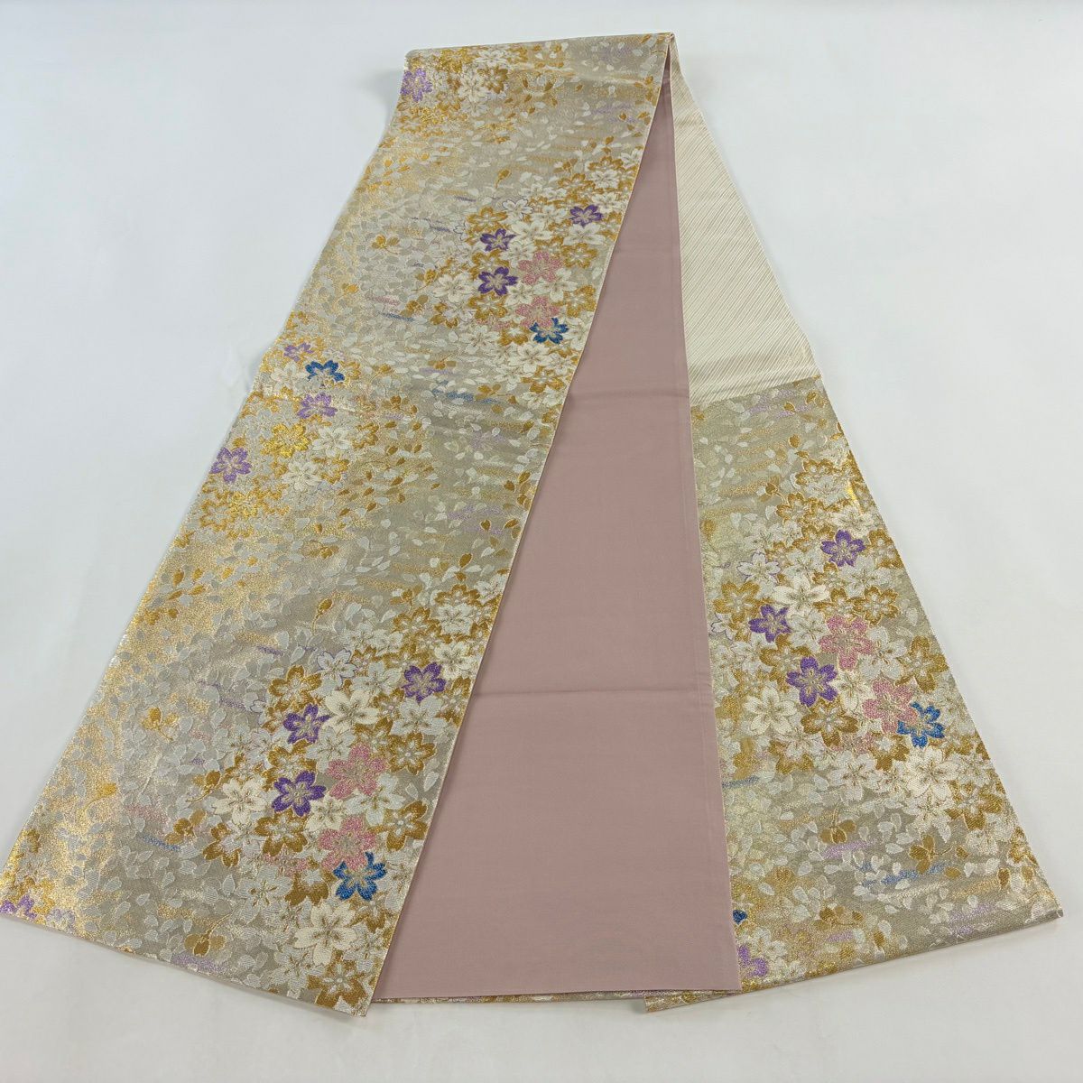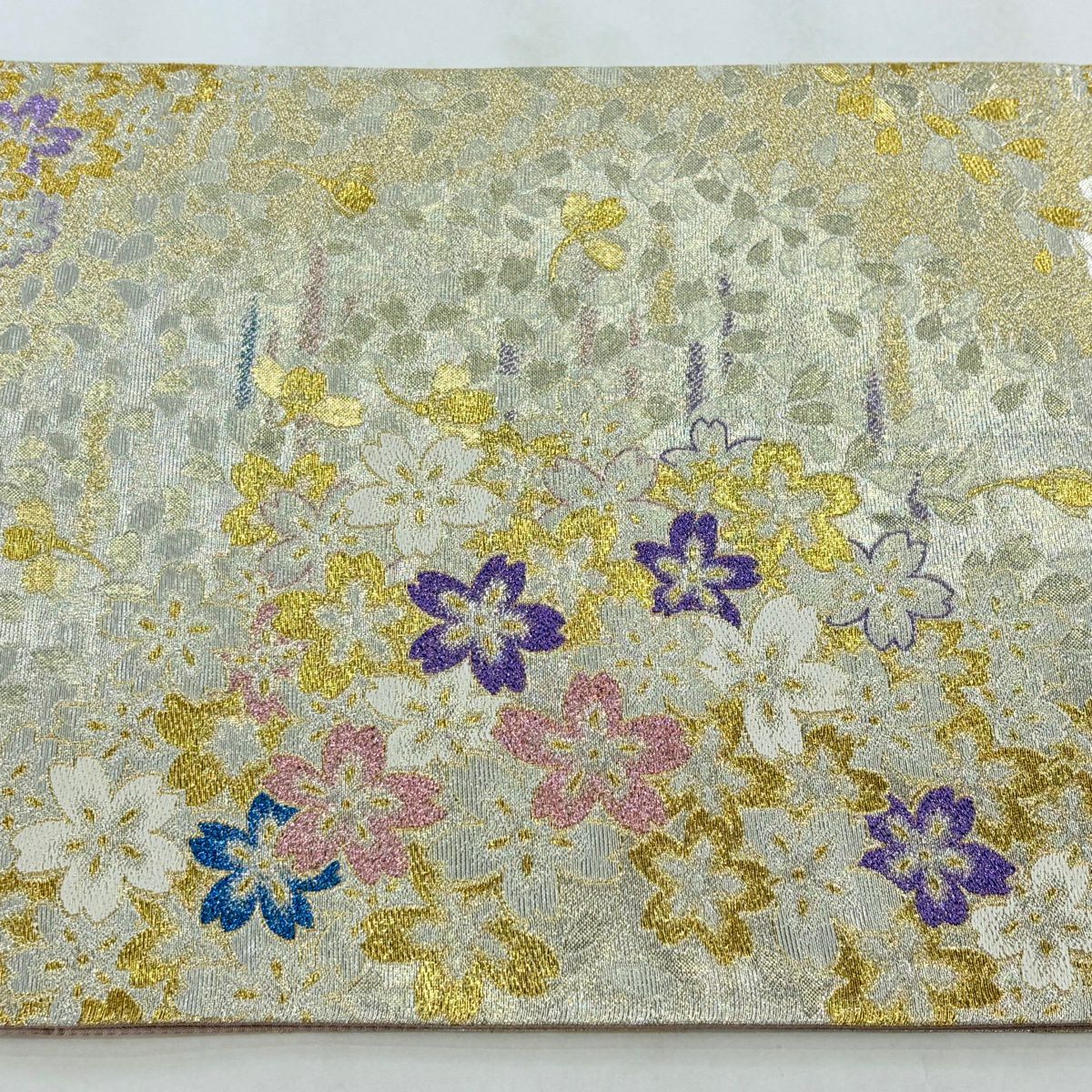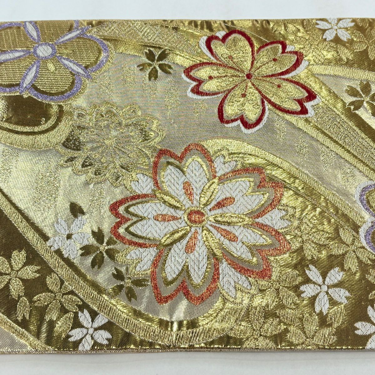 【美品】 袋帯 秀品 振袖向き 桜 金糸 箔 金色 六通 正絹