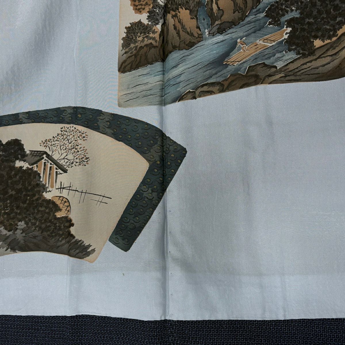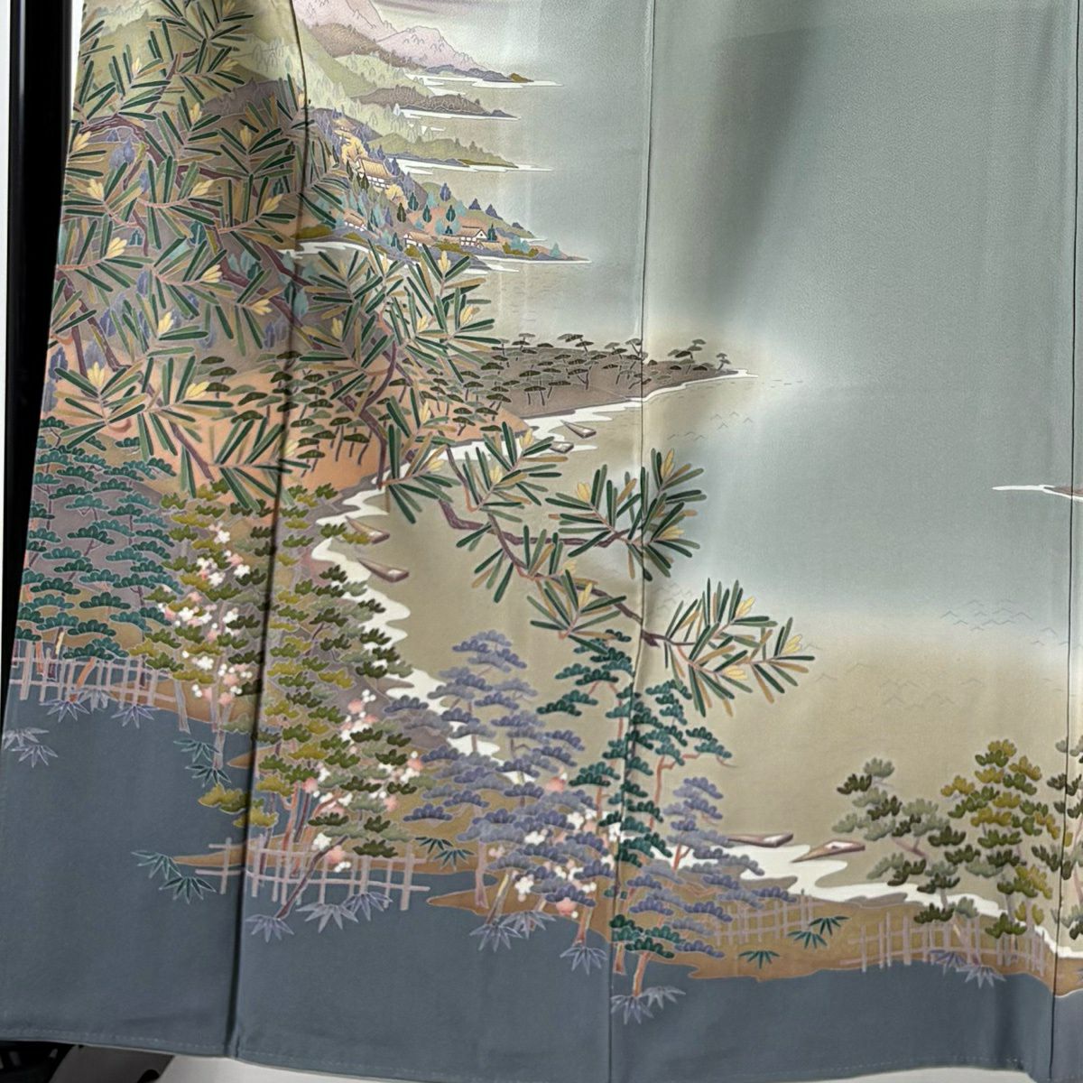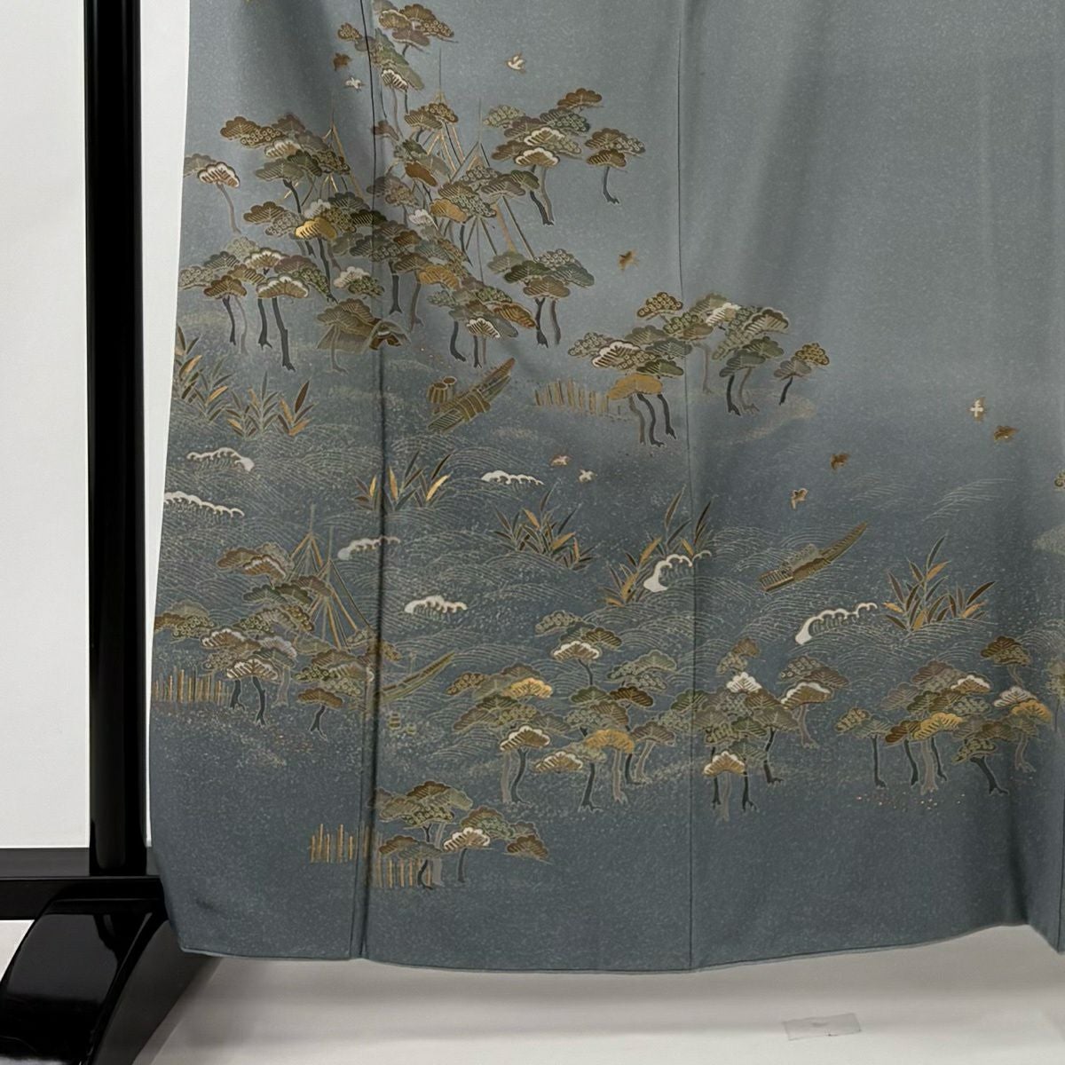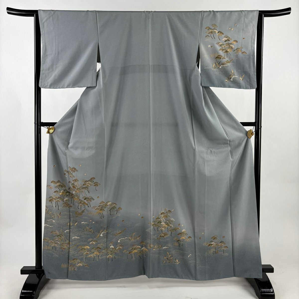 50%OFF 付下げ 身丈152.5cm 裄丈65cm M 袷 琵琶 桧扇 刺繍 ぼかし 青灰色 正絹 秀品 一つ紋 K50