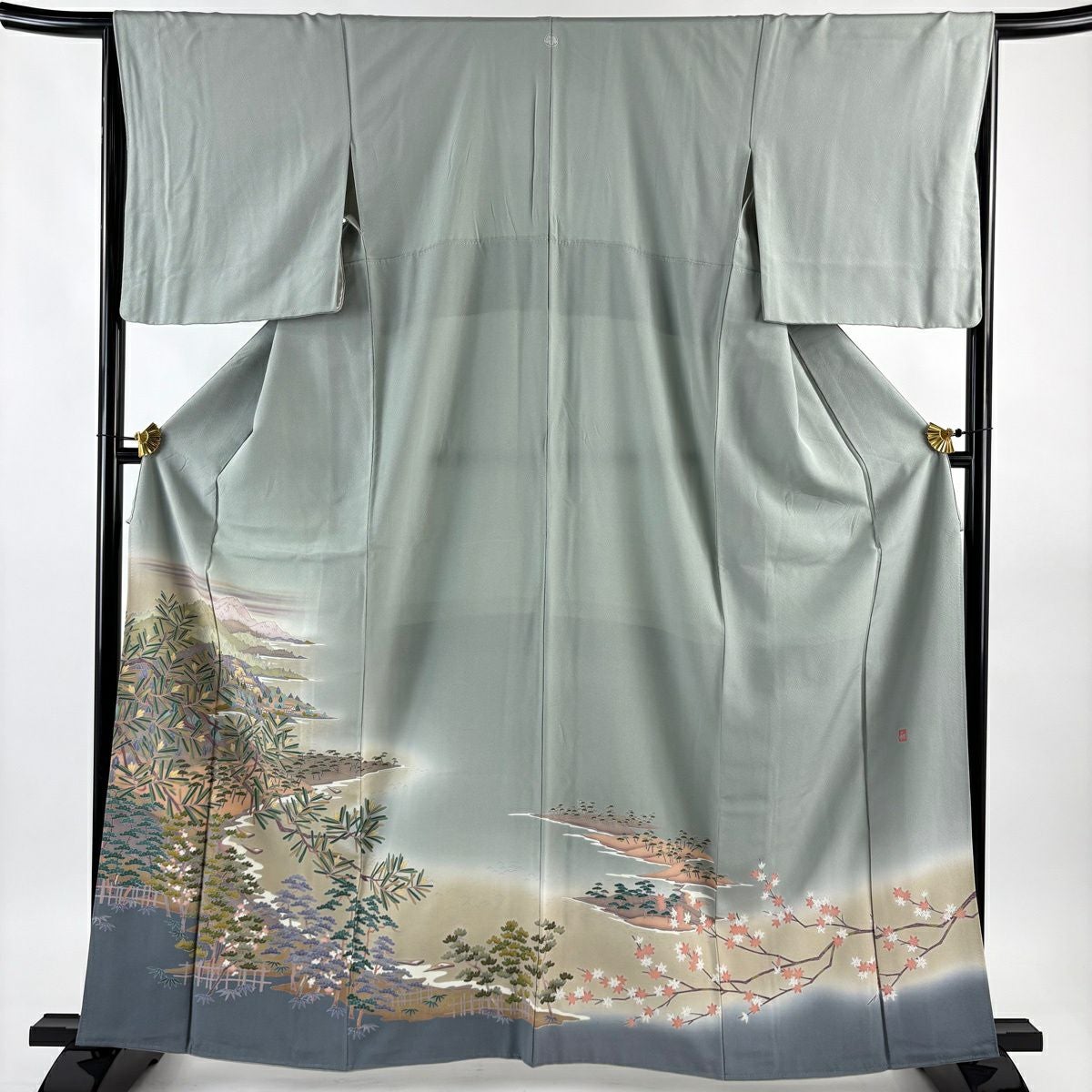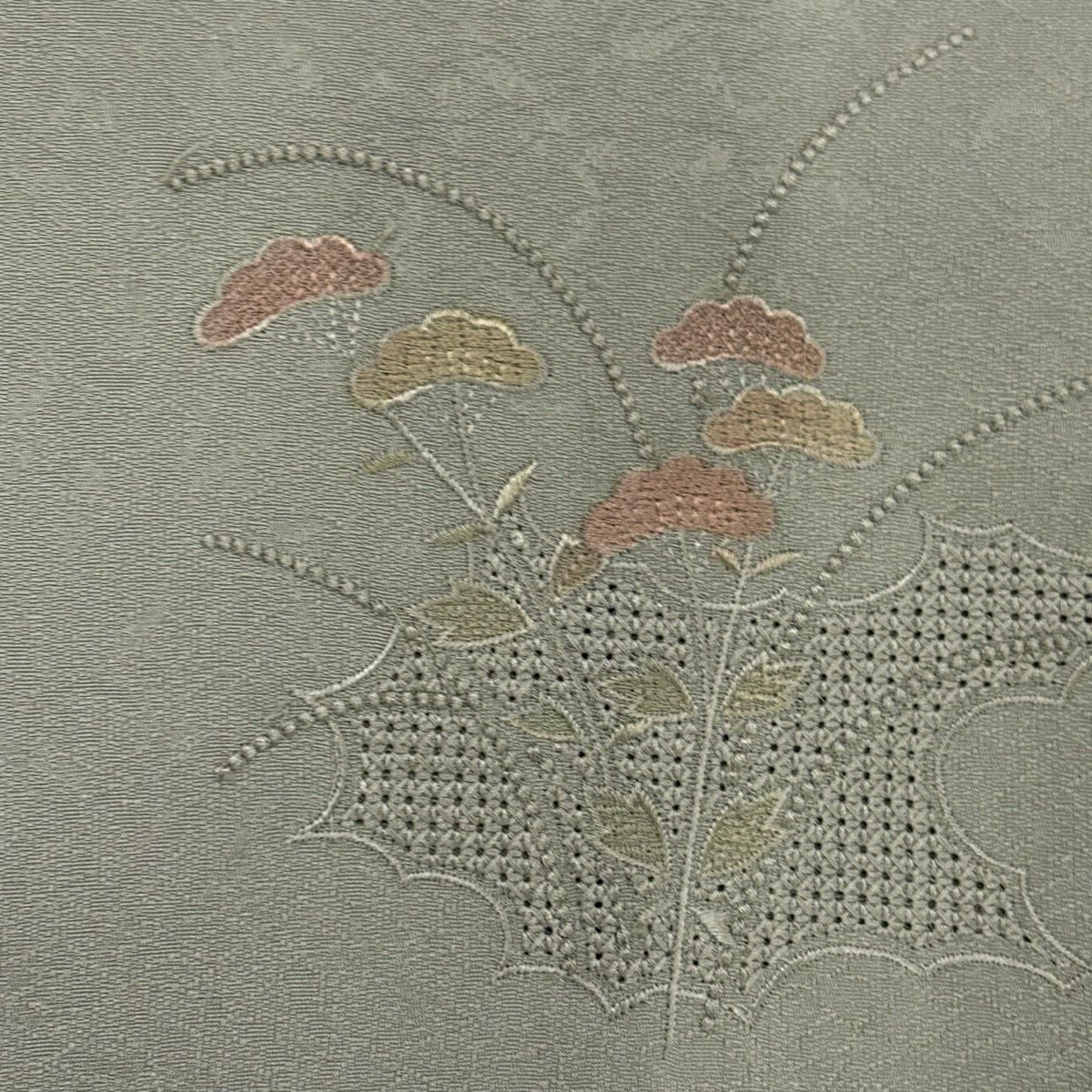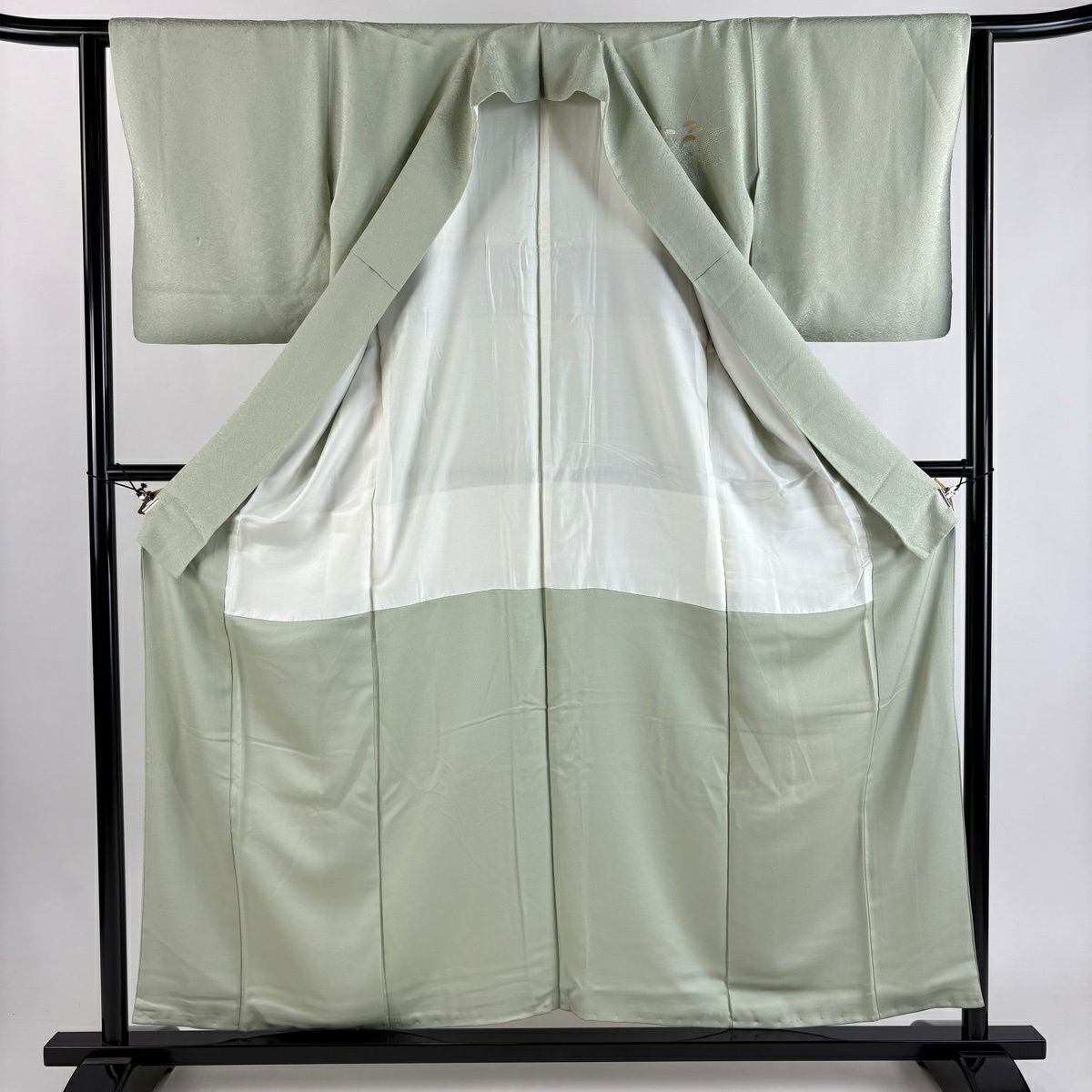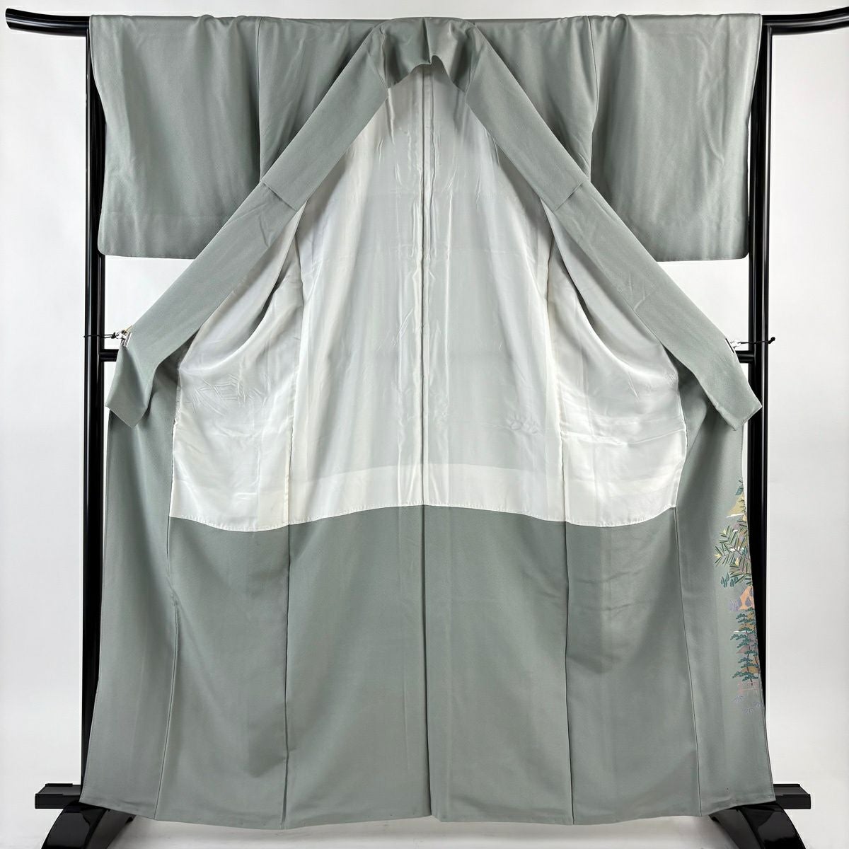 50%OFF 訪問着 身丈163cm 裄丈66cm M 袷 紬地 落款あり 草花 短冊 箔 刺繍 灰緑 正絹 秀品 K50