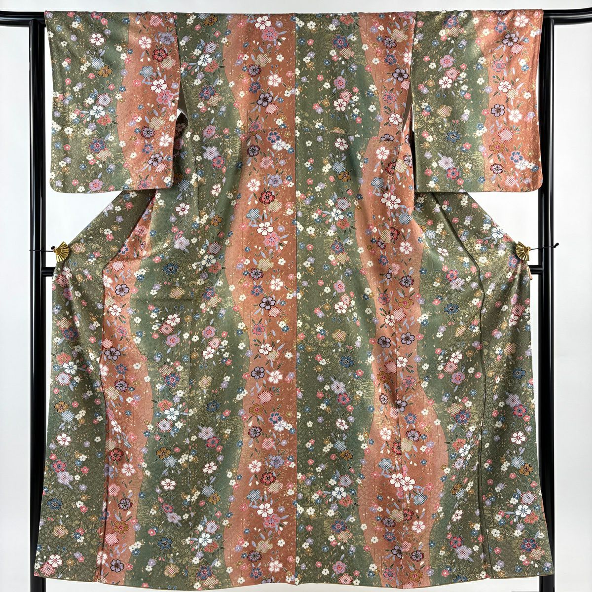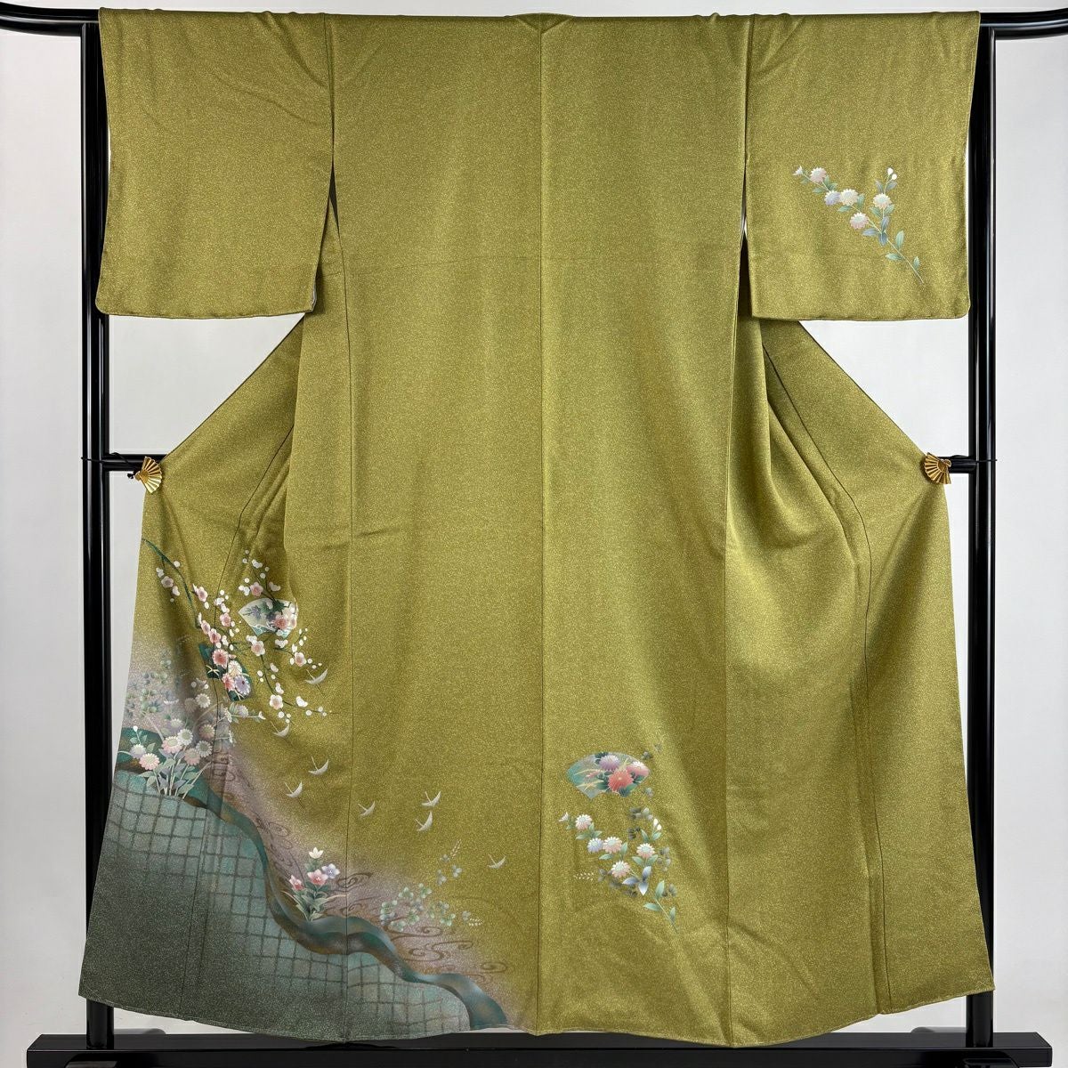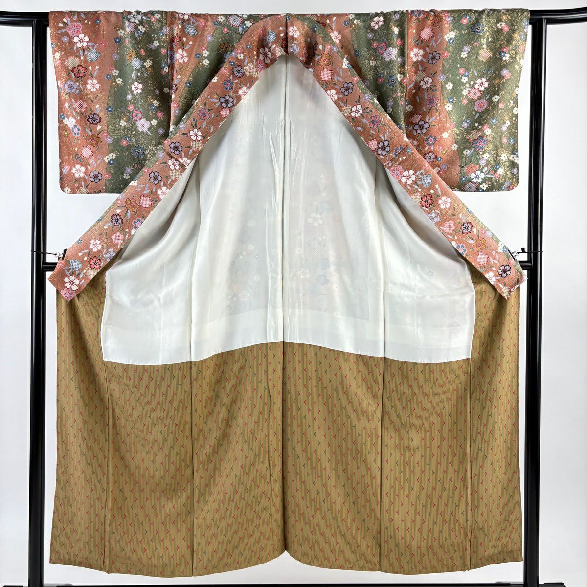 50%OFF 訪問着 身丈155.5cm 裄丈65cm M 袷 道長取 花鳥 金通し 金彩 茶緑色 正絹 秀品 一つ紋 K50