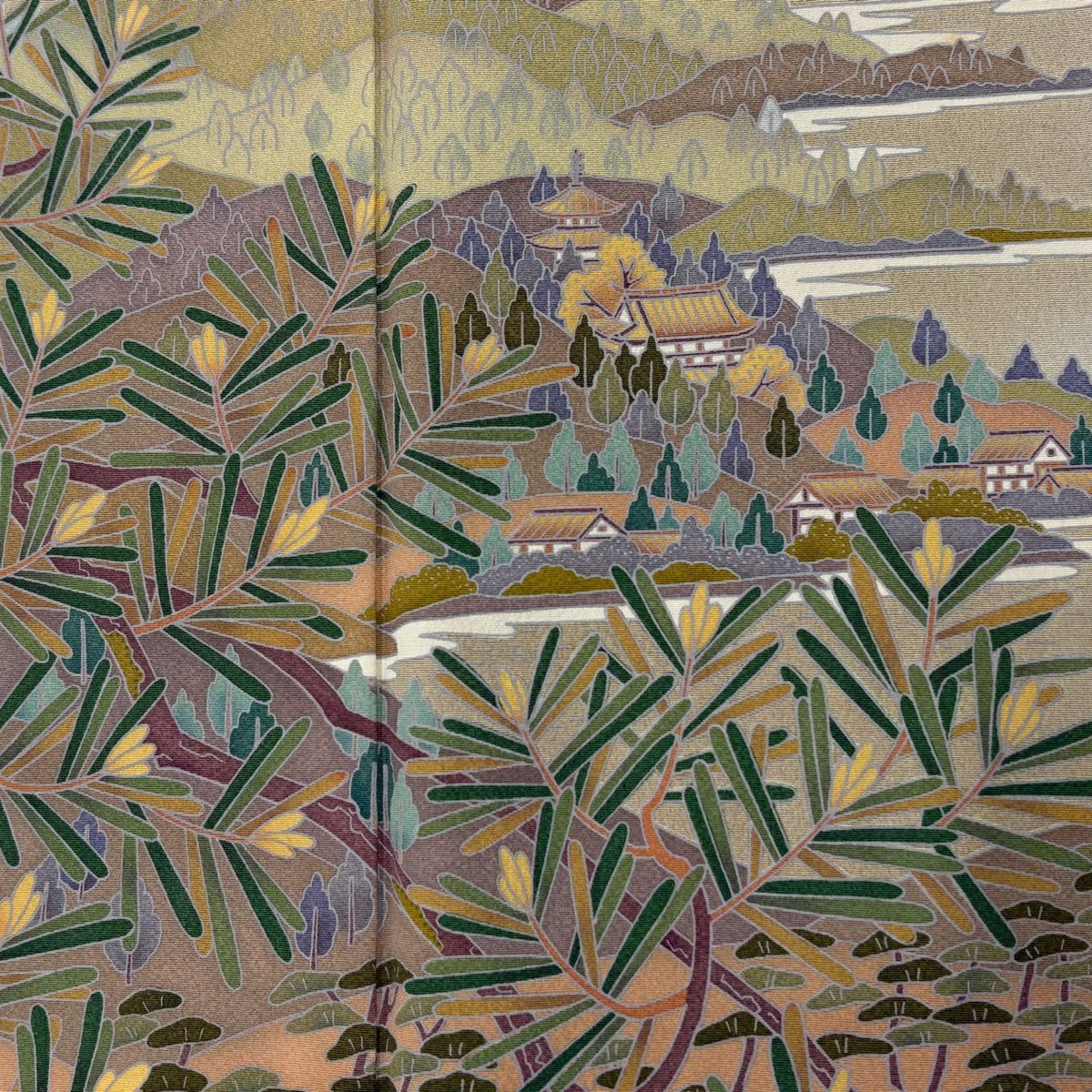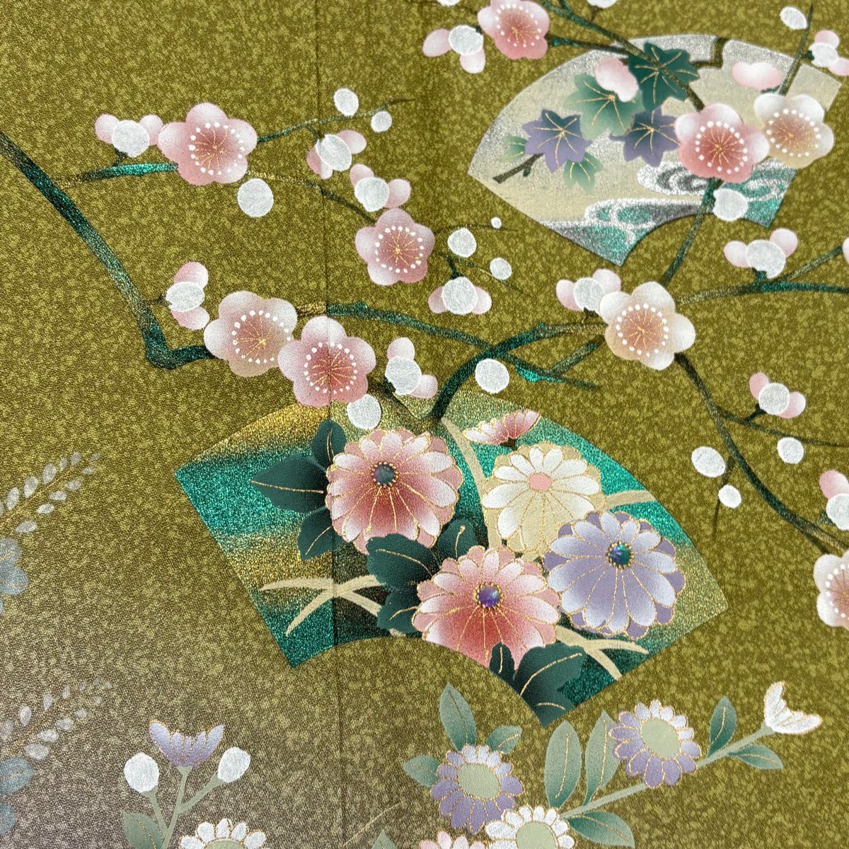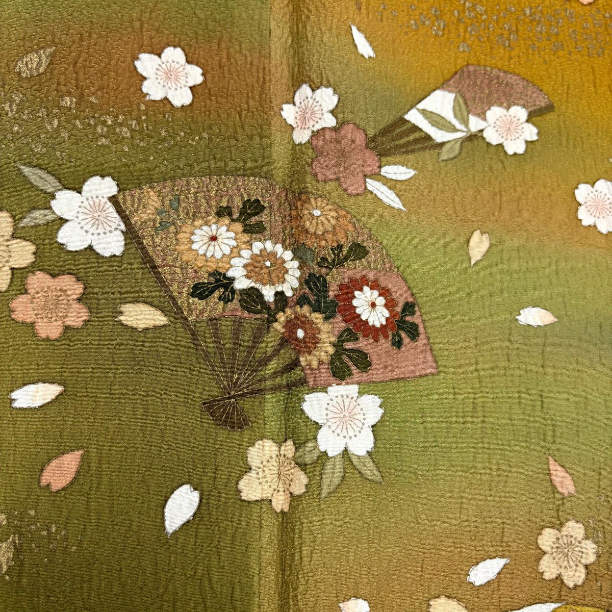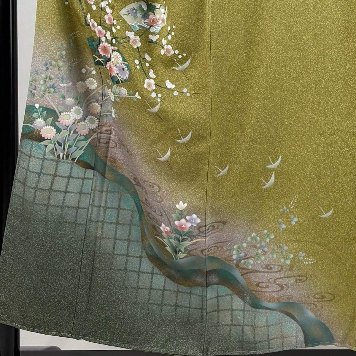 50%OFF 訪問着 身丈155.5cm 裄丈65cm M 袷 道長取 花鳥 金通し 金彩 茶緑色 正絹 秀品 一つ紋 K50