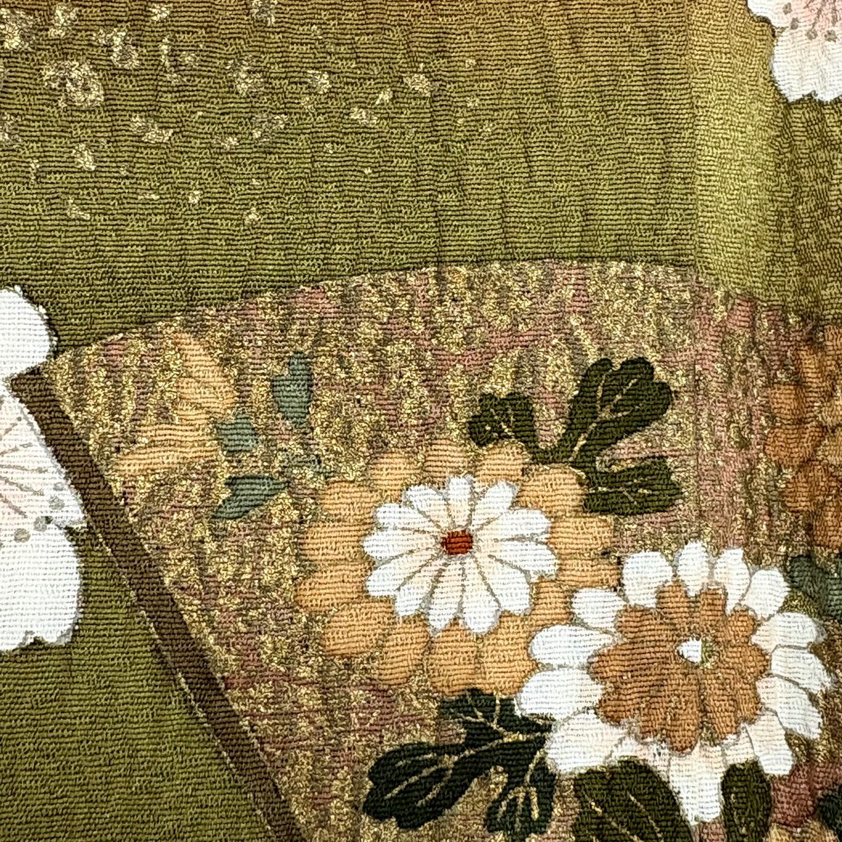 50%OFF 【美品】 訪問着 身丈158.5cm 裄丈62cm S 袷 菊 間垣 金彩 絞り 抹茶色 正絹 秀品 K50
