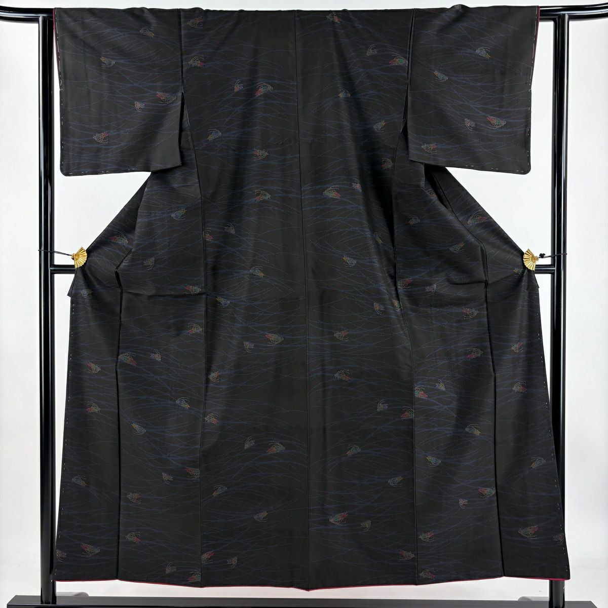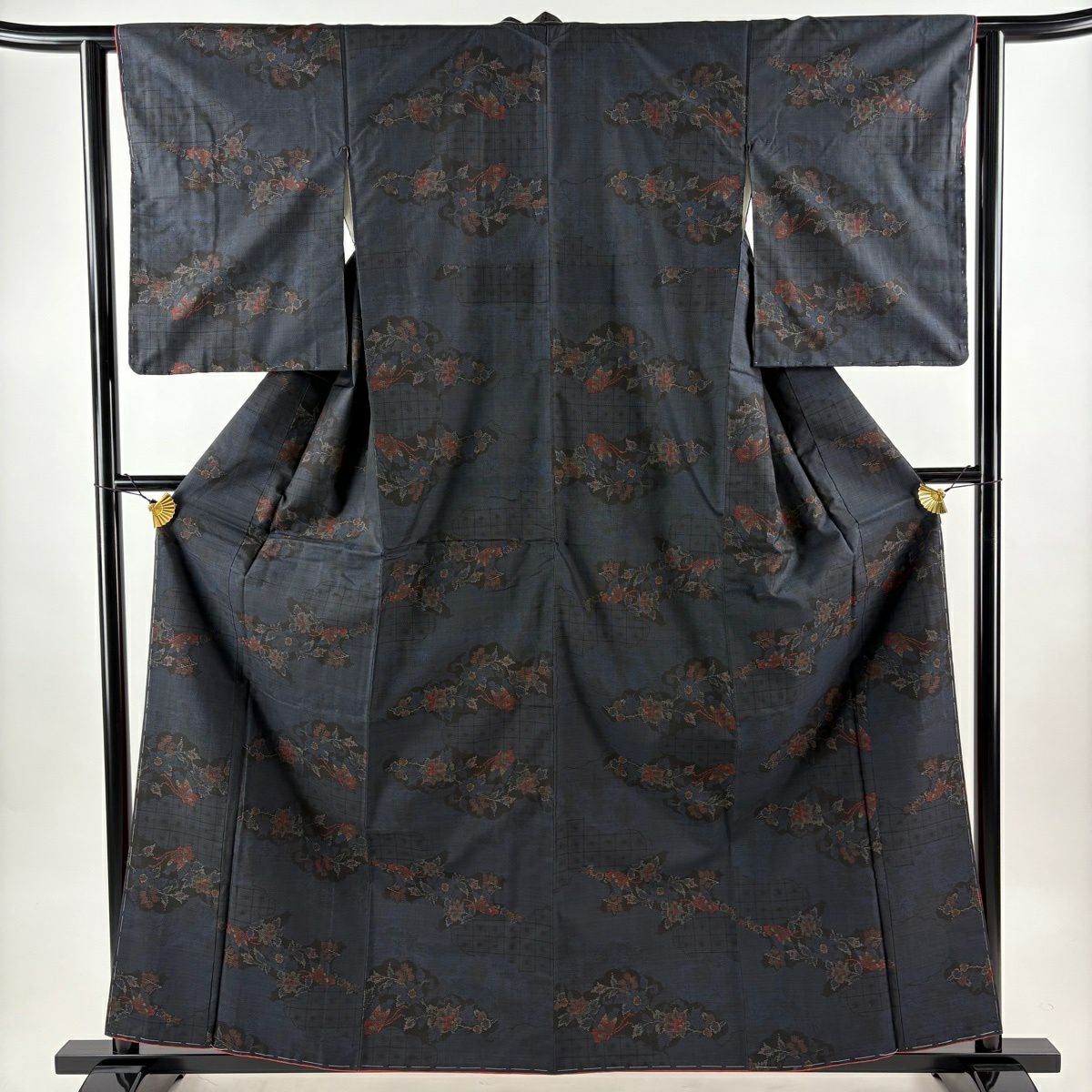 【最終値引き】 76%OFF 紬 身丈152.5cm 裄丈61.5cm S 袷 葉柄 バッタ 墨色 正絹 美品 秀品 K70