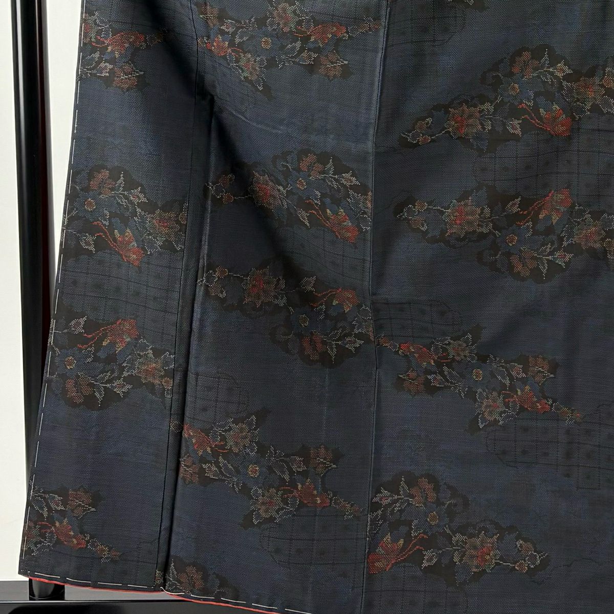 【在庫一掃】 小紋 身丈155.5cm 裄丈63cm S 袷 梶山伸 落款あり 梅 葉柄 金糸 青灰色 正絹 秀品 一つ紋