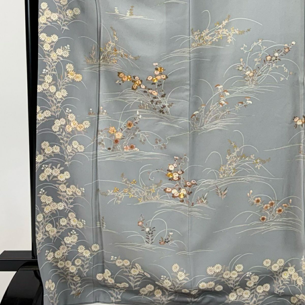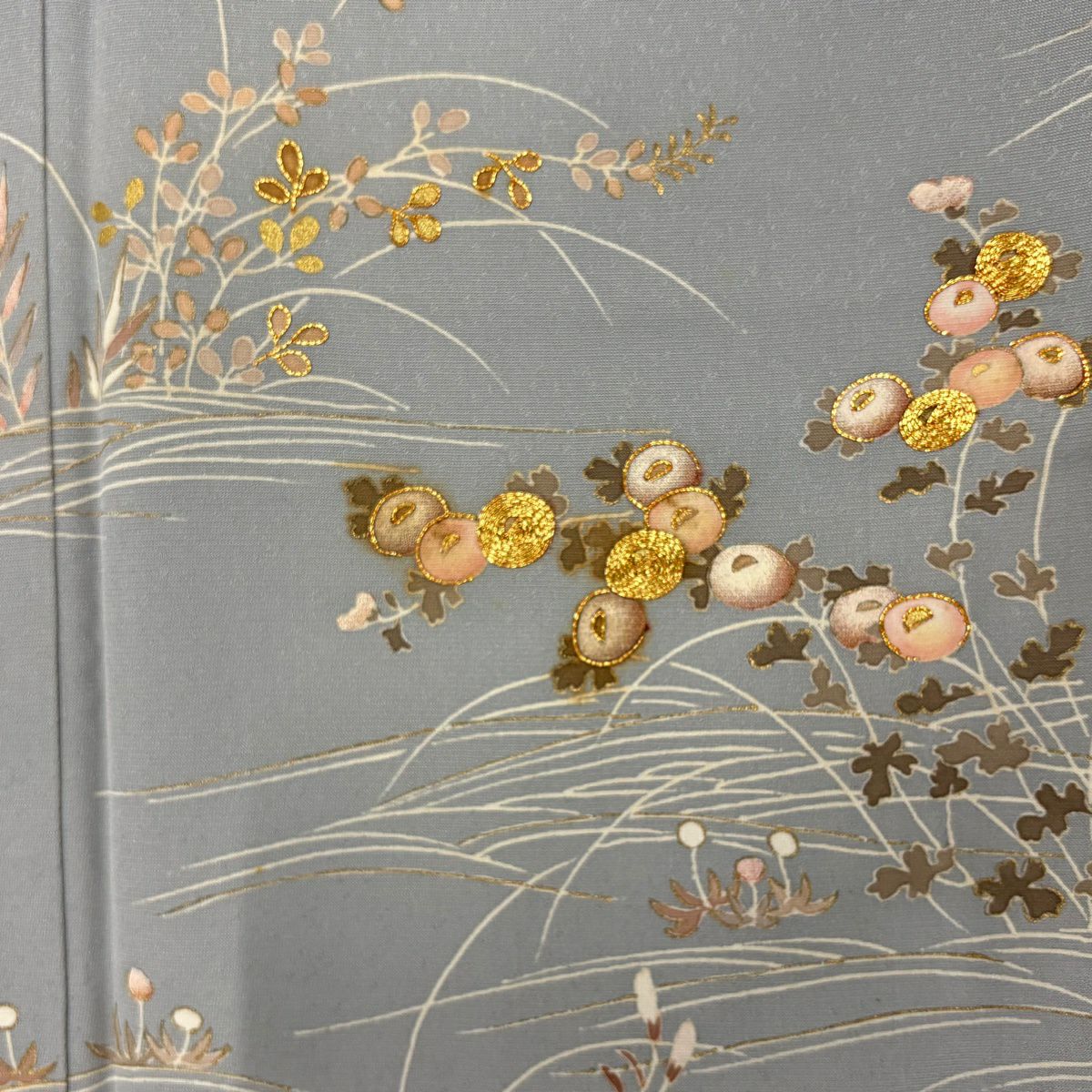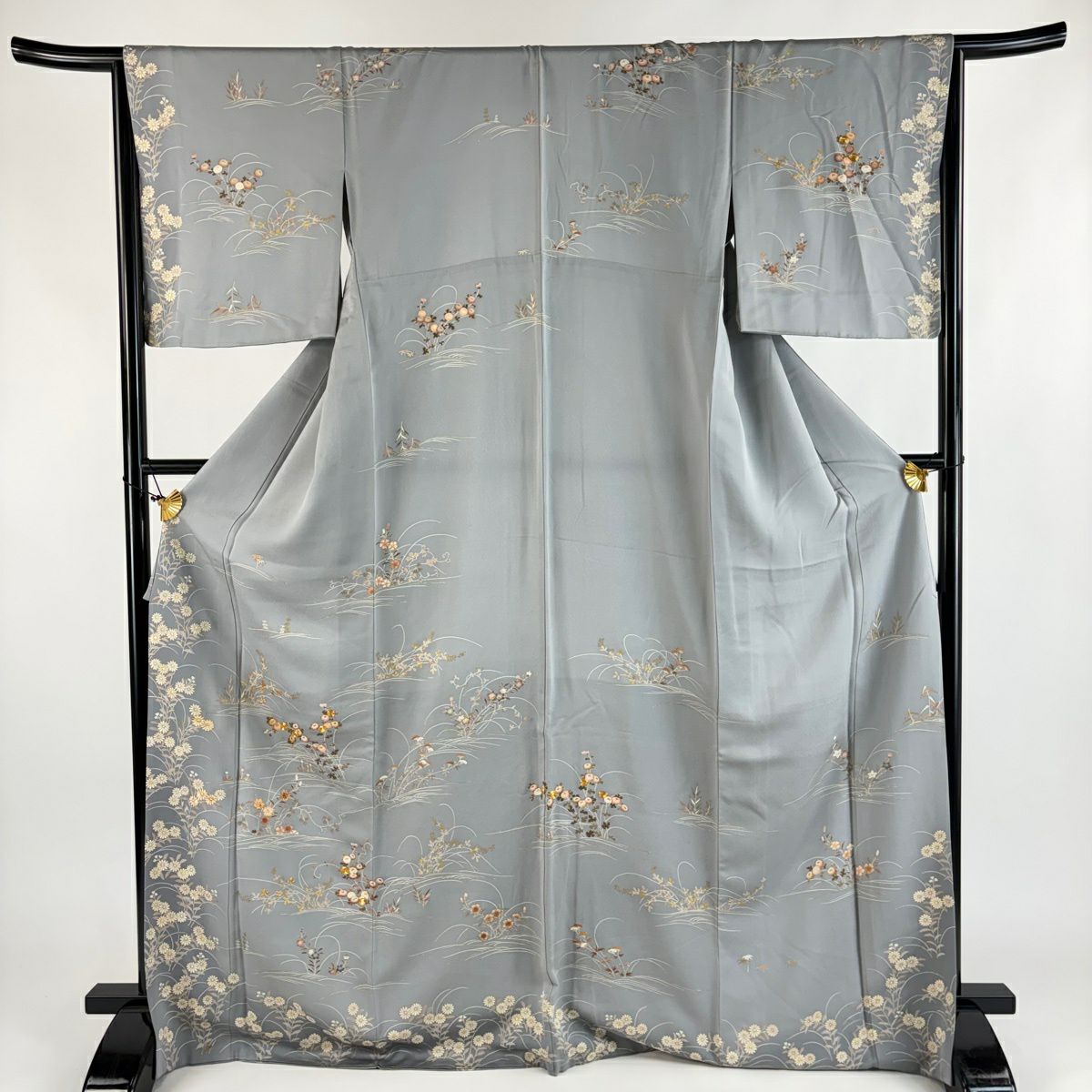 30%OFF 訪問着 身丈169cm 裄丈66cm M 袷 背抜き 万寿菊 萩 金糸 金彩 青灰色 正絹 秀品 一つ紋 K30