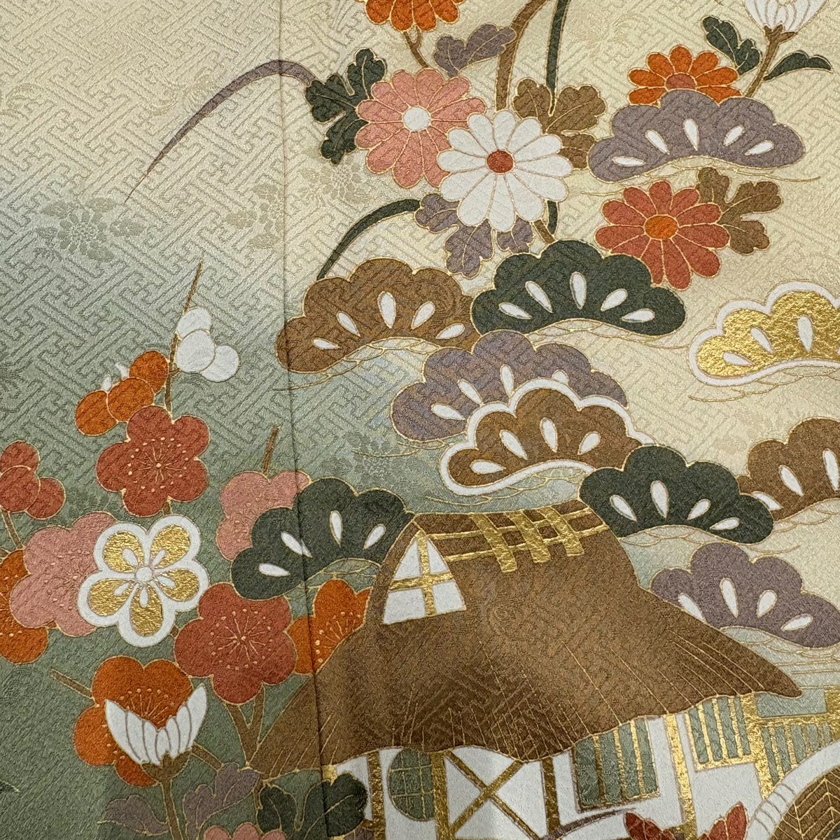 30%OFF 訪問着 身丈161.5cm 裄丈65.5cm M 袷 松竹梅 建物 金彩 ぼかし ベージュ 正絹 秀品 K30