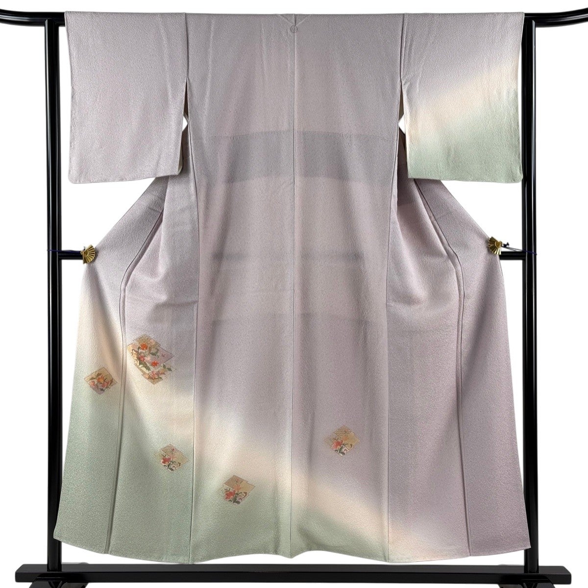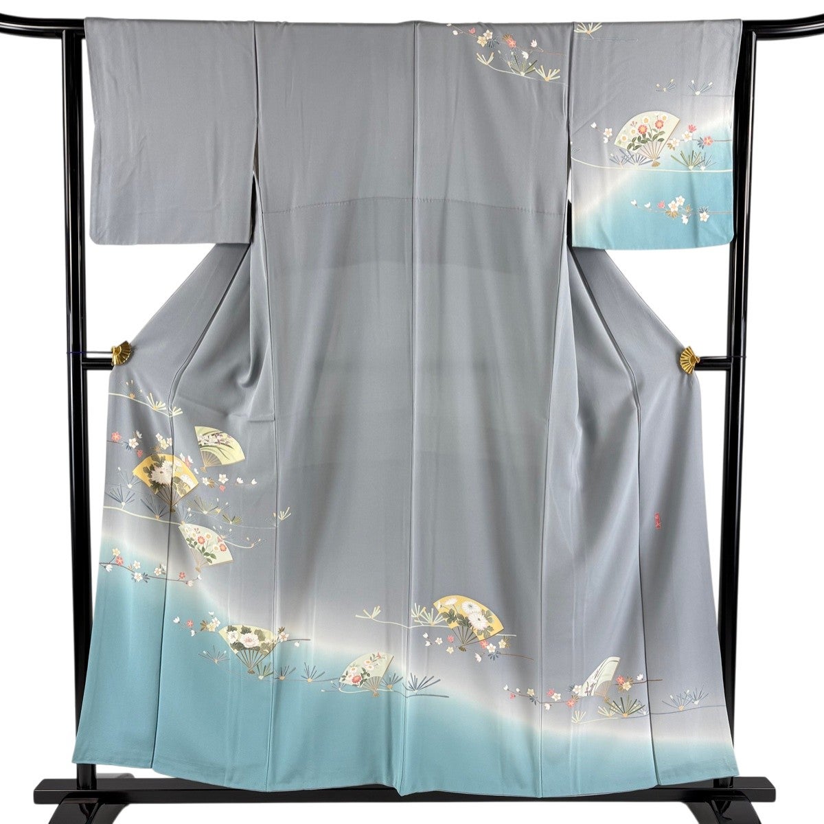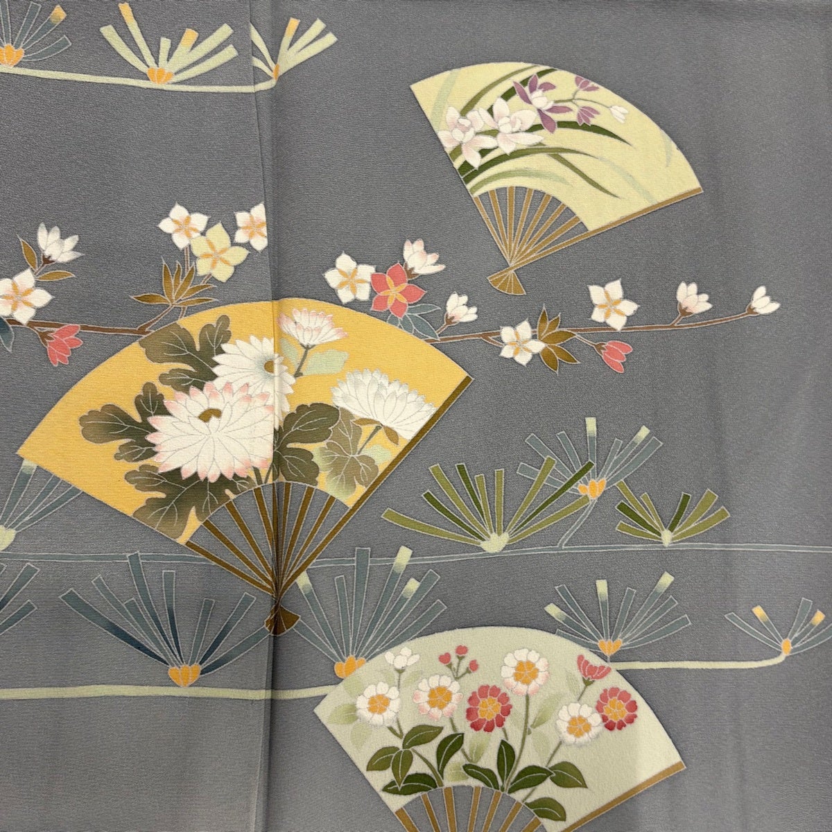 30%OFF 訪問着 身丈155.5cm 裄丈63.5cm S 袷 落款あり 扇 草花 ぼかし 灰色 正絹 秀品 K30