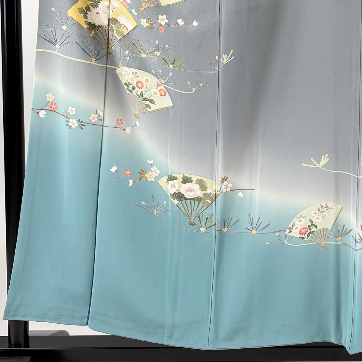 30%OFF 訪問着 身丈158cm 裄丈63cm S 袷 破れ色紙 花扇 金彩 ぼかし 青灰色 正絹 秀品 K30