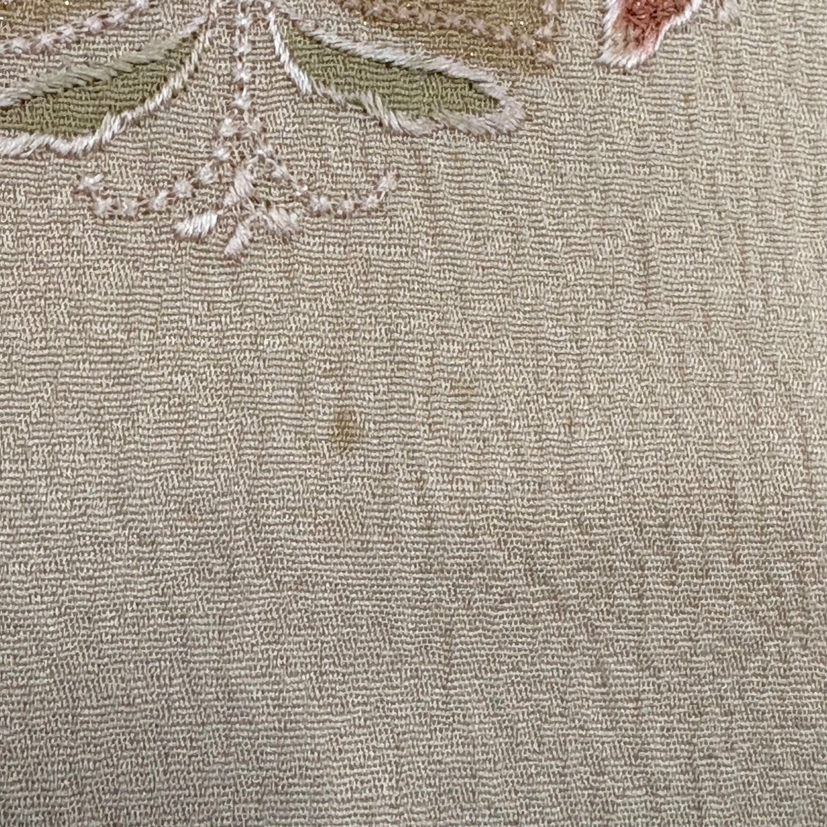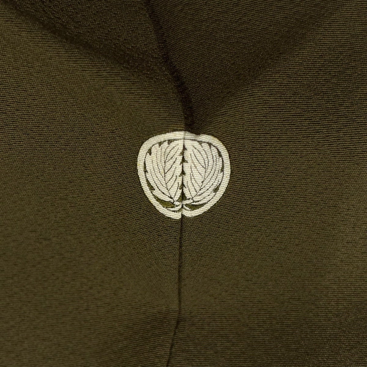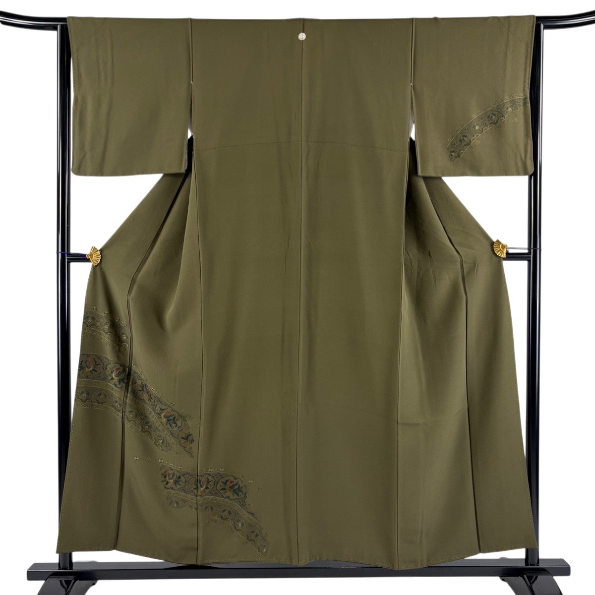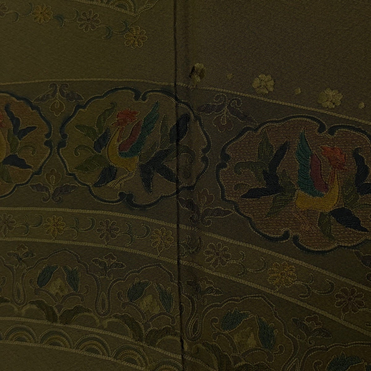 30%OFF 付下げ 身丈155.5cm 裄丈64cm M 袷 鳳凰 草花 刺繍 茶緑色 正絹 秀品 一つ紋 K30