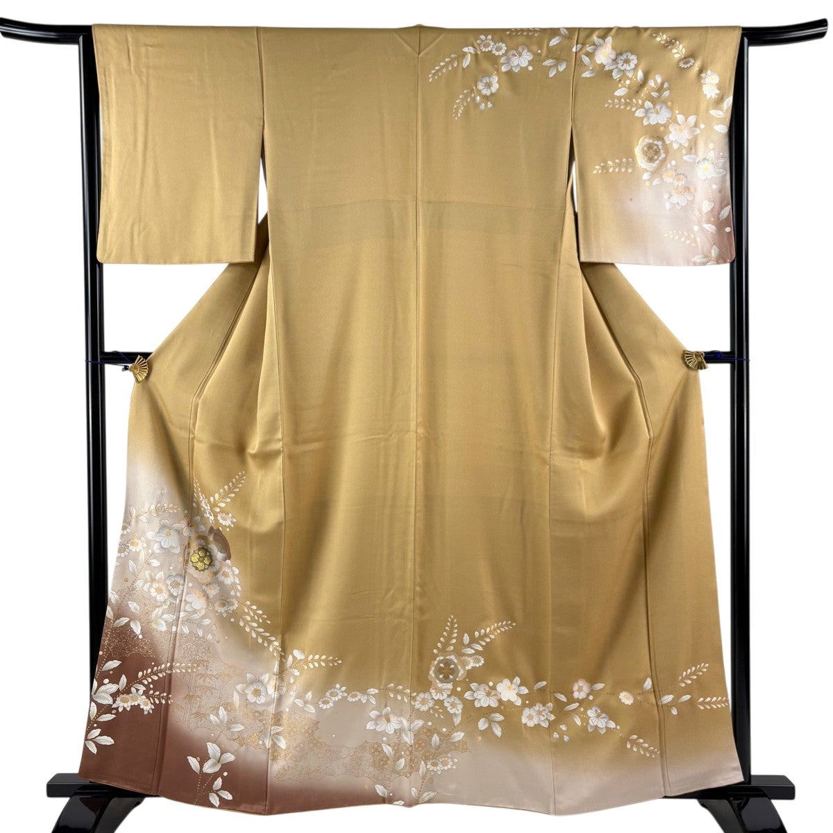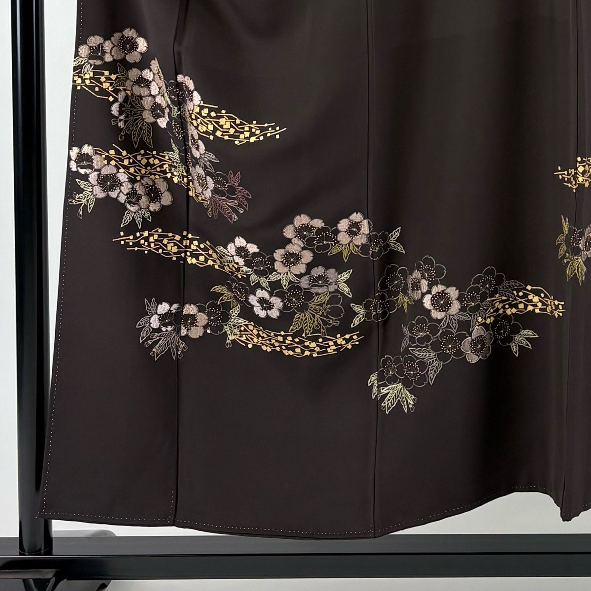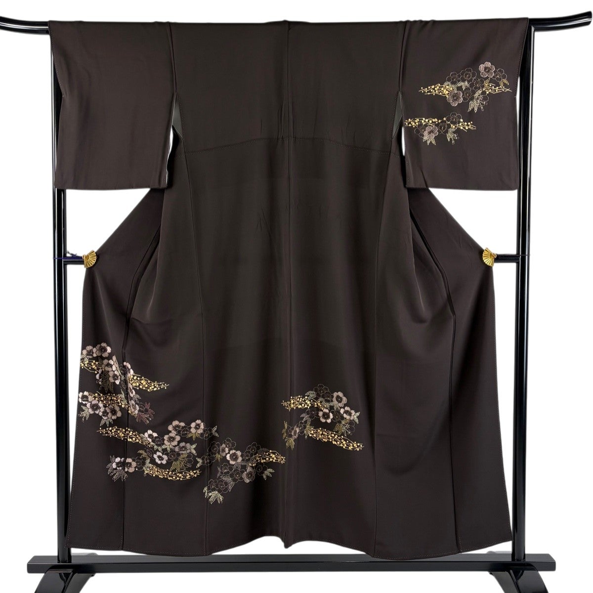 30%OFF 付下げ 身丈151.5cm 裄丈67cm M 袷 桜 箔散らし 刺繍 金糸 焦茶色 正絹 秀品 K30