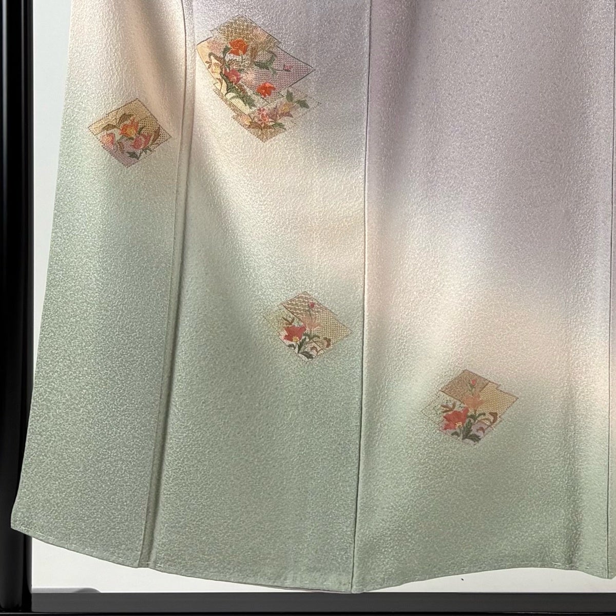 30%OFF 訪問着 身丈166cm 裄丈62.5cm S 単衣 扇面 草花 金彩 ぼかし 薄紫 正絹 秀品 K30