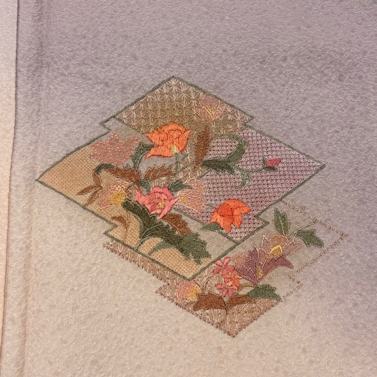 30%OFF 付下げ 身丈152cm 裄丈62cm S 袷 草花 松皮菱 刺繍 金糸 薄紫 正絹 秀品 一つ紋 K30