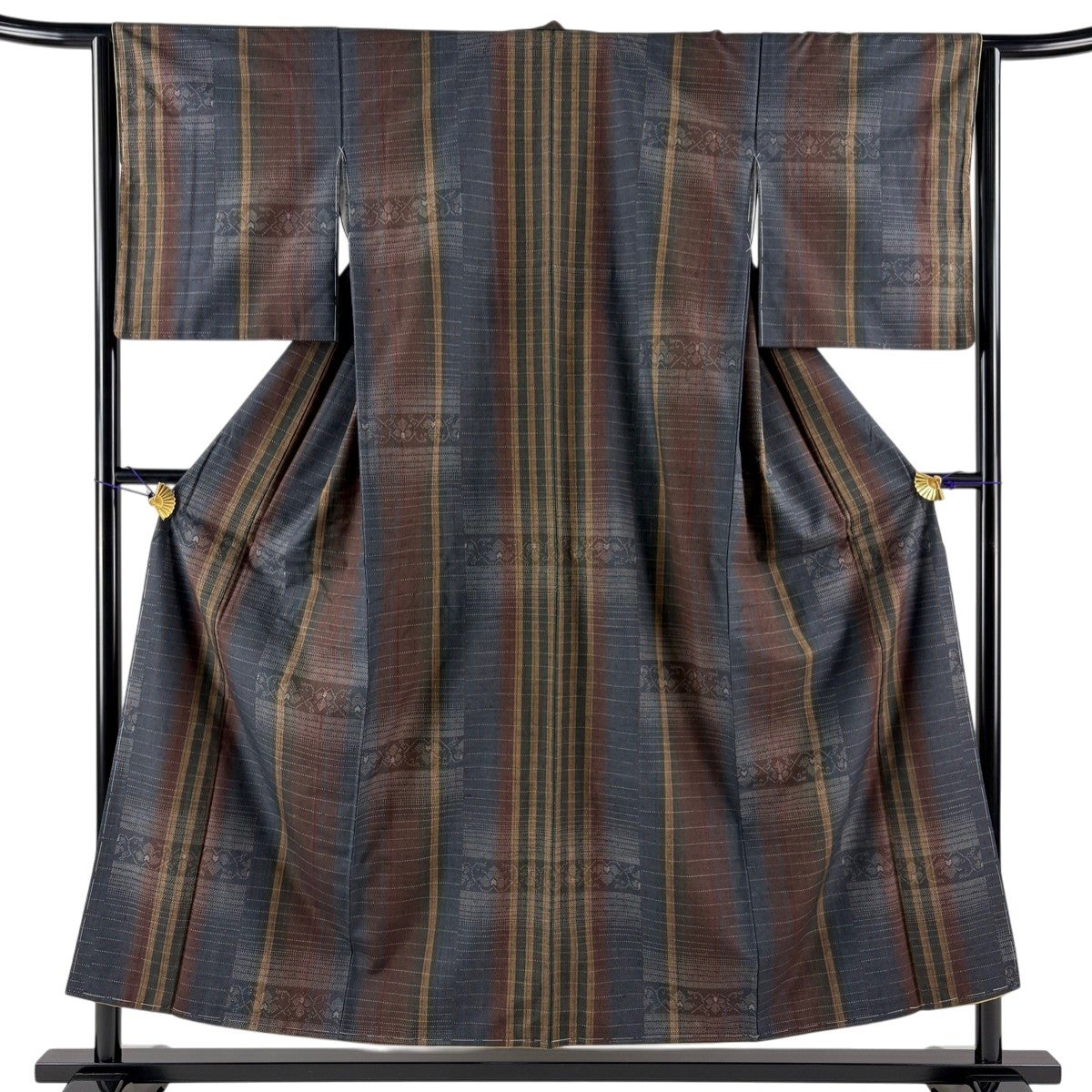 30%OFF 【美品】 紬 身丈153.5cm 裄丈64.5cm M 袷 証紙あり 縞 幾何学 紺色 正絹 秀品 K30
