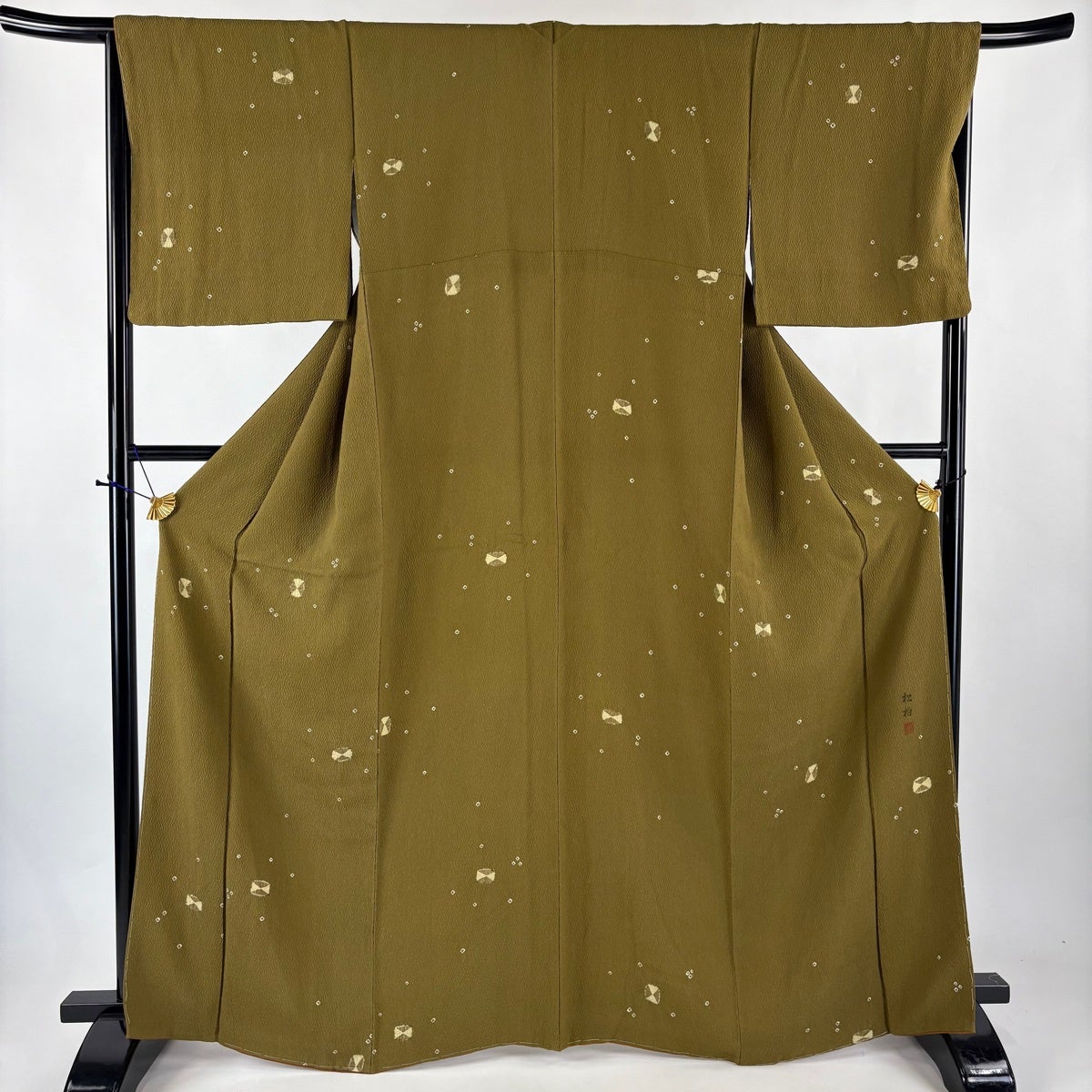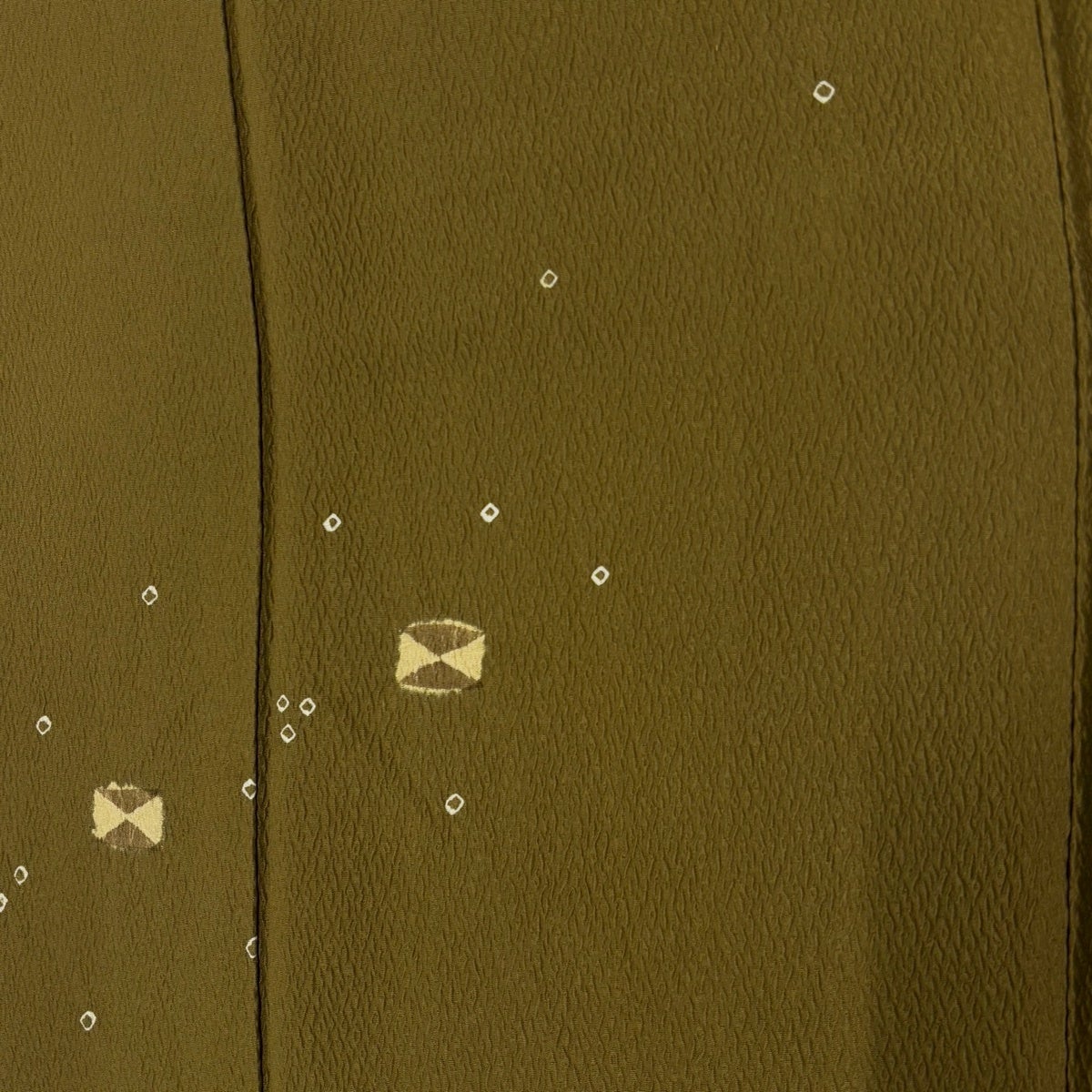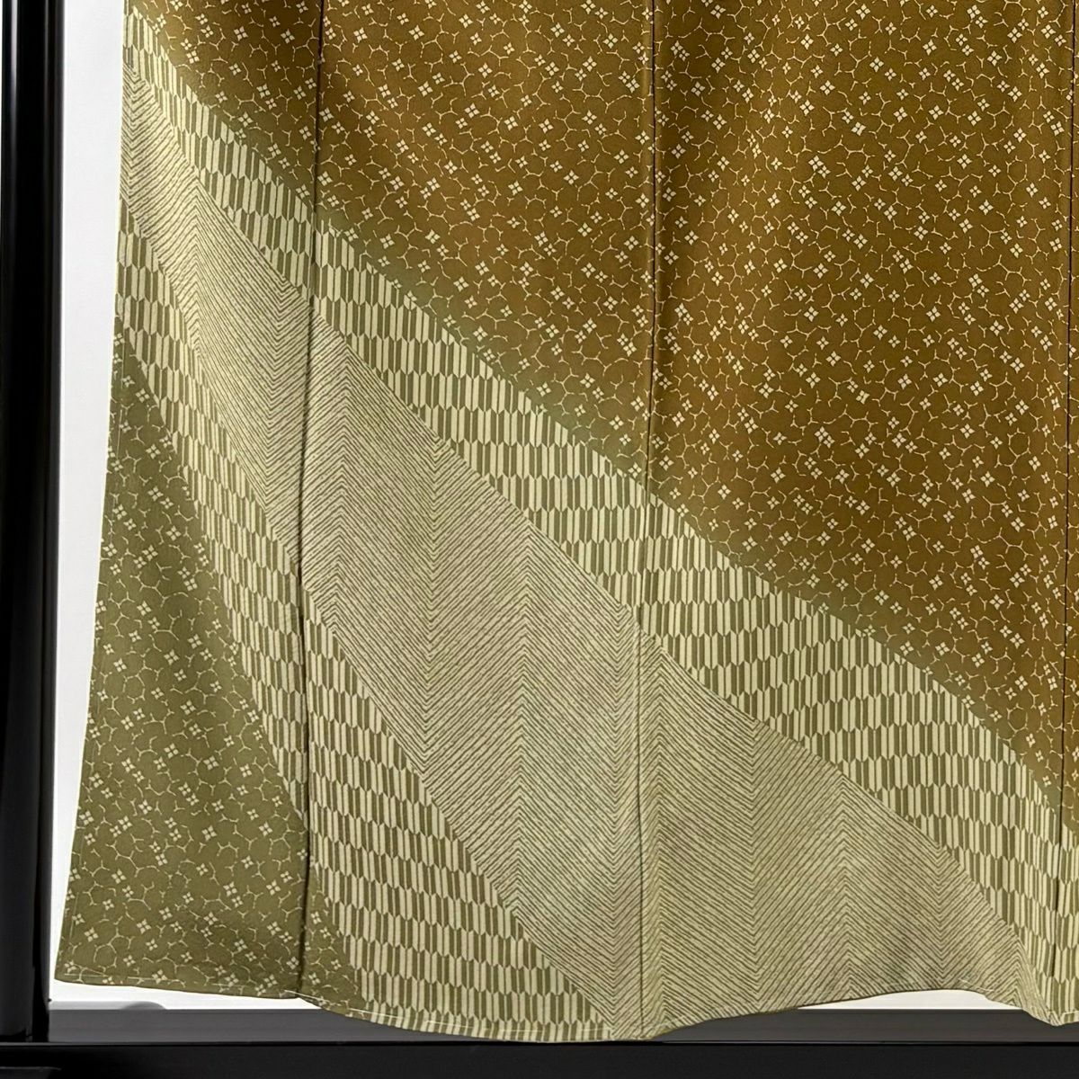 【美品】 小紋 身丈165.5cm 裄丈67.5cm L 袷 落款あり 幾何学模様 絞り 茶緑色 正絹 秀品
