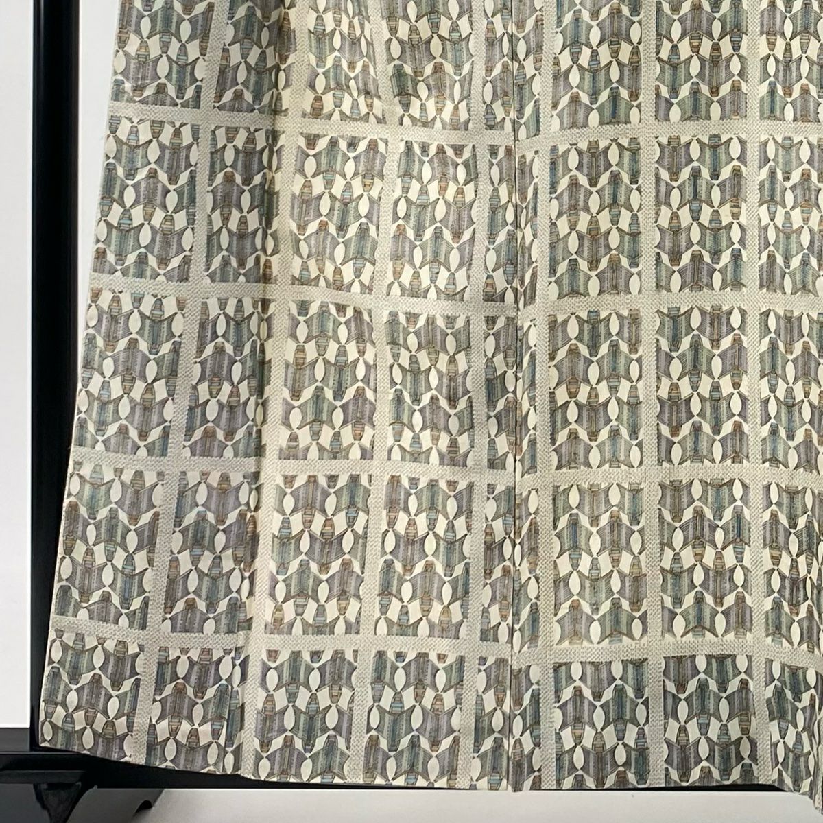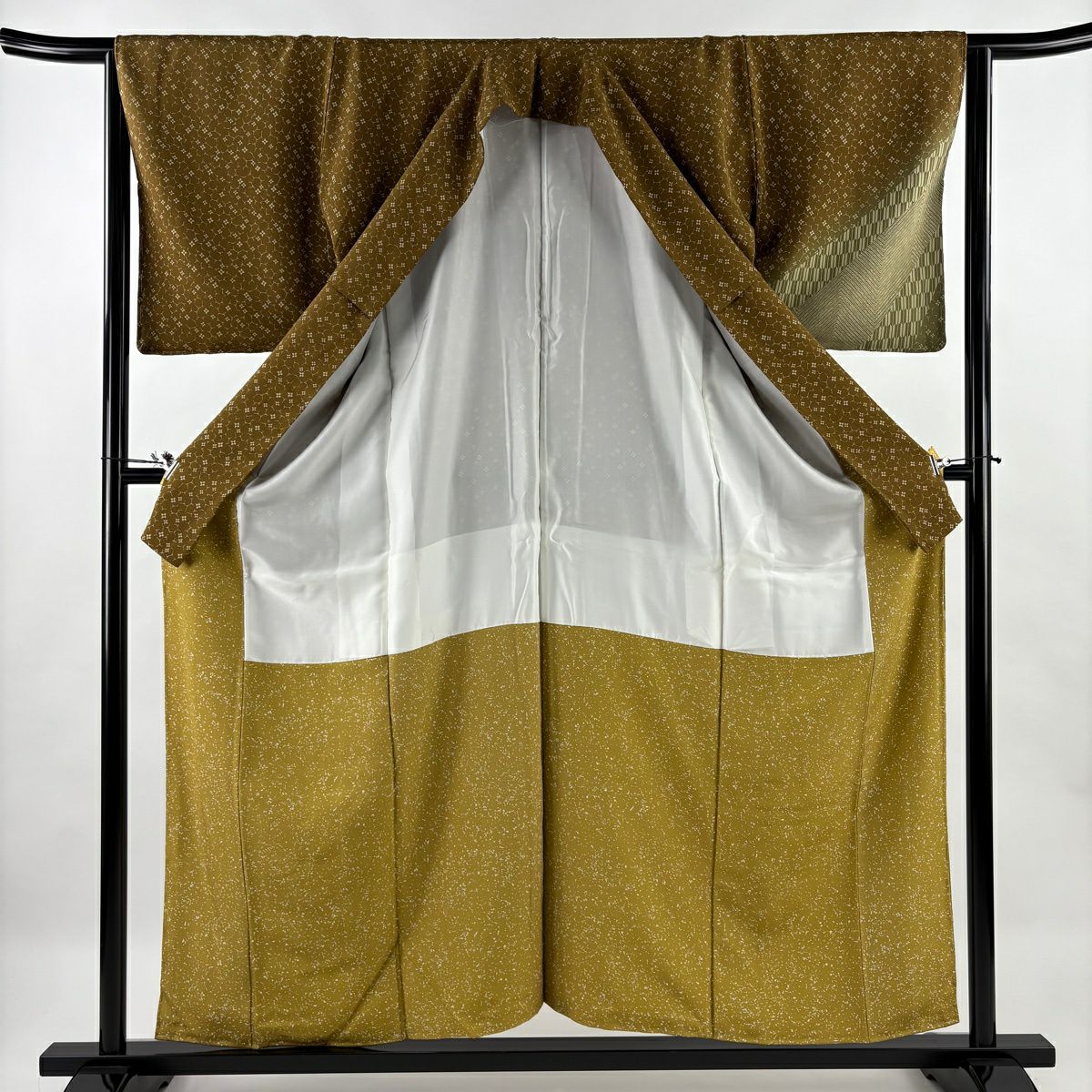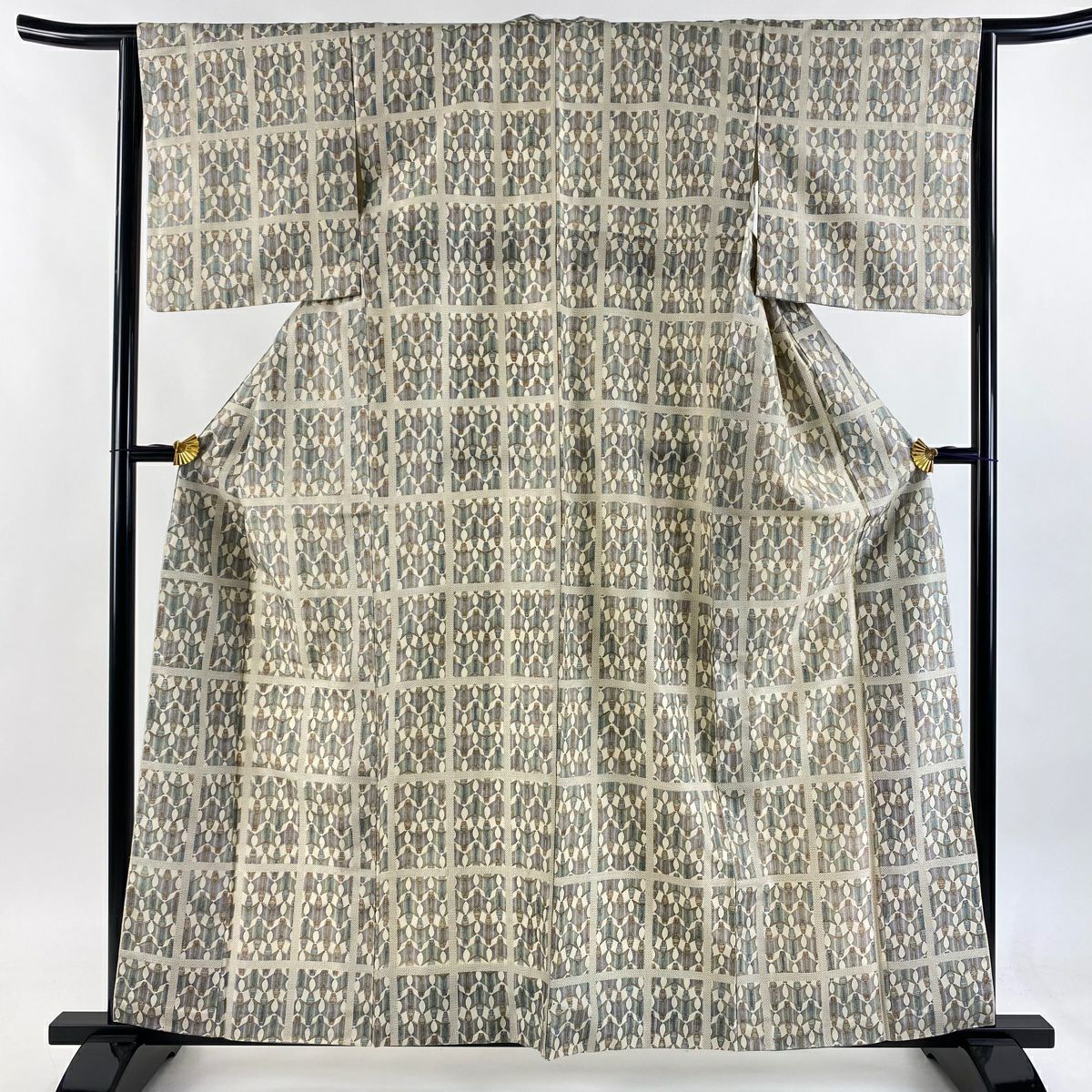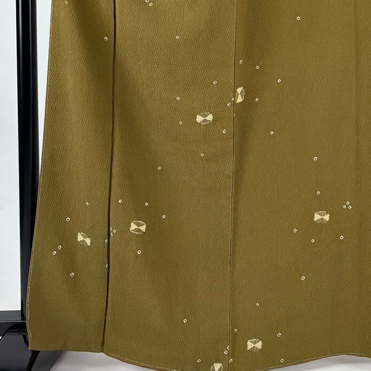 【美品】 小紋 身丈165.5cm 裄丈67.5cm L 袷 落款あり 幾何学模様 絞り 茶緑色 正絹 秀品