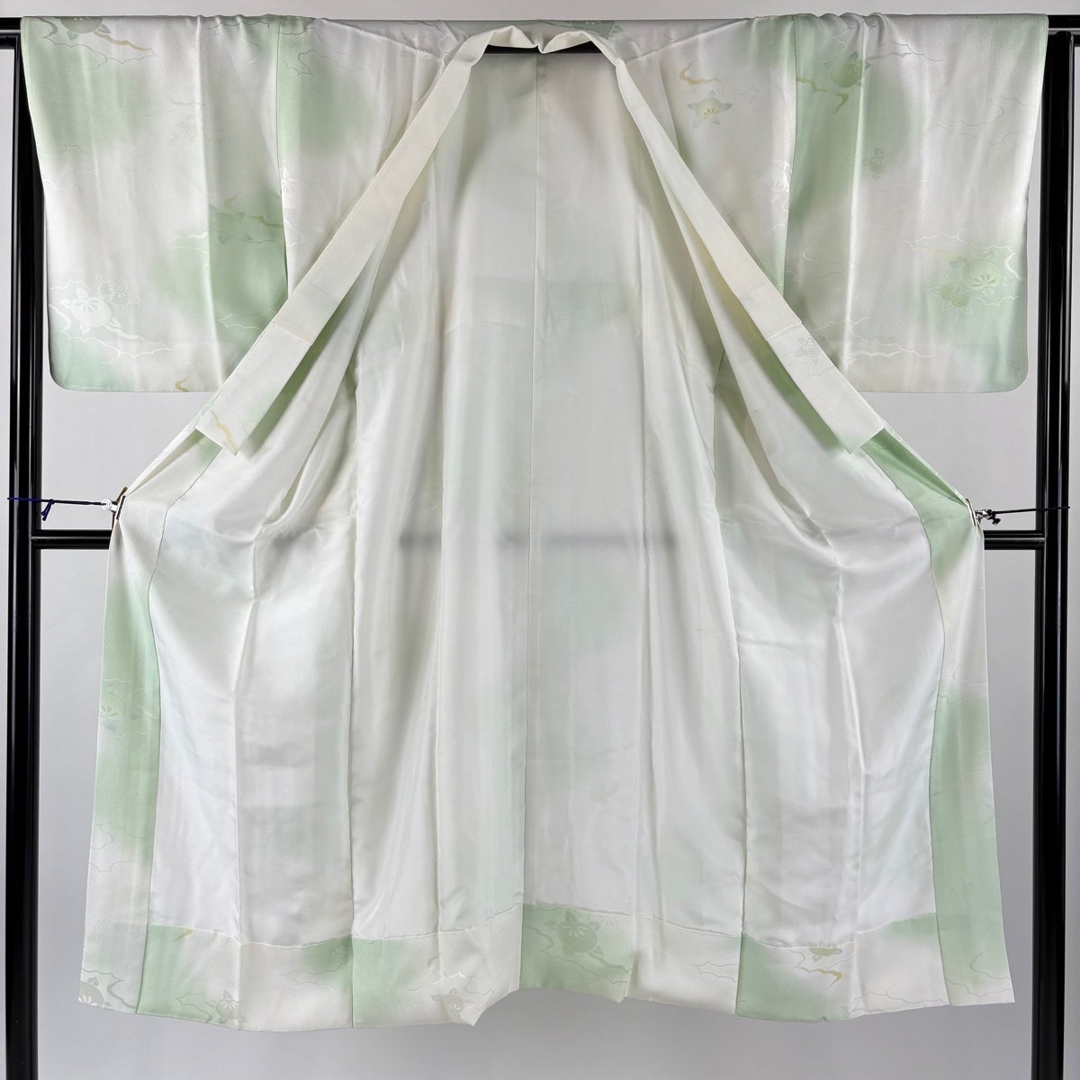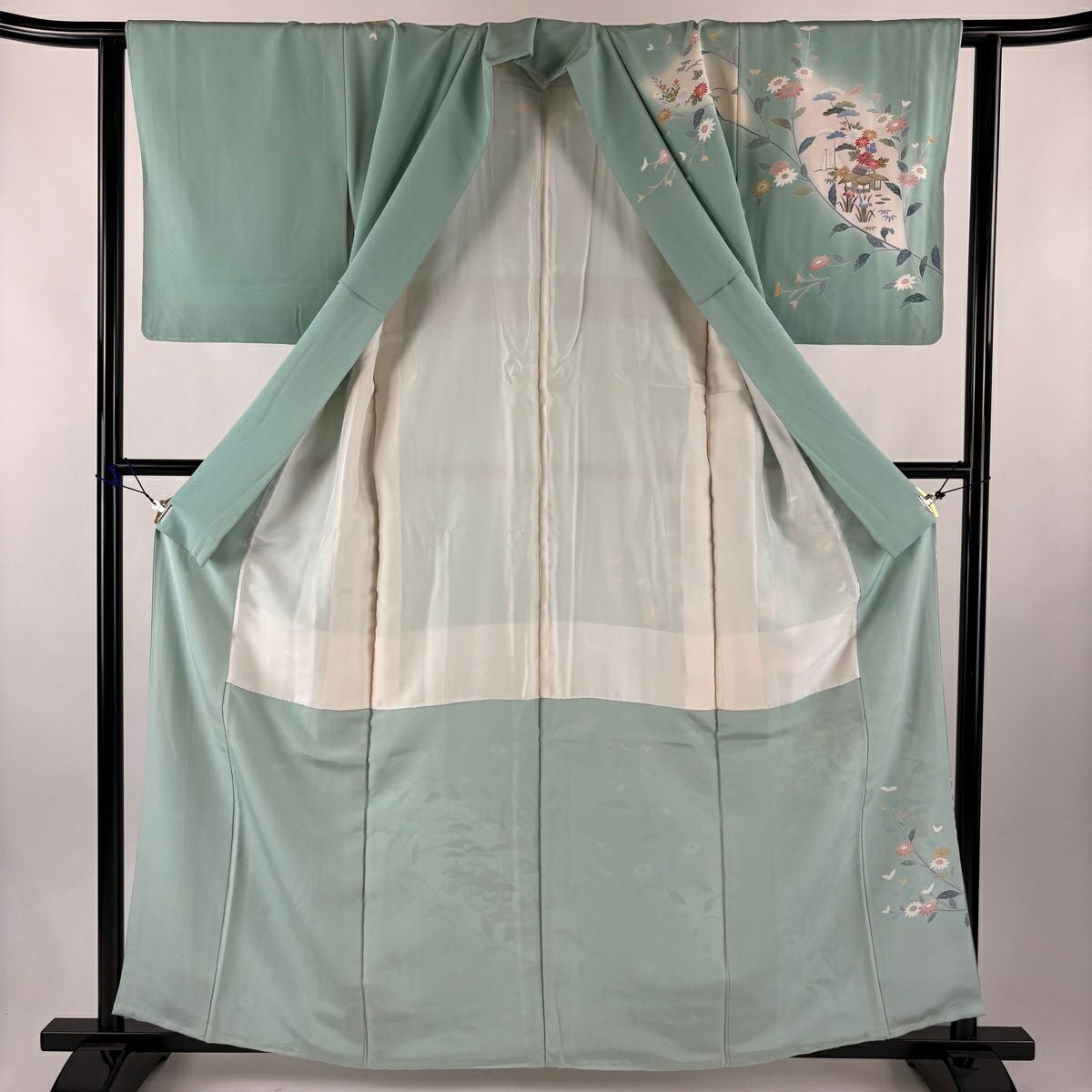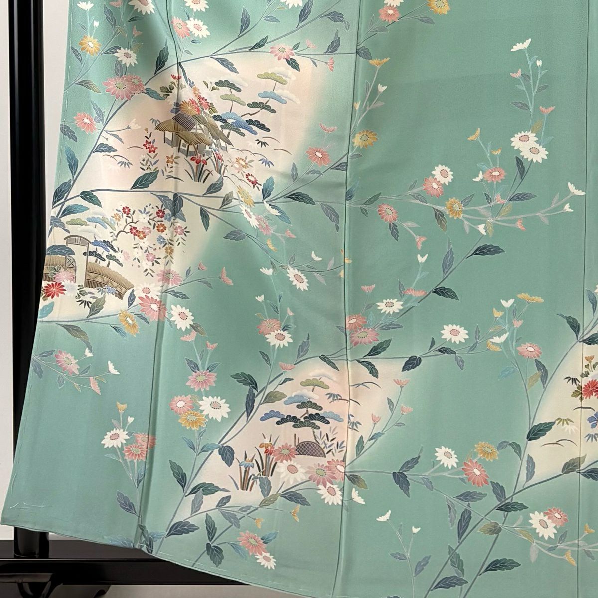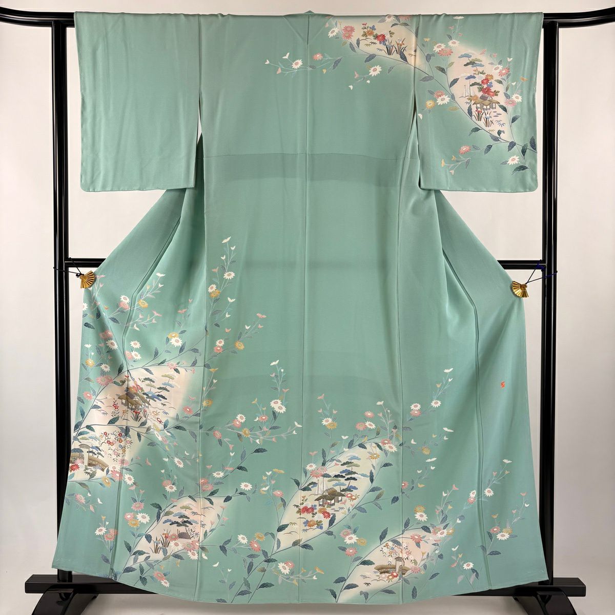 訪問着 身丈161.5cm 裄丈62cm S 袷 落款あり 家屋 菊 染め分け ぼかし 薄緑 正絹 秀品