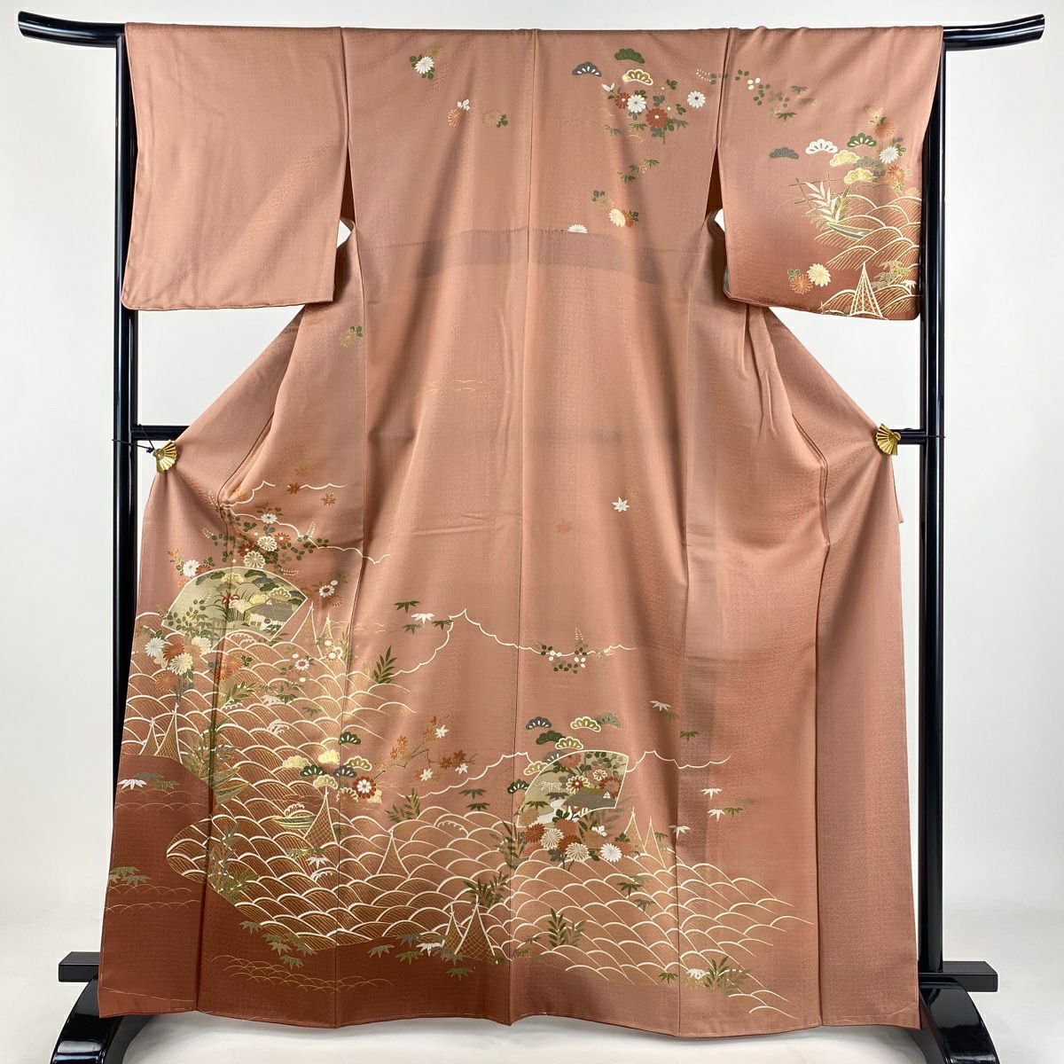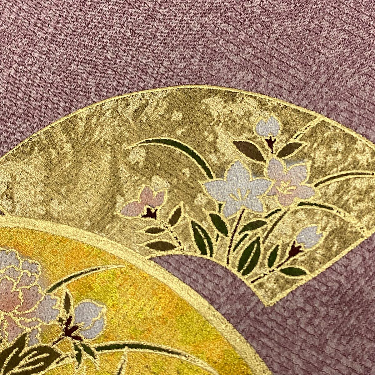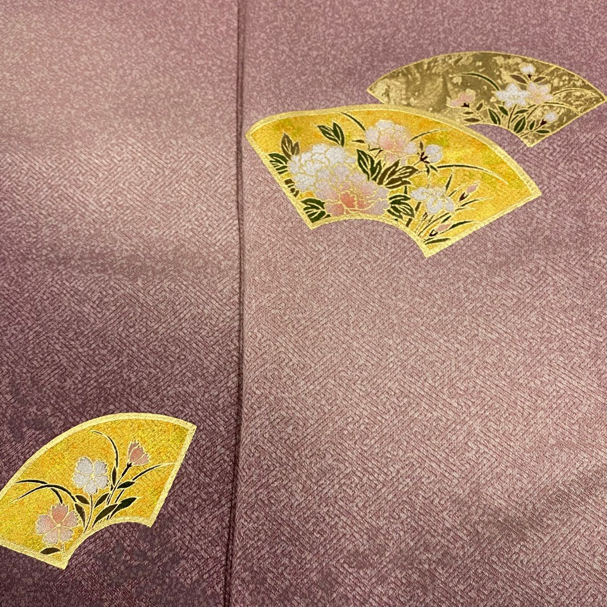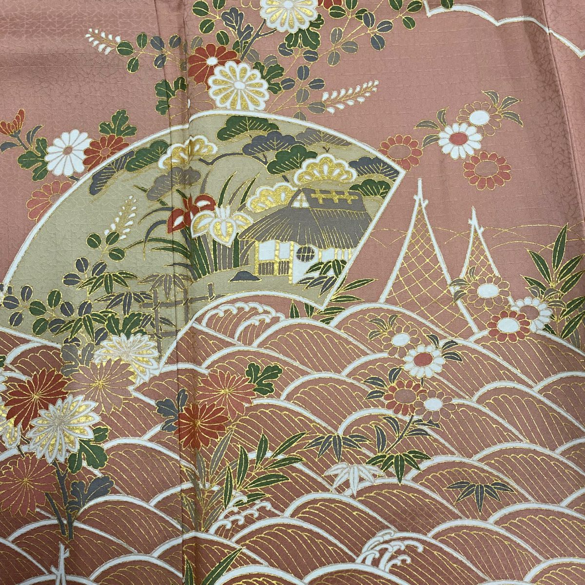 【在庫一掃】 訪問着 身丈166cm 裄丈65.5cm M 袷 扇面 草花 金彩 ピンク 正絹 秀品