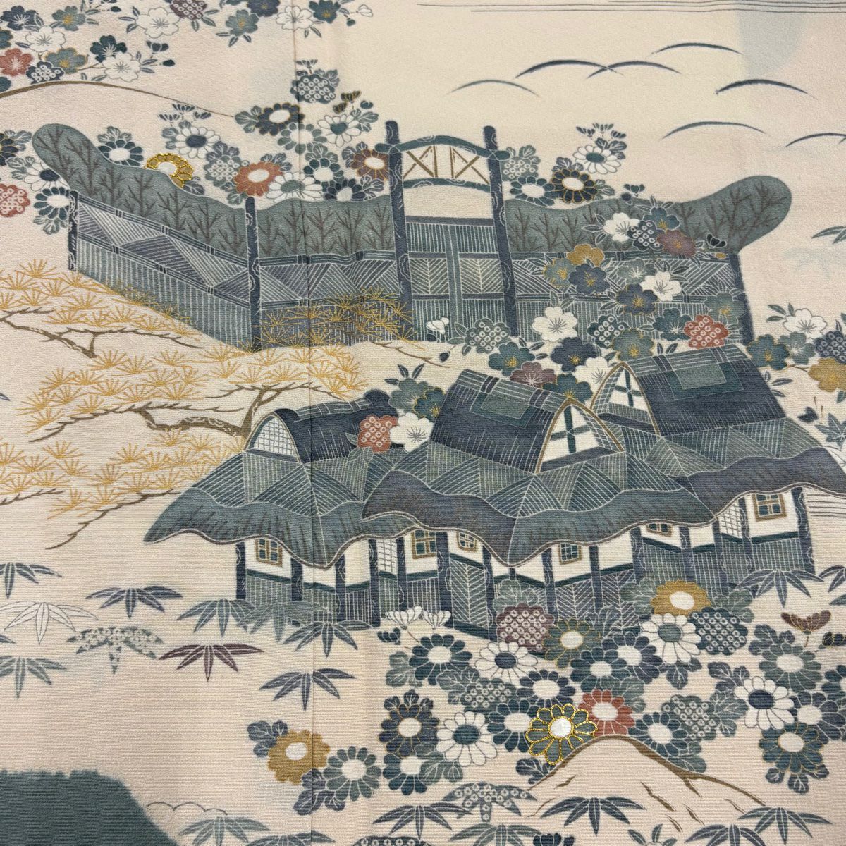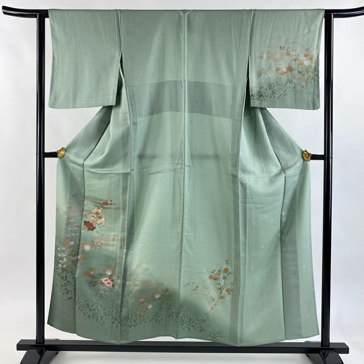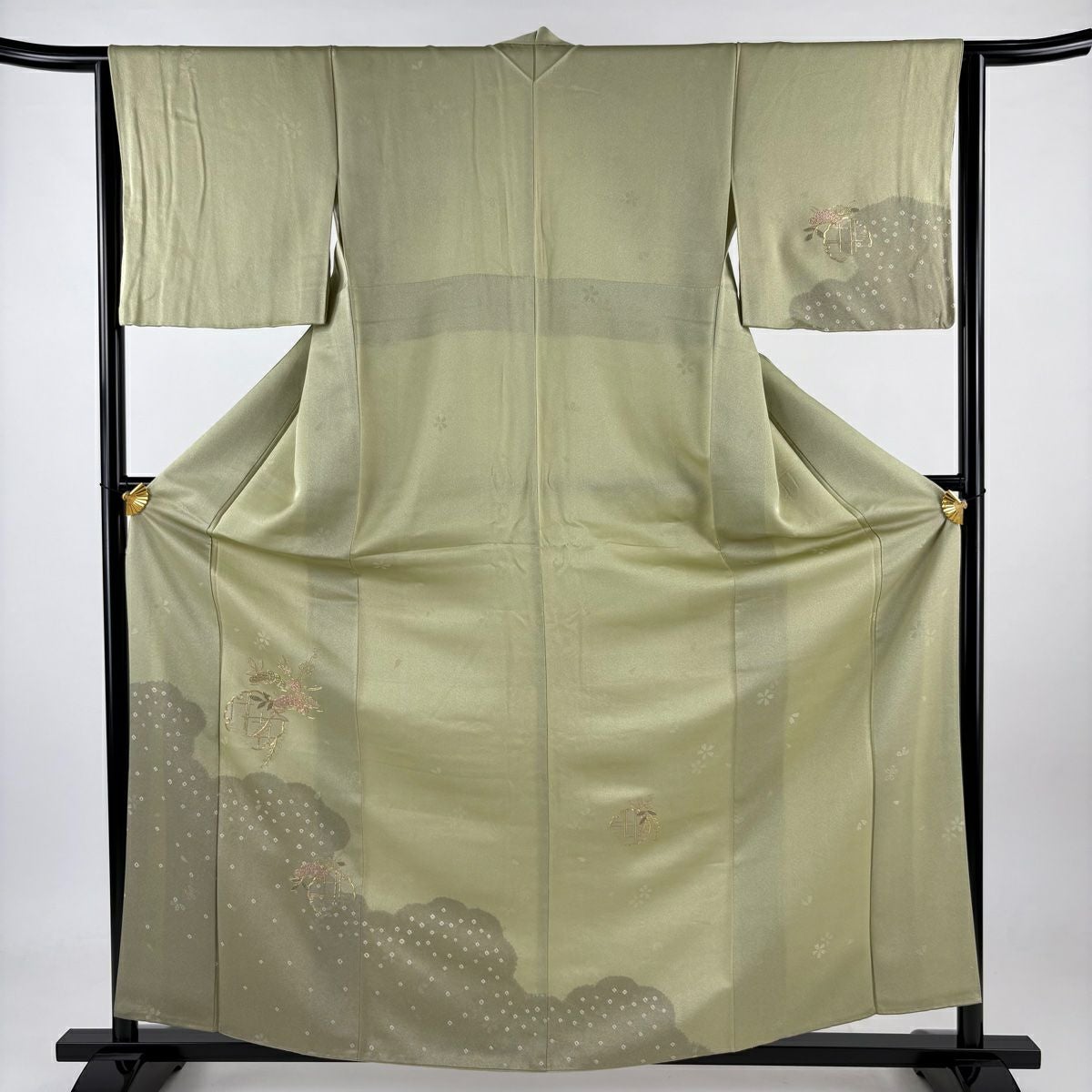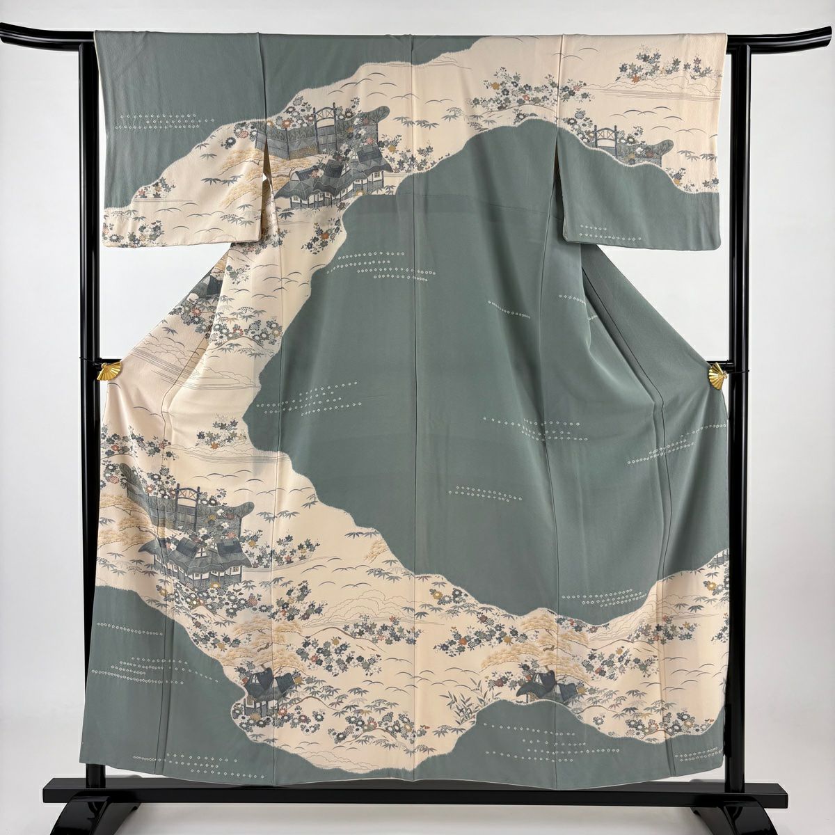 【在庫一掃】 訪問着 身丈155.5cm 裄丈63.5cm S 袷 家屋 菊 金彩 絞り 灰緑 正絹 秀品