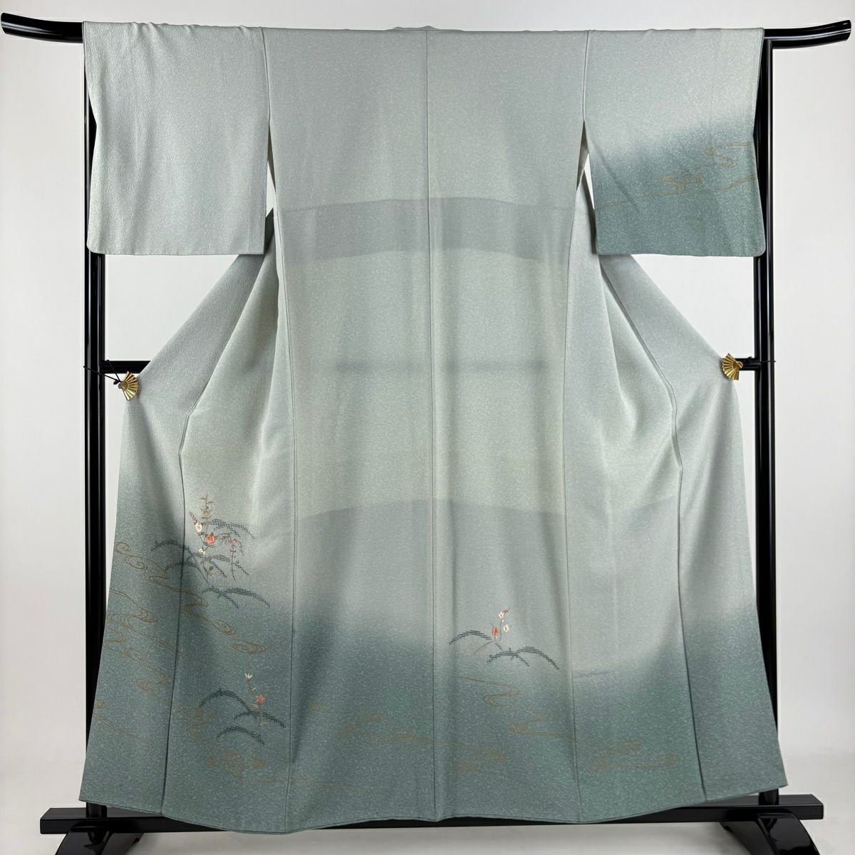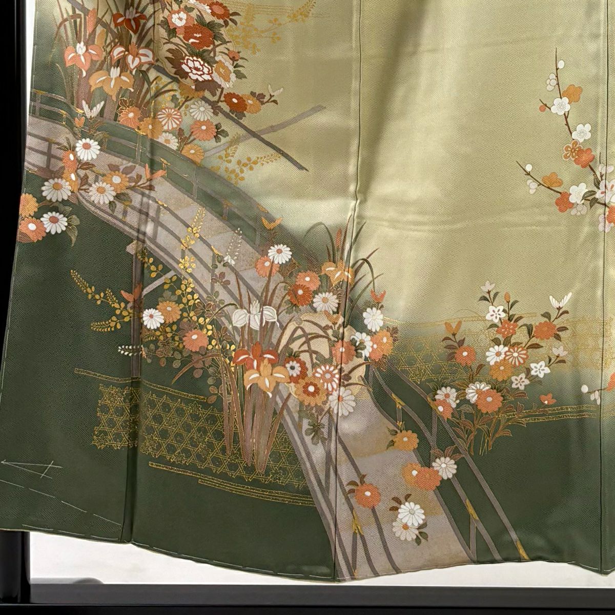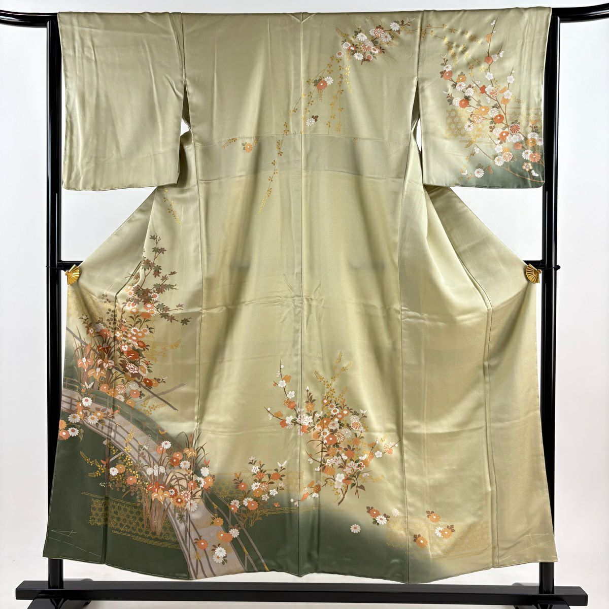 【在庫一掃】 訪問着 身丈154.5cm 裄丈64.5cm M 袷 草花 橋 金彩 ぼかし 灰緑 正絹 秀品