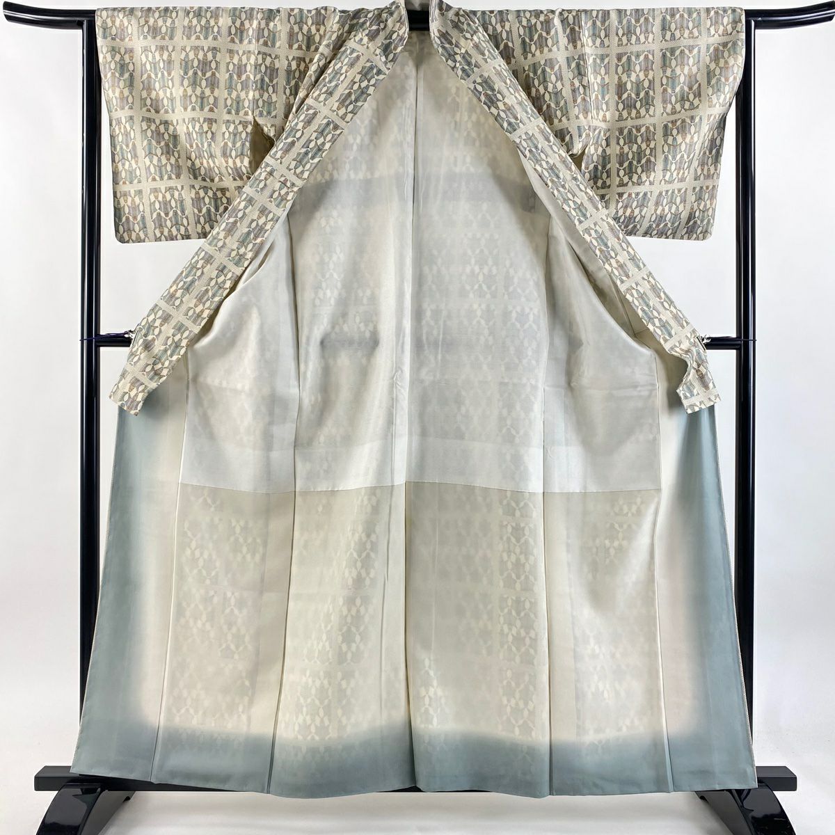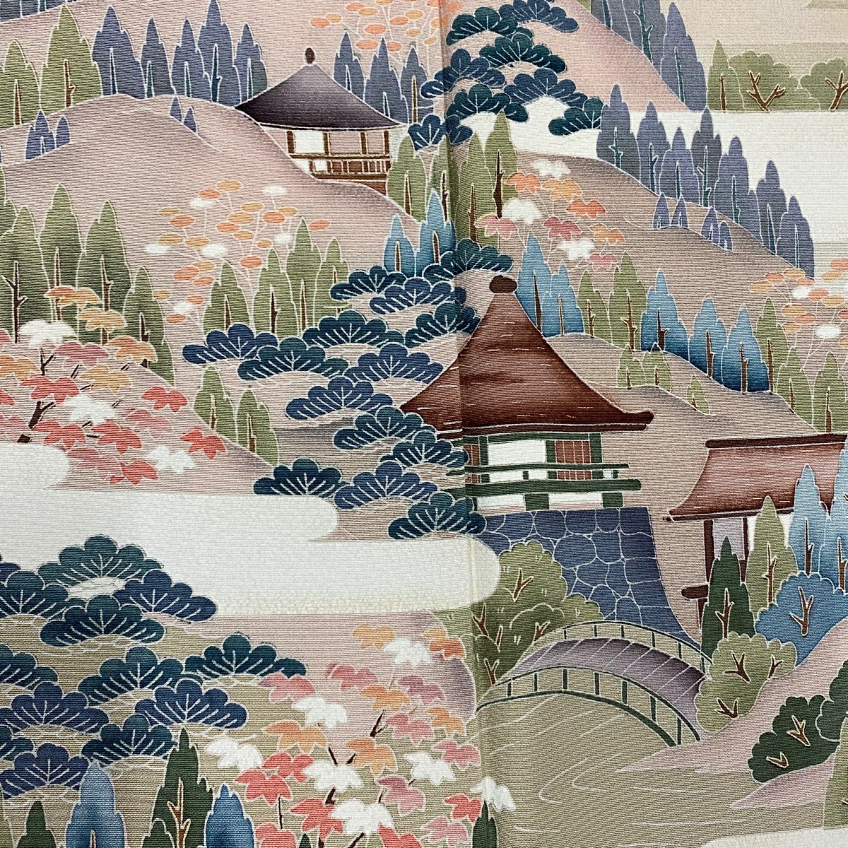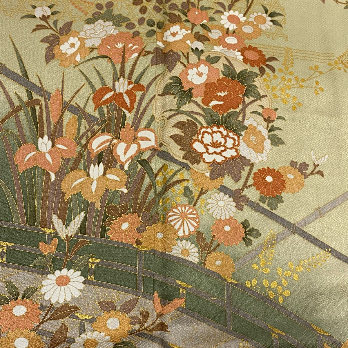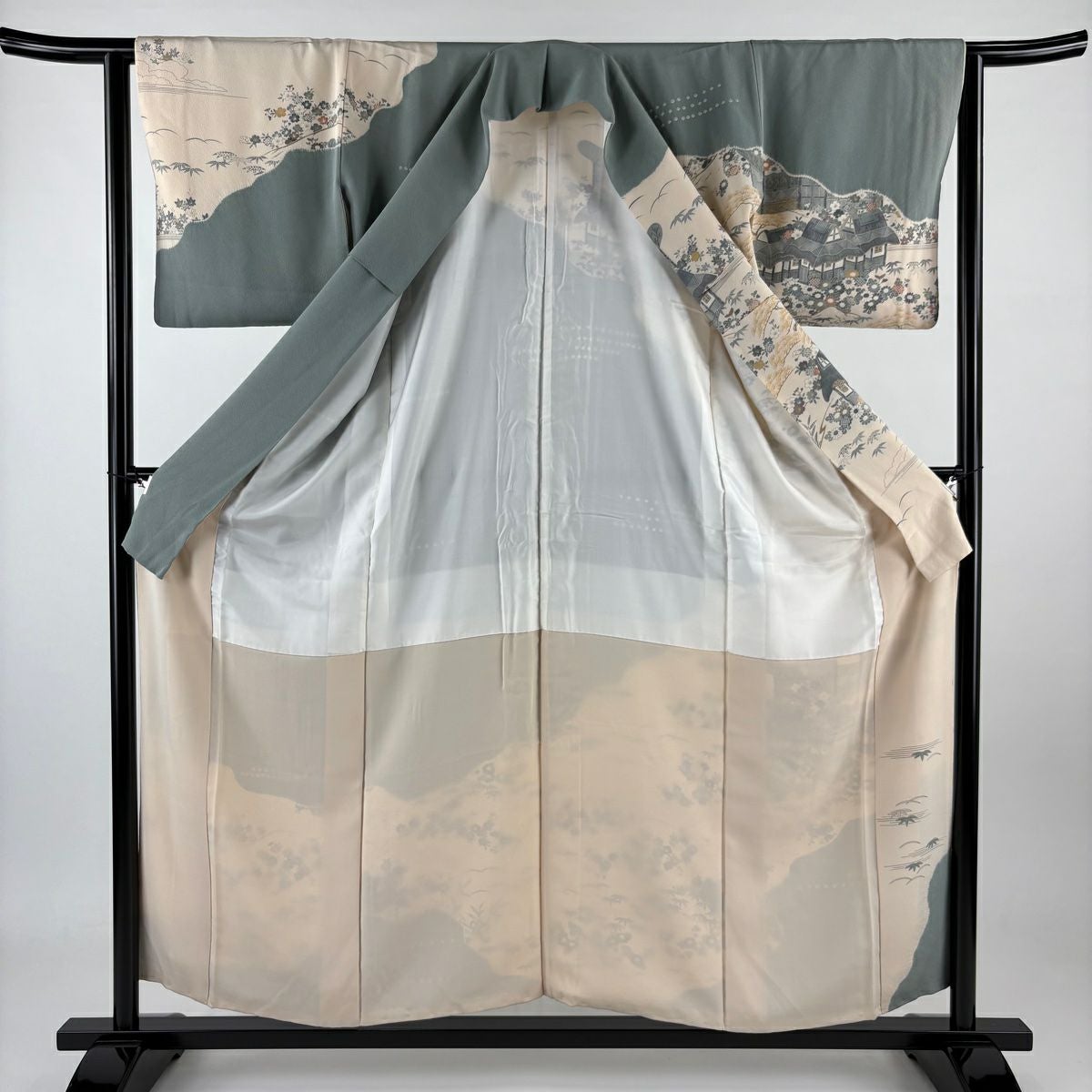 【在庫一掃】 訪問着 身丈154.5cm 裄丈64.5cm M 袷 草花 橋 金彩 ぼかし 灰緑 正絹 秀品
