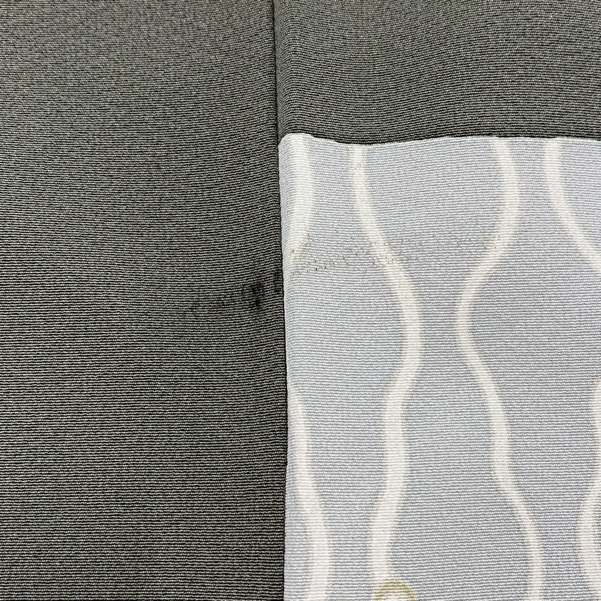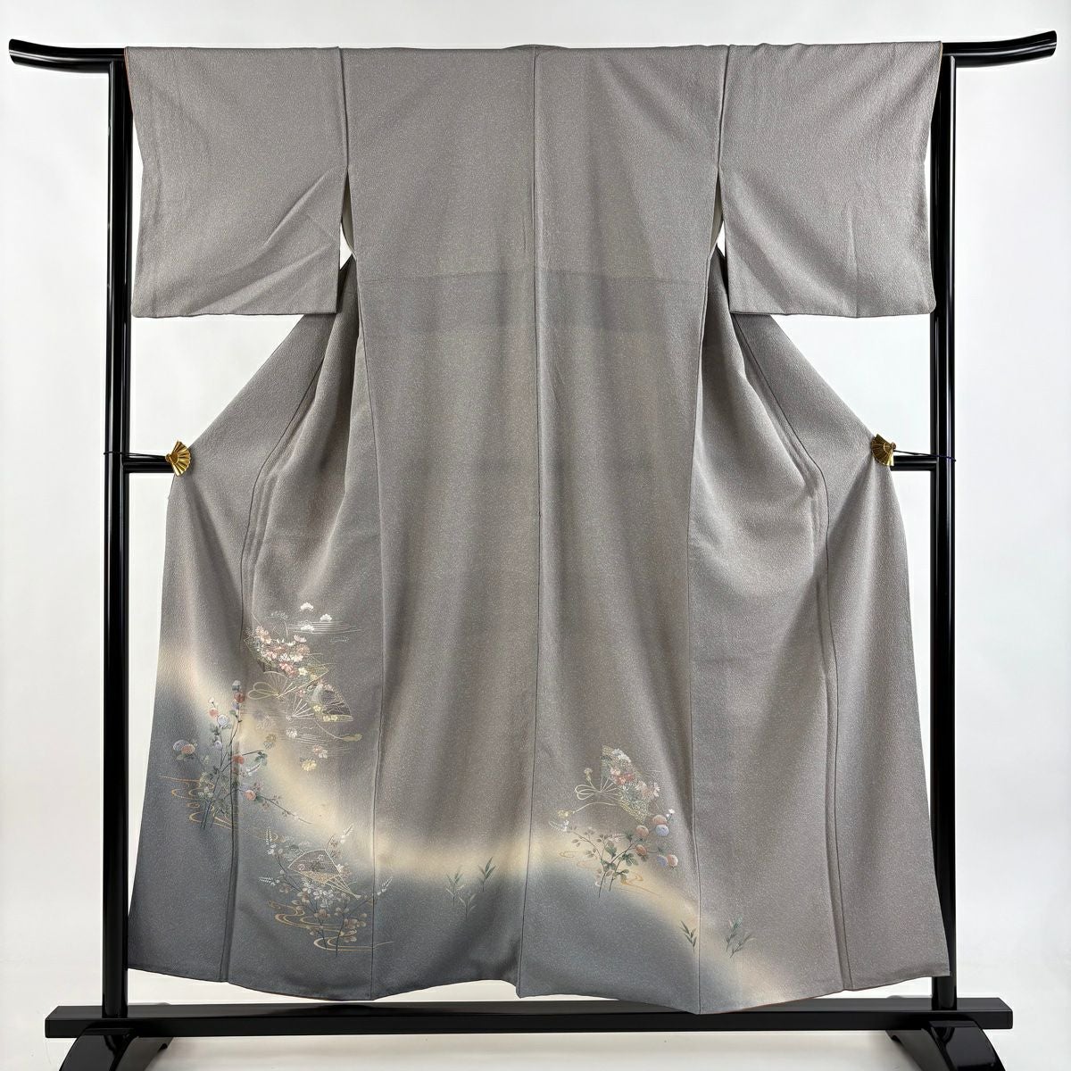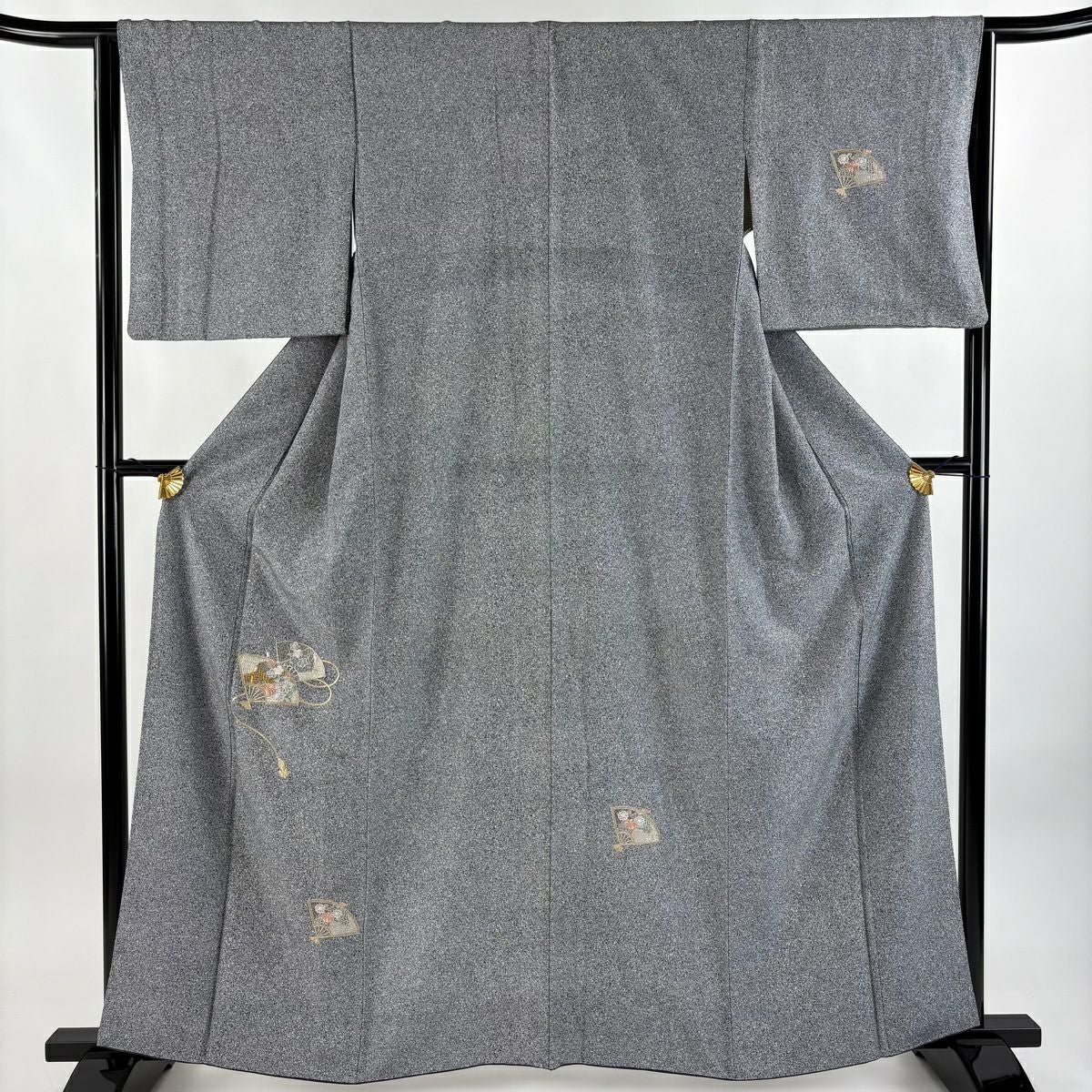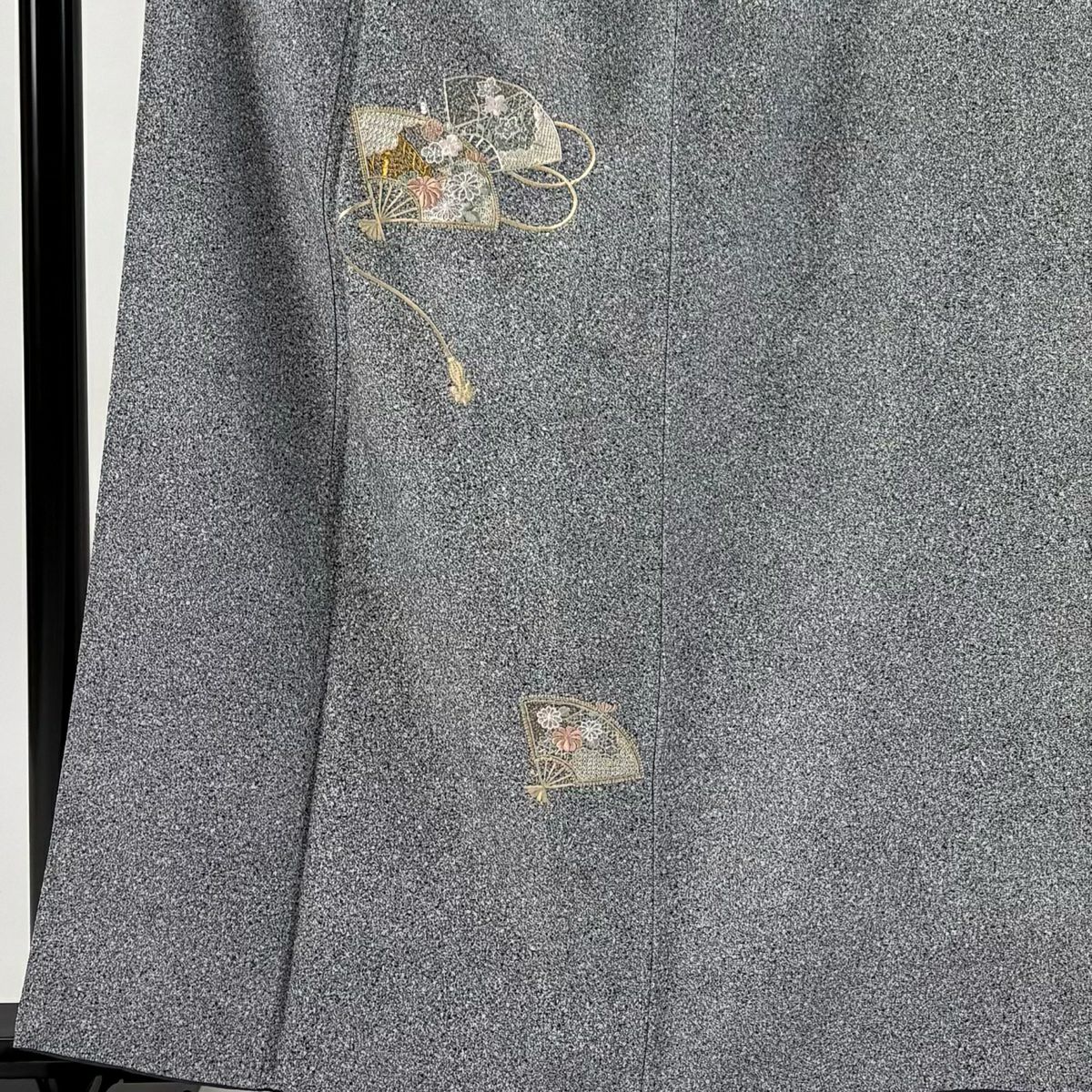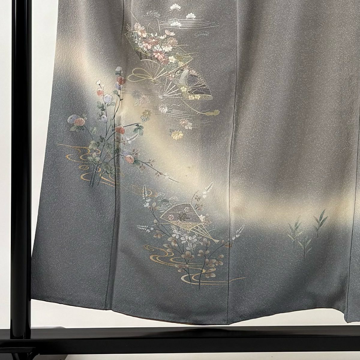 【在庫一掃】 付下げ 身丈160.5cm 裄丈64.5cm M 袷 扇 草花 金糸 刺繍 黒灰 正絹 秀品