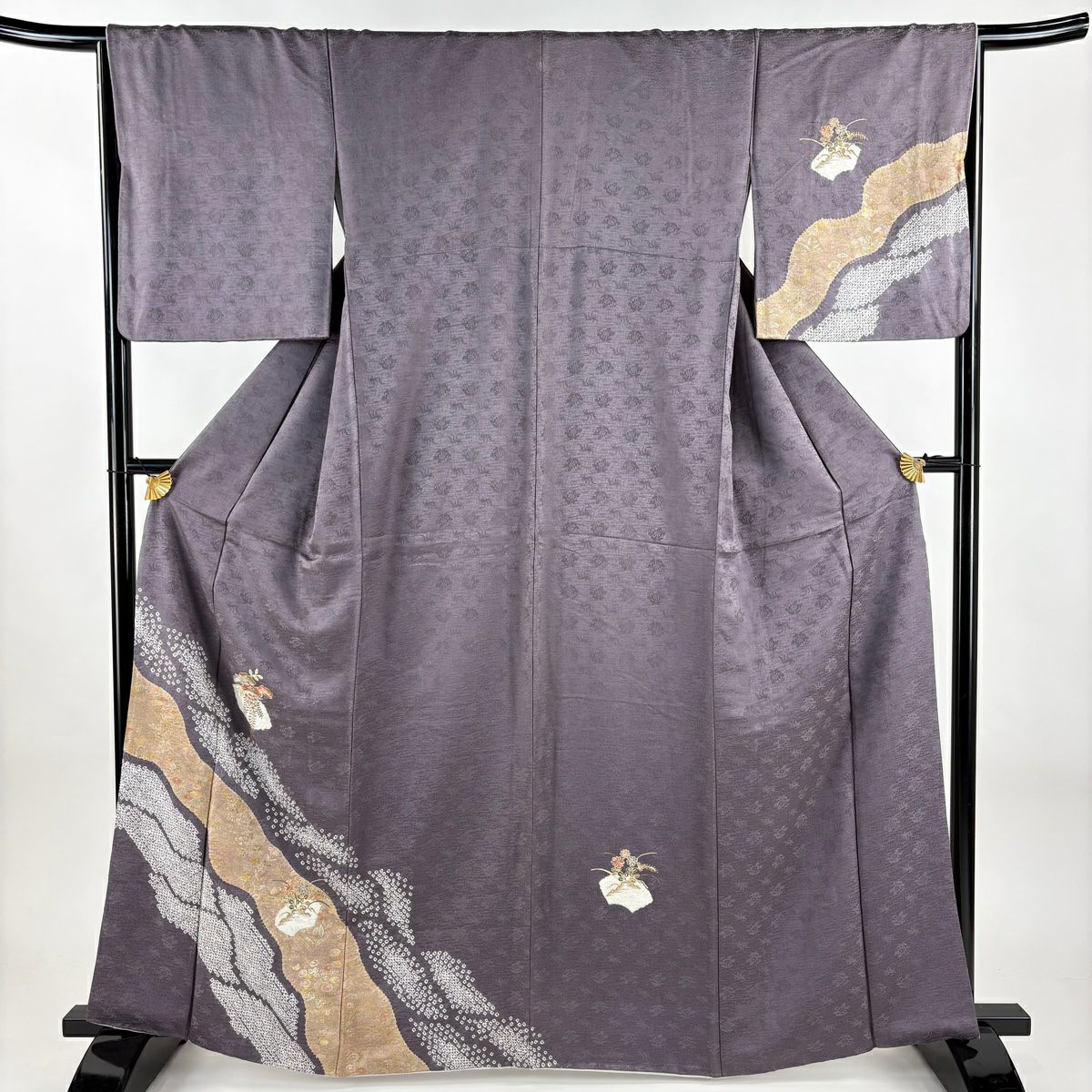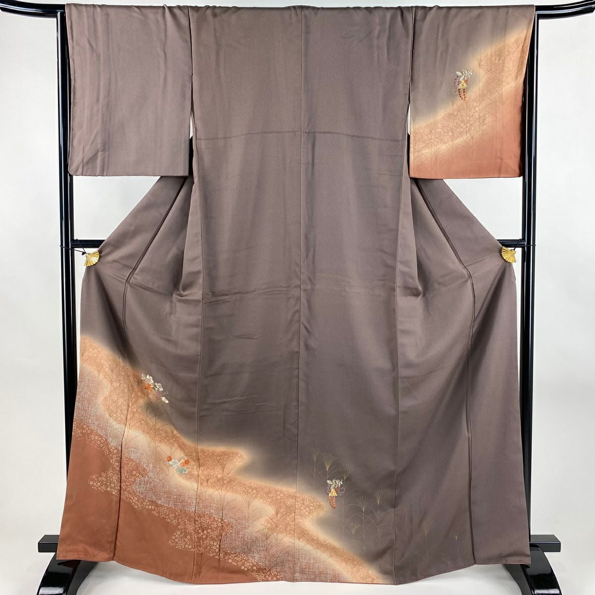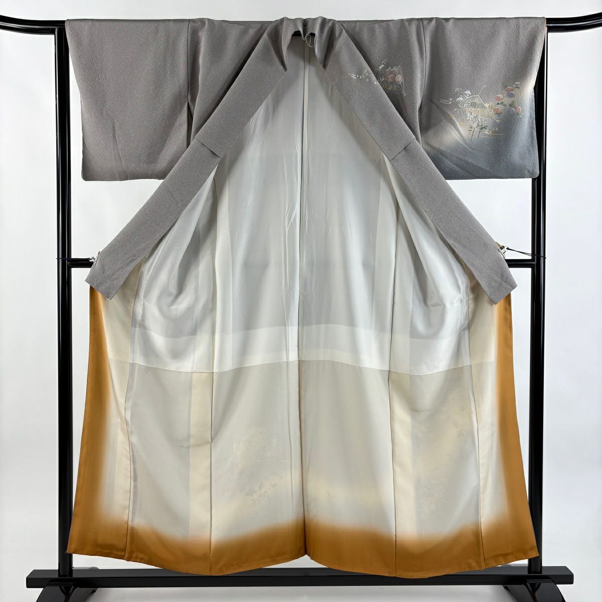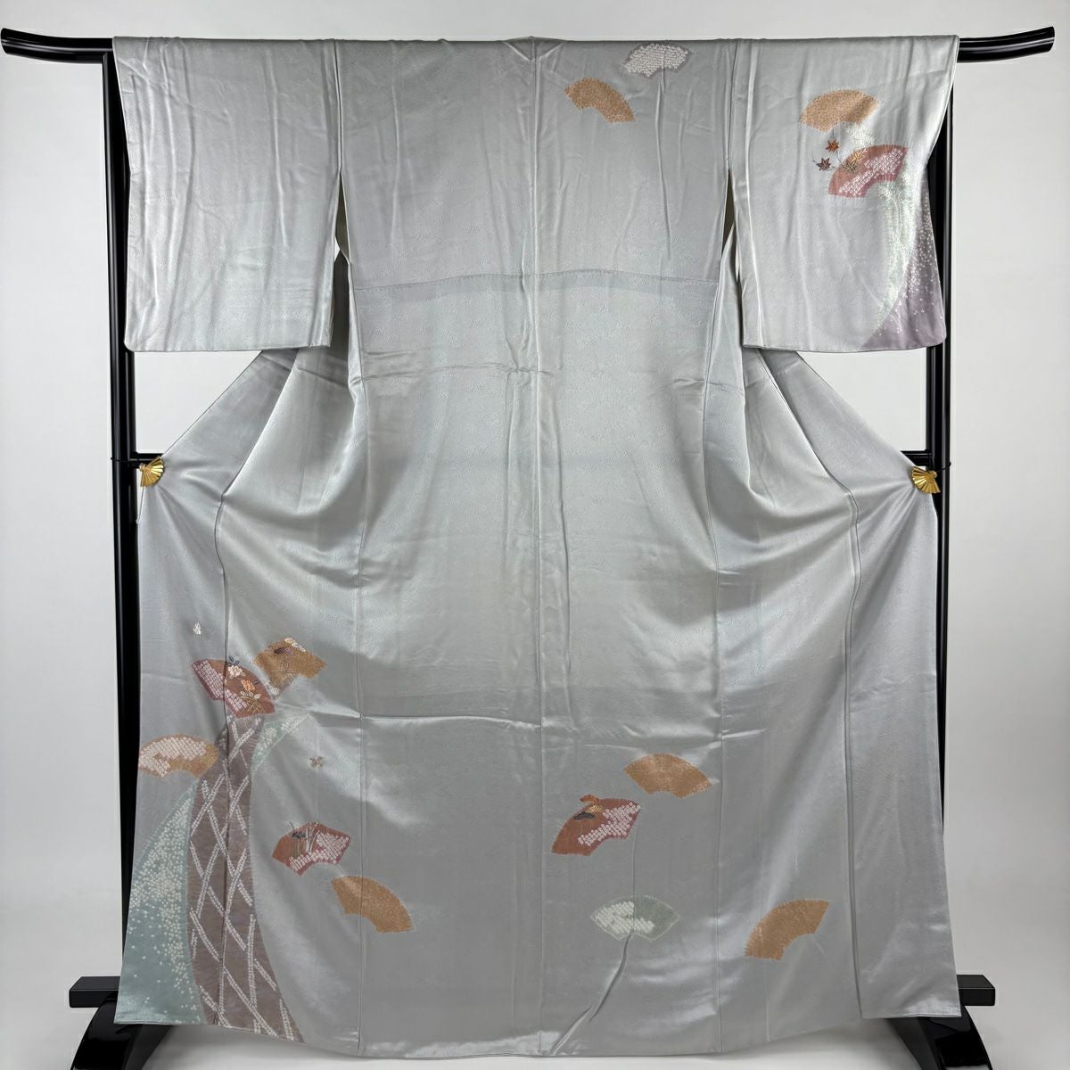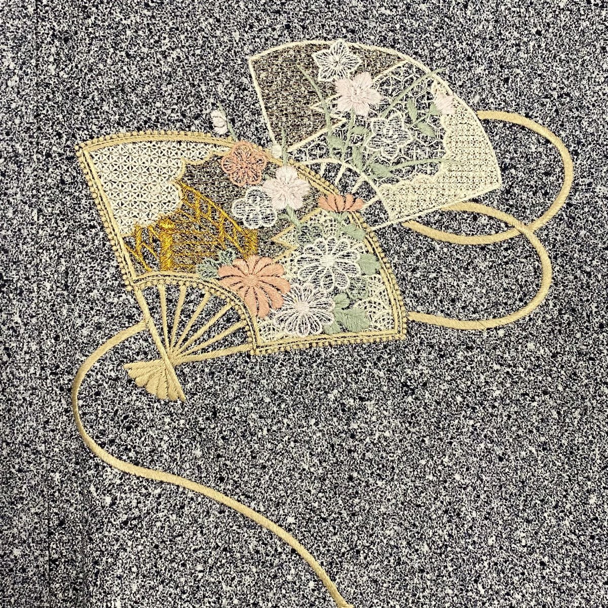 【在庫一掃】 付下げ 身丈160.5cm 裄丈64.5cm M 袷 扇 草花 金糸 刺繍 黒灰 正絹 秀品