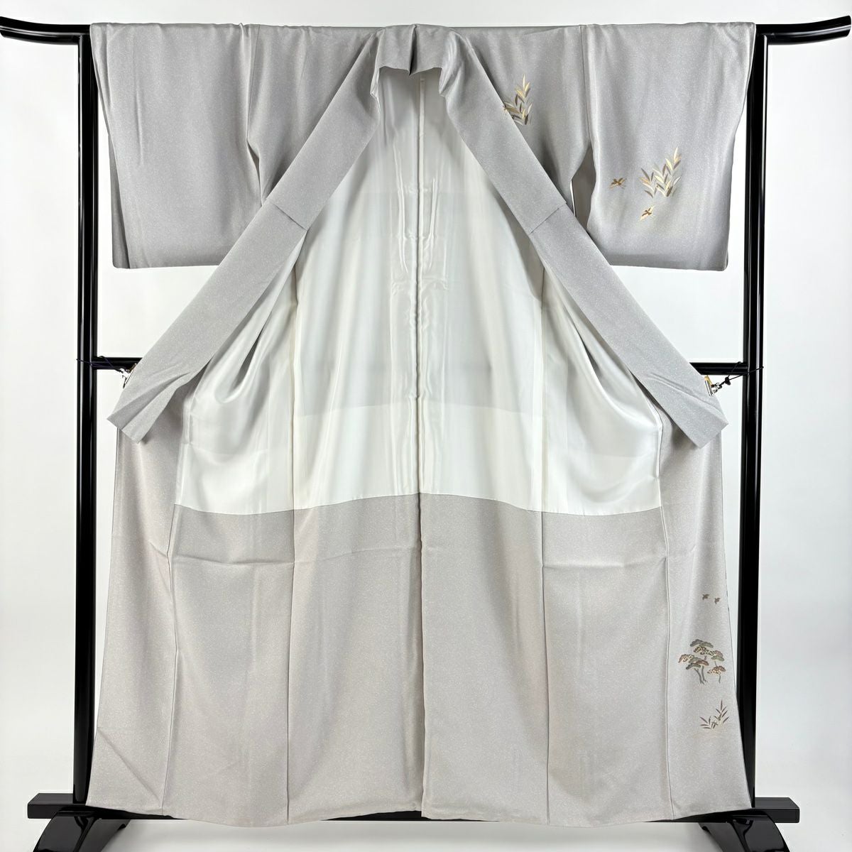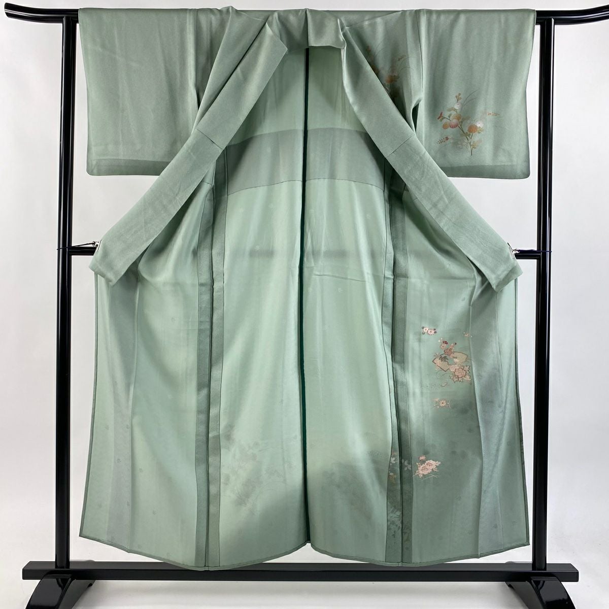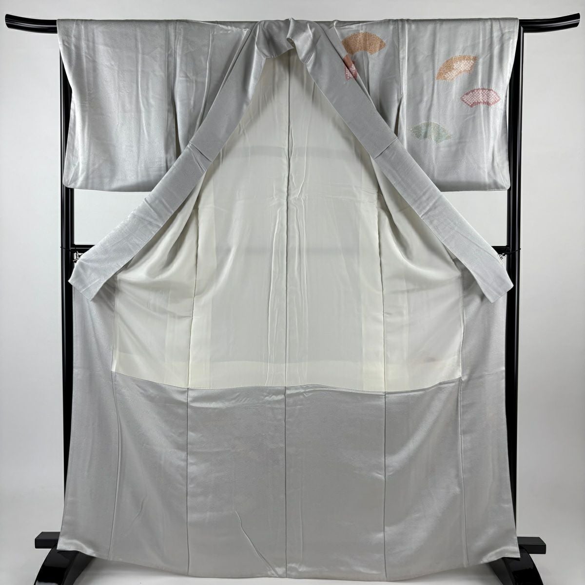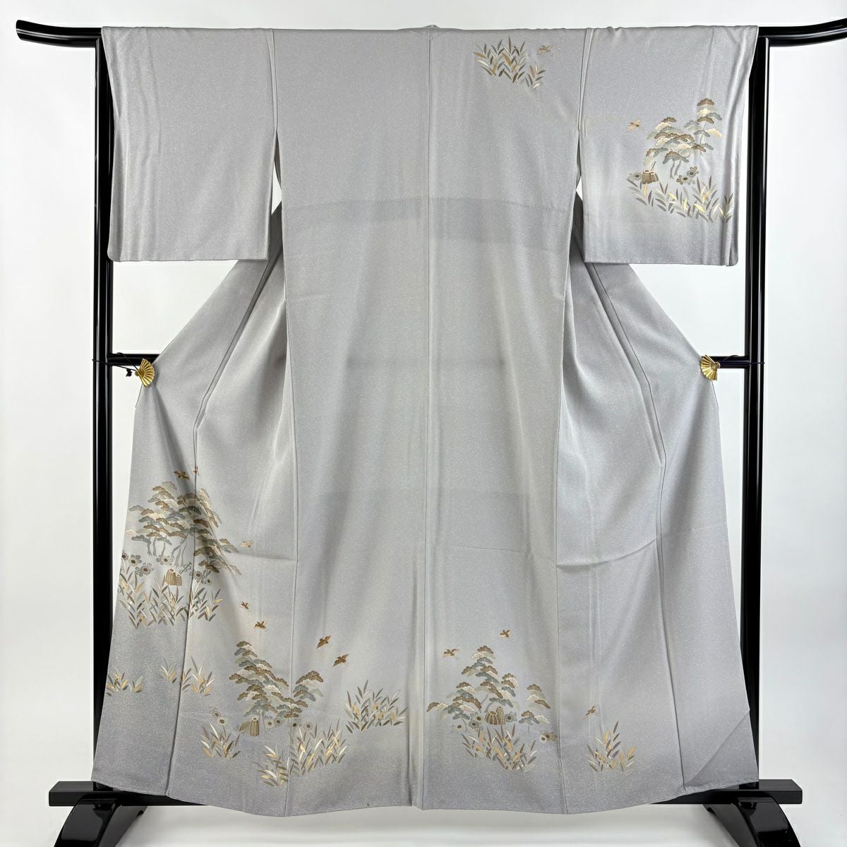 【在庫一掃】 付下げ 身丈160.5cm 裄丈64.5cm M 袷 扇 草花 金糸 刺繍 黒灰 正絹 秀品