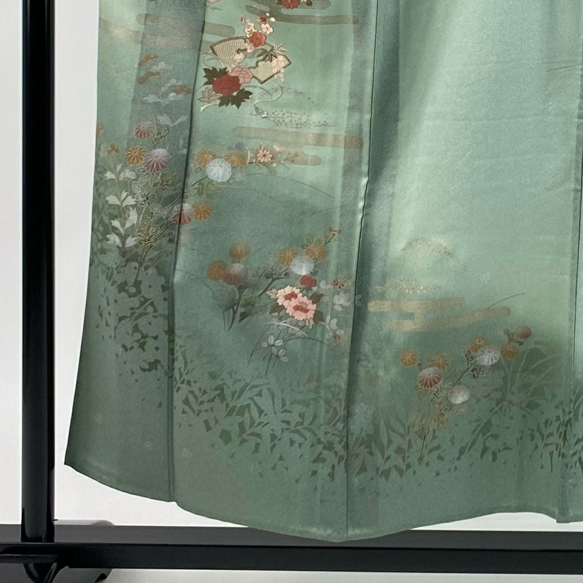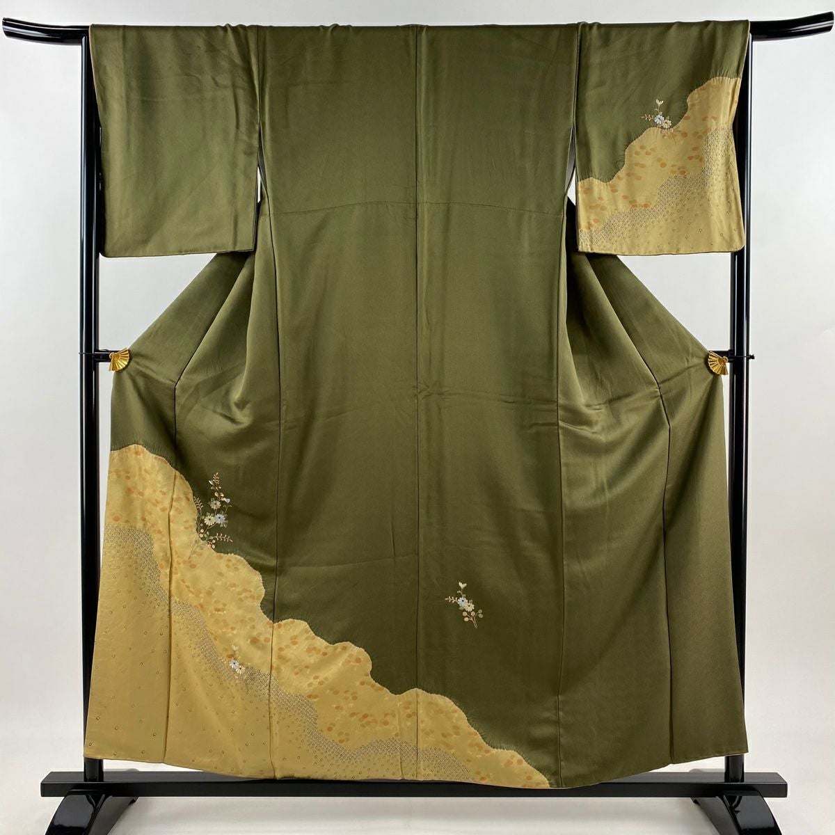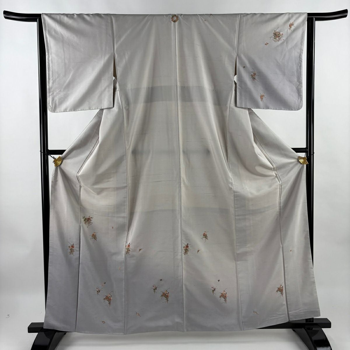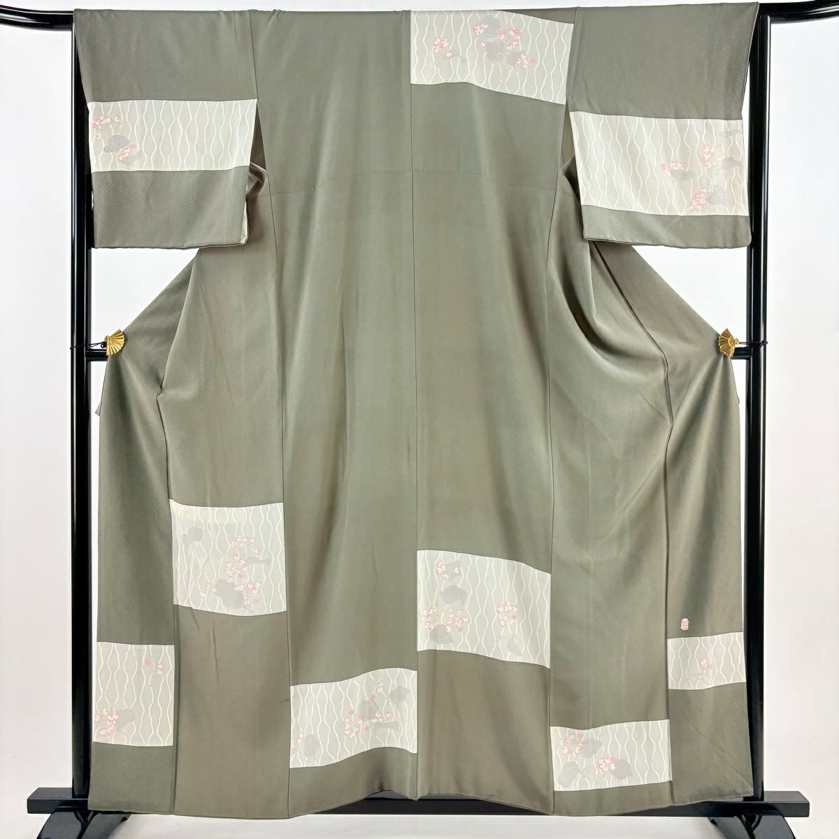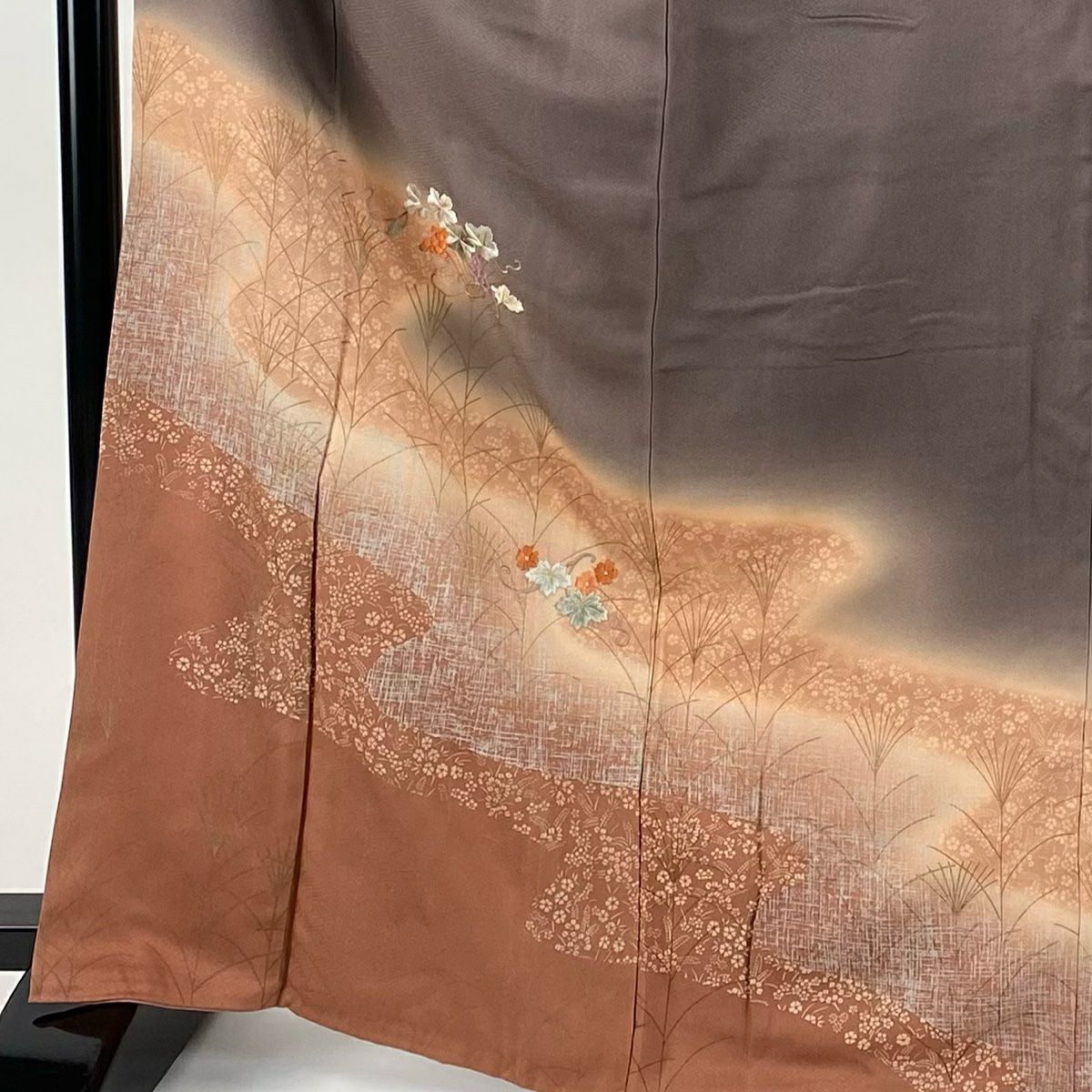 【在庫一掃】 付下げ 身丈160.5cm 裄丈64.5cm M 袷 扇 草花 金糸 刺繍 黒灰 正絹 秀品