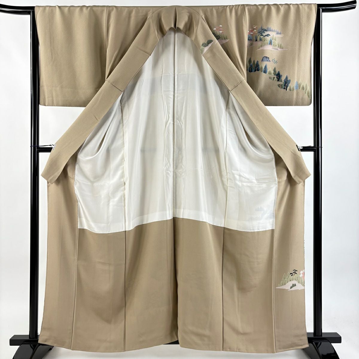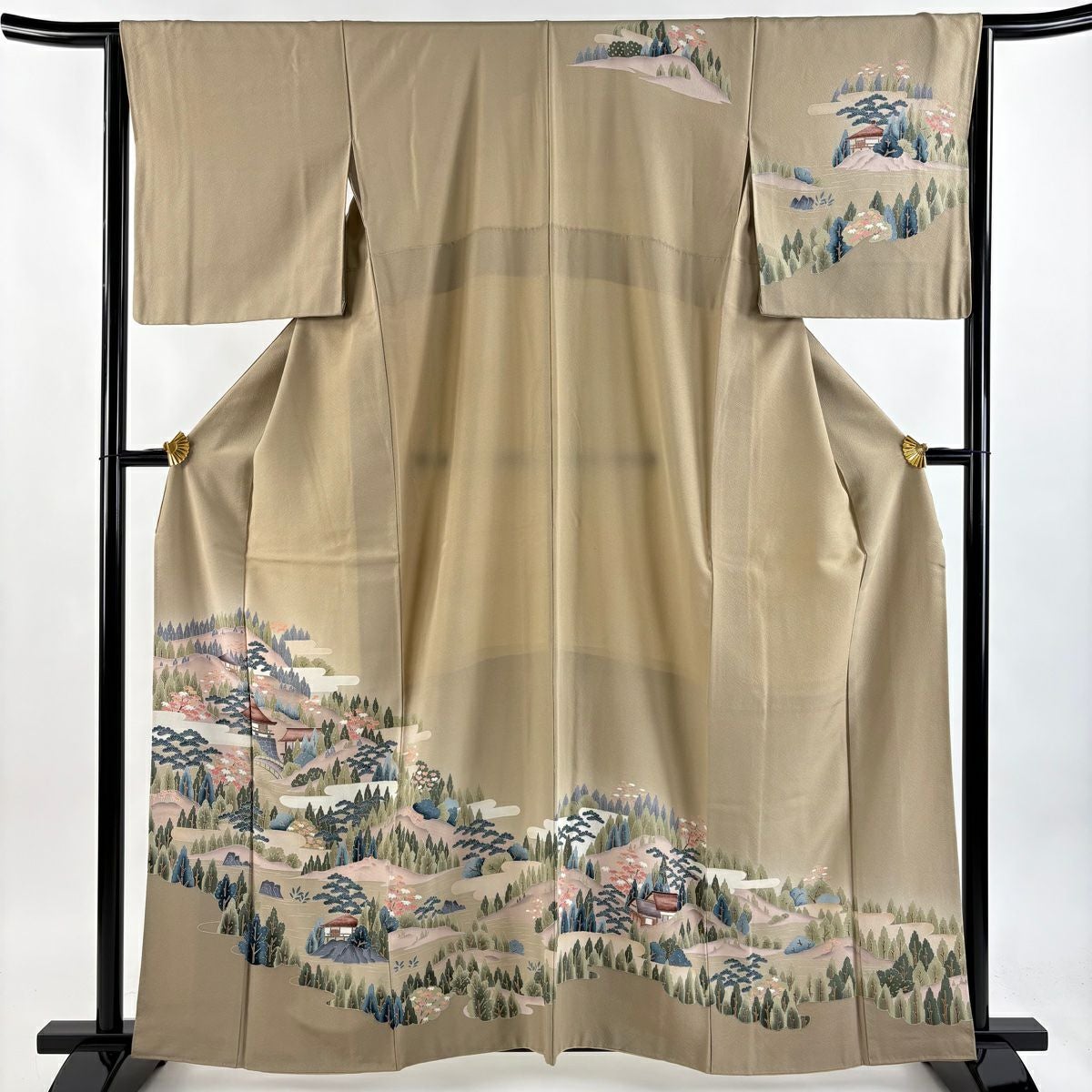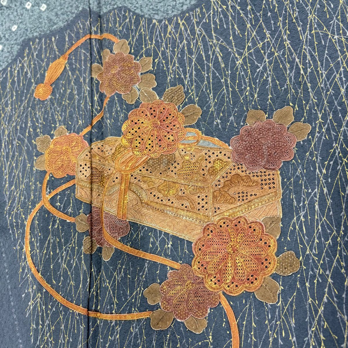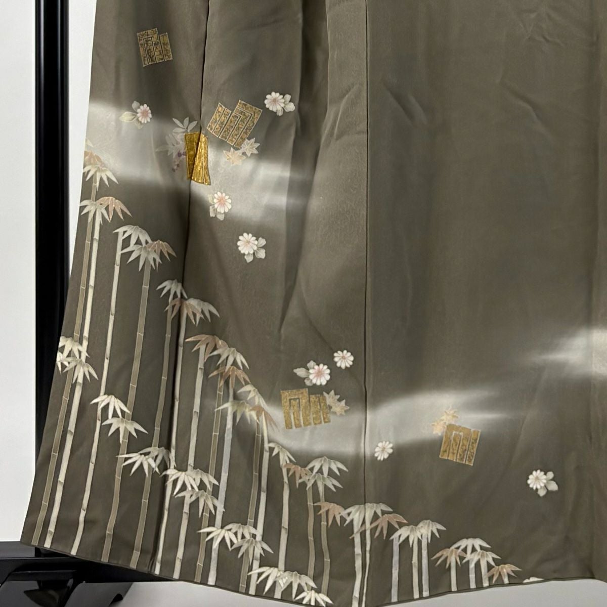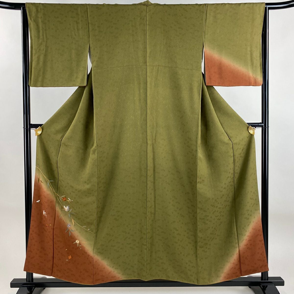 【在庫一掃】 付下げ 身丈160.5cm 裄丈64.5cm M 袷 扇 草花 金糸 刺繍 黒灰 正絹 秀品