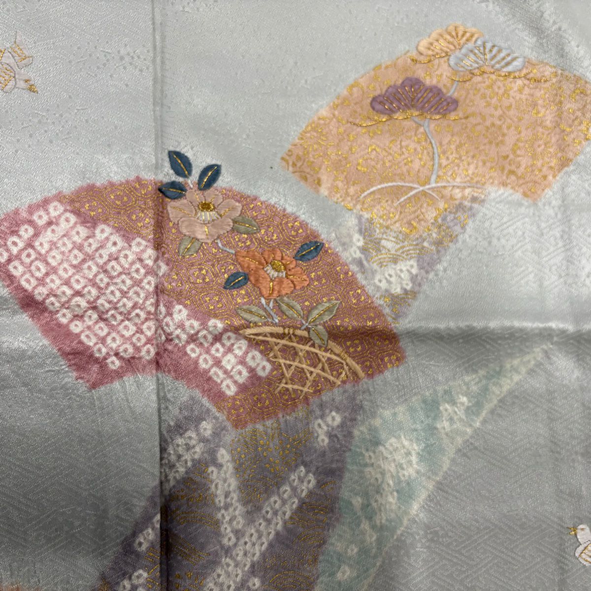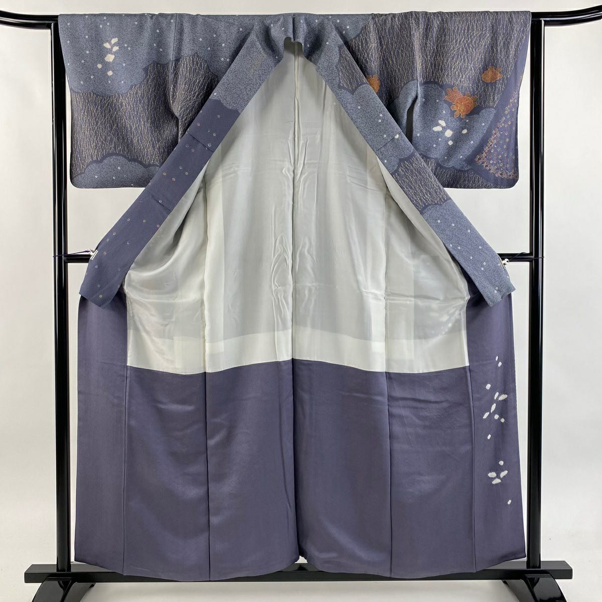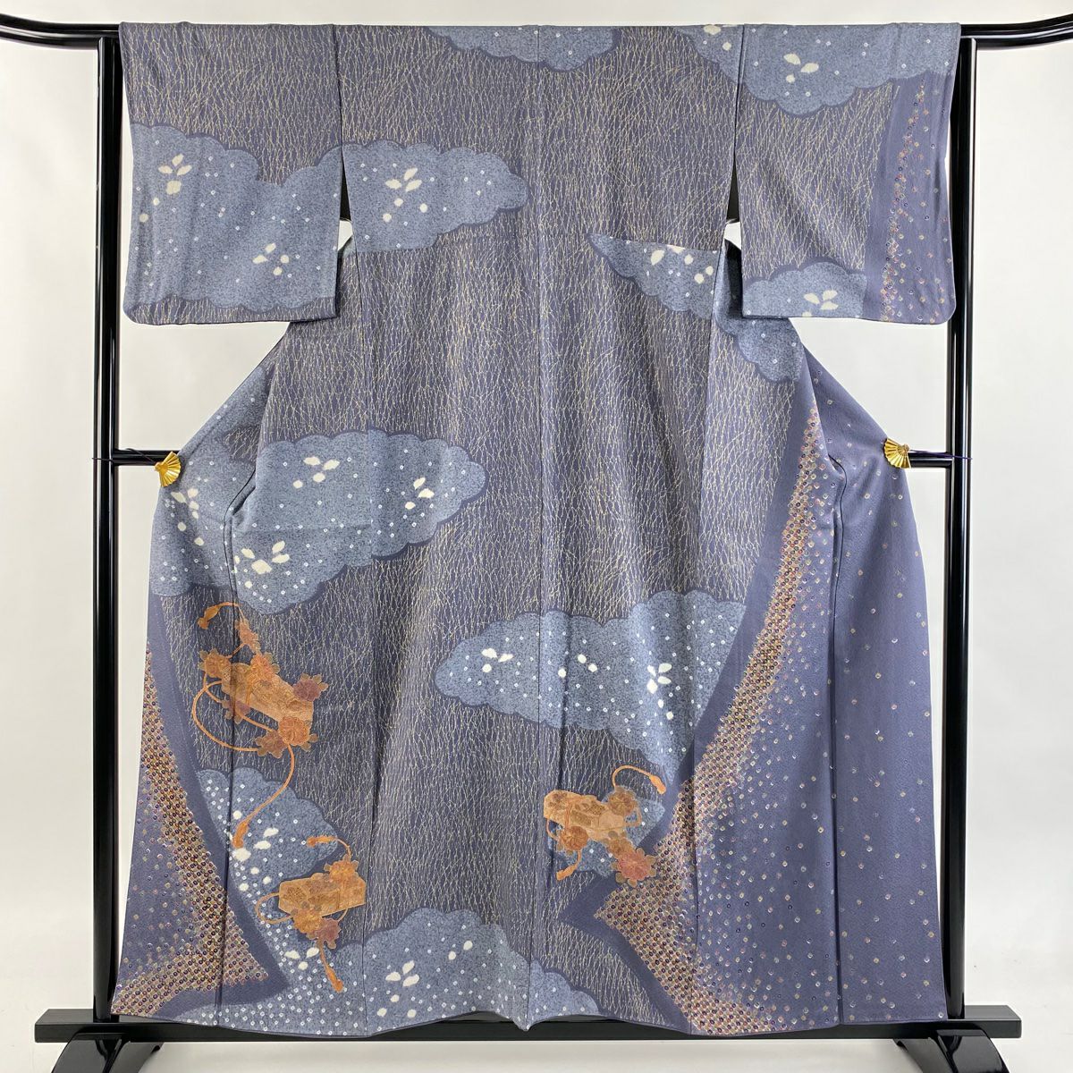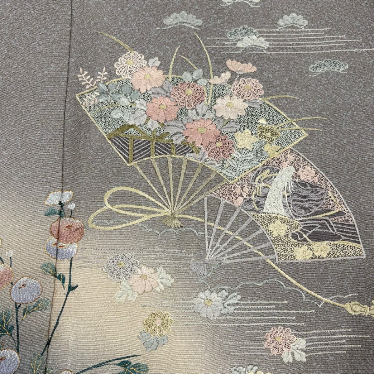 【在庫一掃】 付下げ 身丈168cm 裄丈66cm M 袷 扇面 草花 刺繍 金彩 青灰色 正絹 秀品