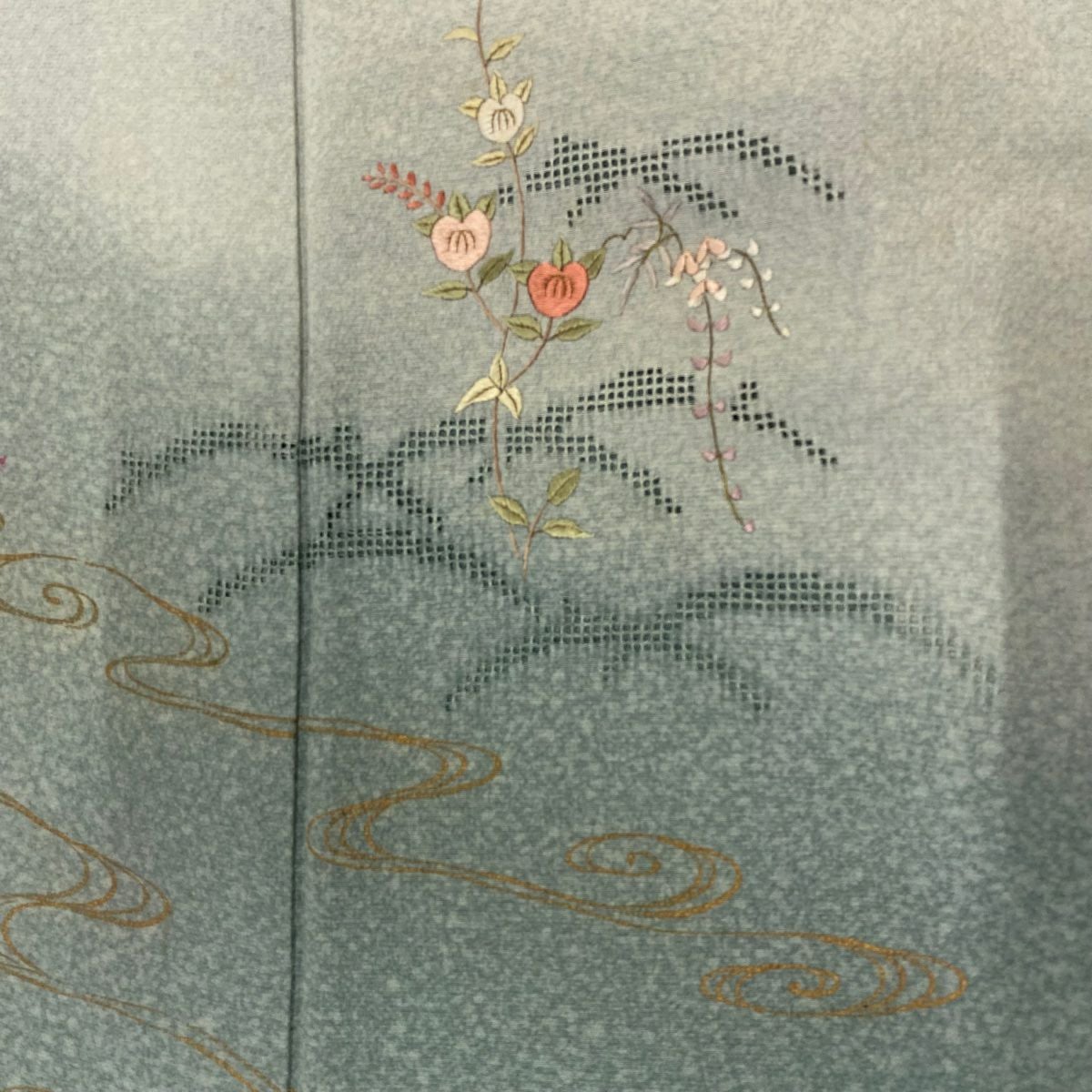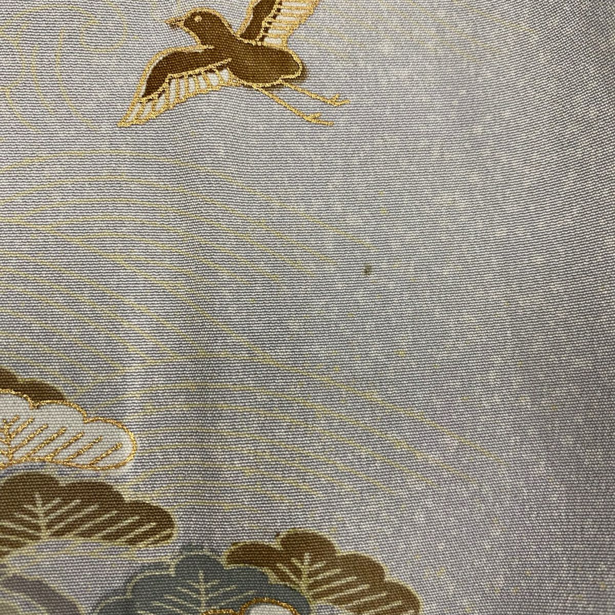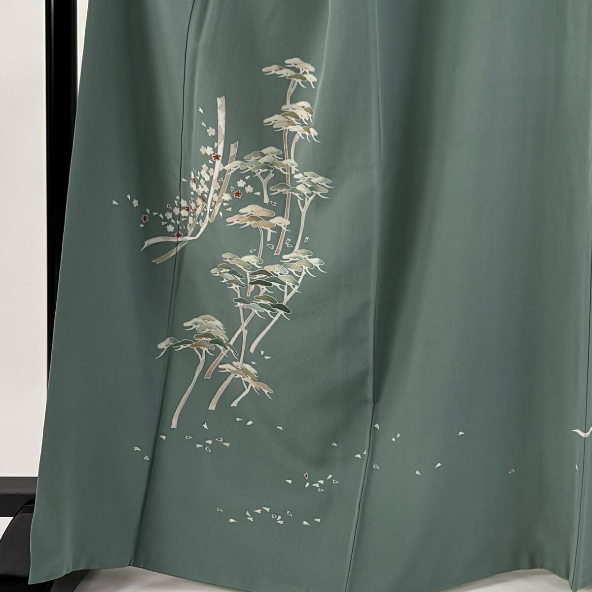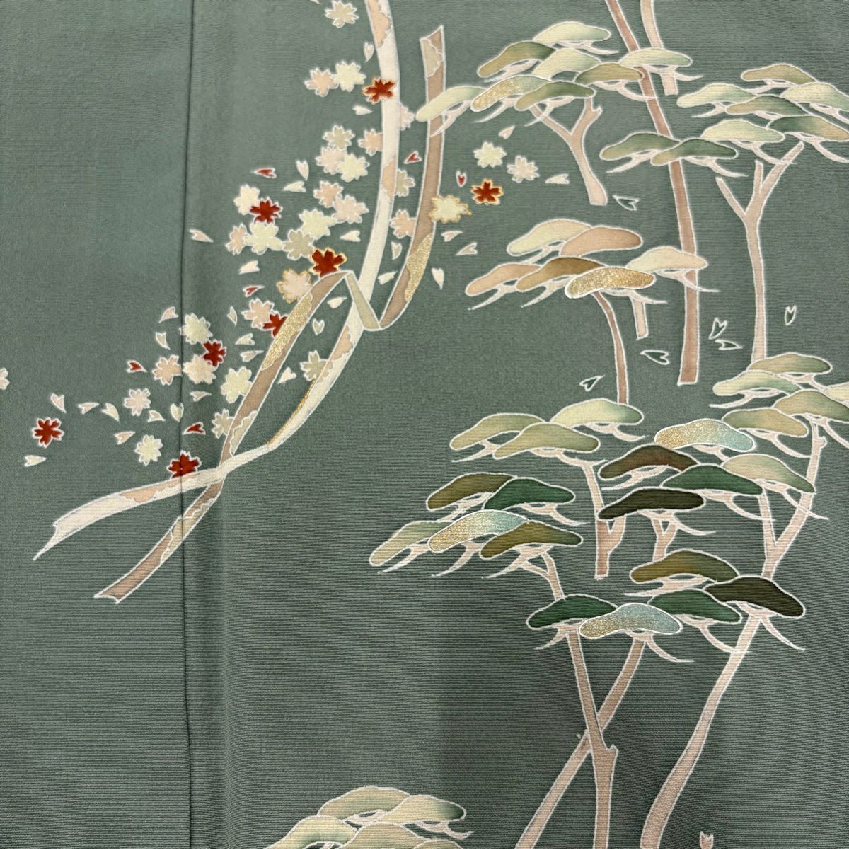 【在庫一掃】 付下げ 身丈164.5cm 裄丈67cm M 袷 松 花 金彩 灰緑 正絹 秀品 一つ紋
