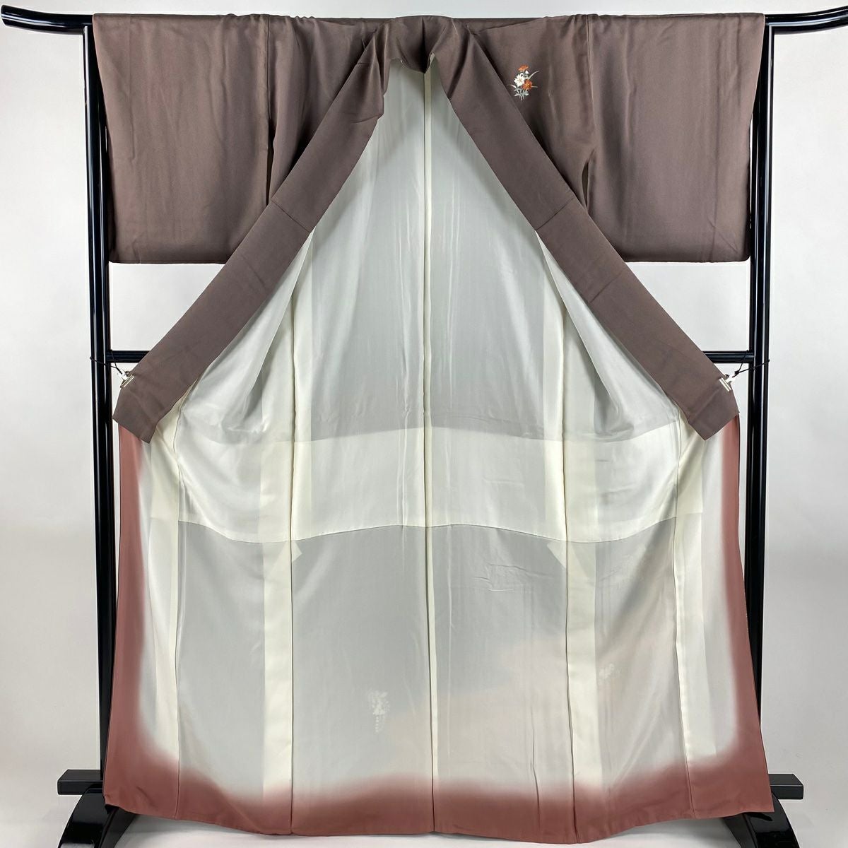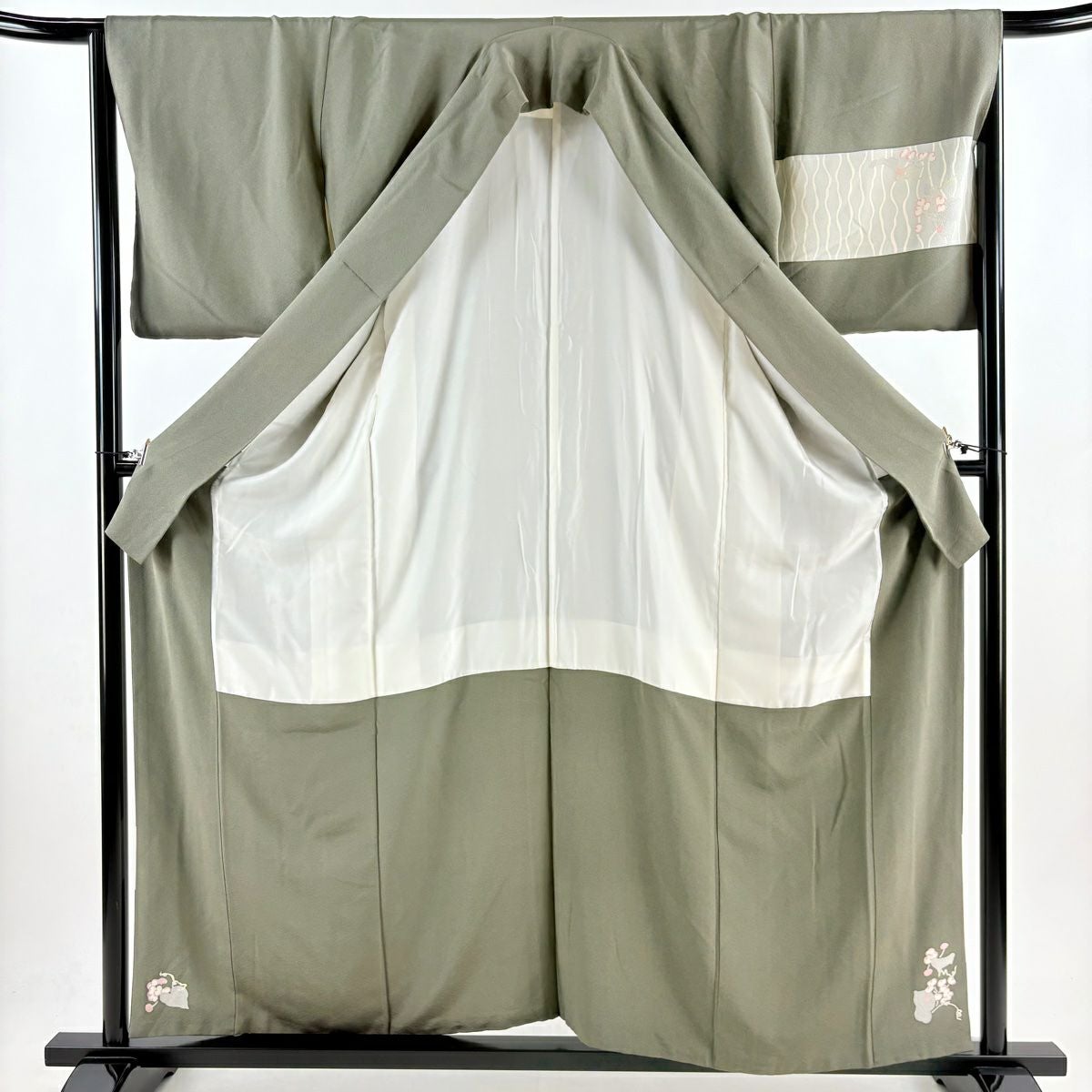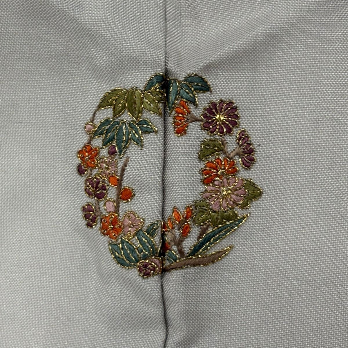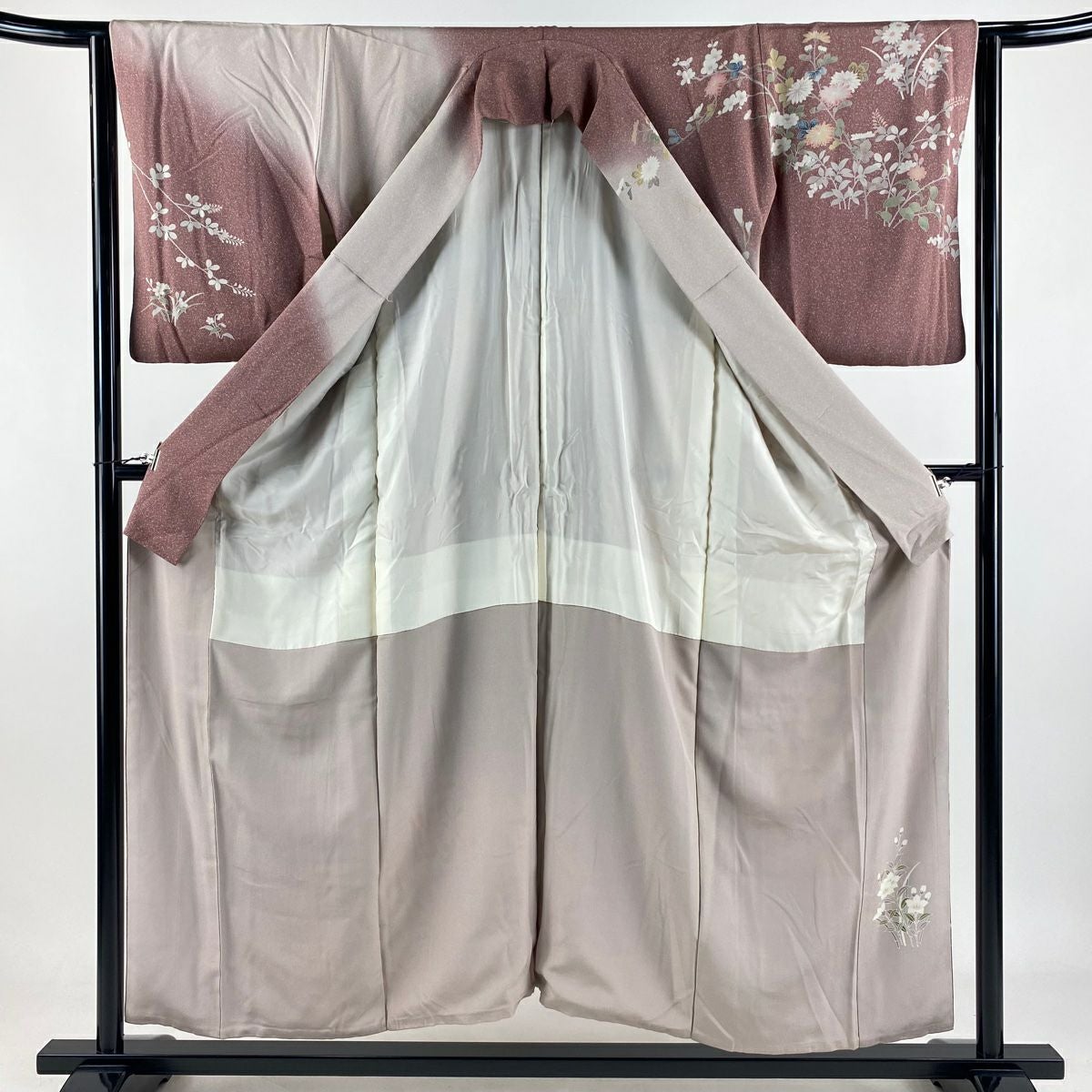 付下げ 身丈162.5cm 裄丈63.5cm S 袷 紬地 草花 梅 刺繍 ぼかし 灰色 正絹 秀品 一つ紋