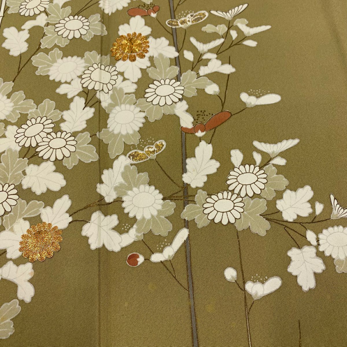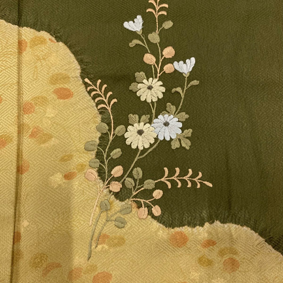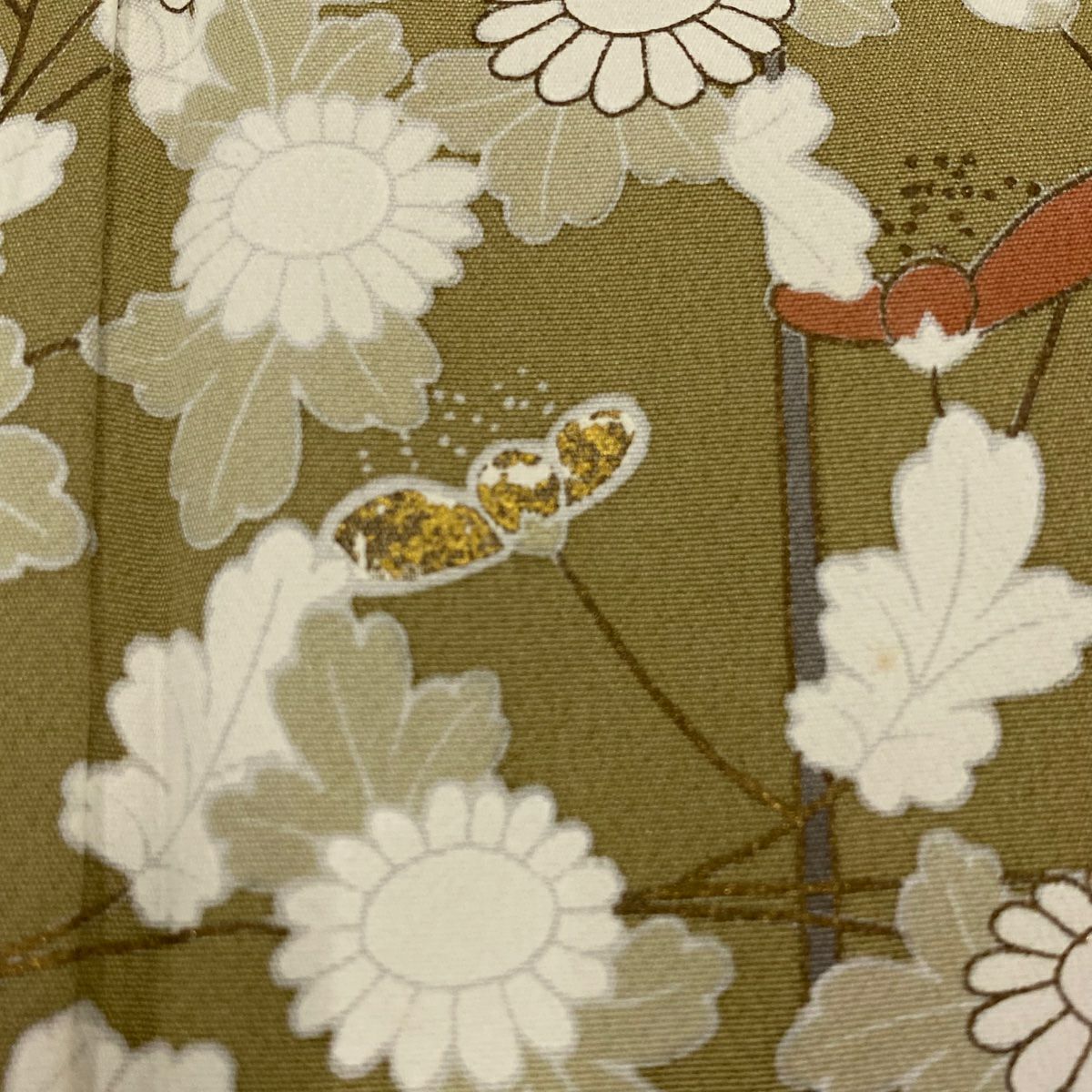 【在庫一掃】 付下げ 身丈155.5cm 裄丈67cm M 袷 菊 萩 刺繍 絞り 茶緑色 正絹 秀品