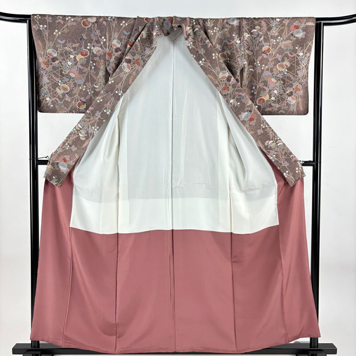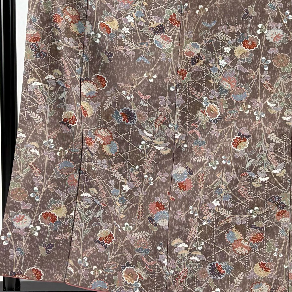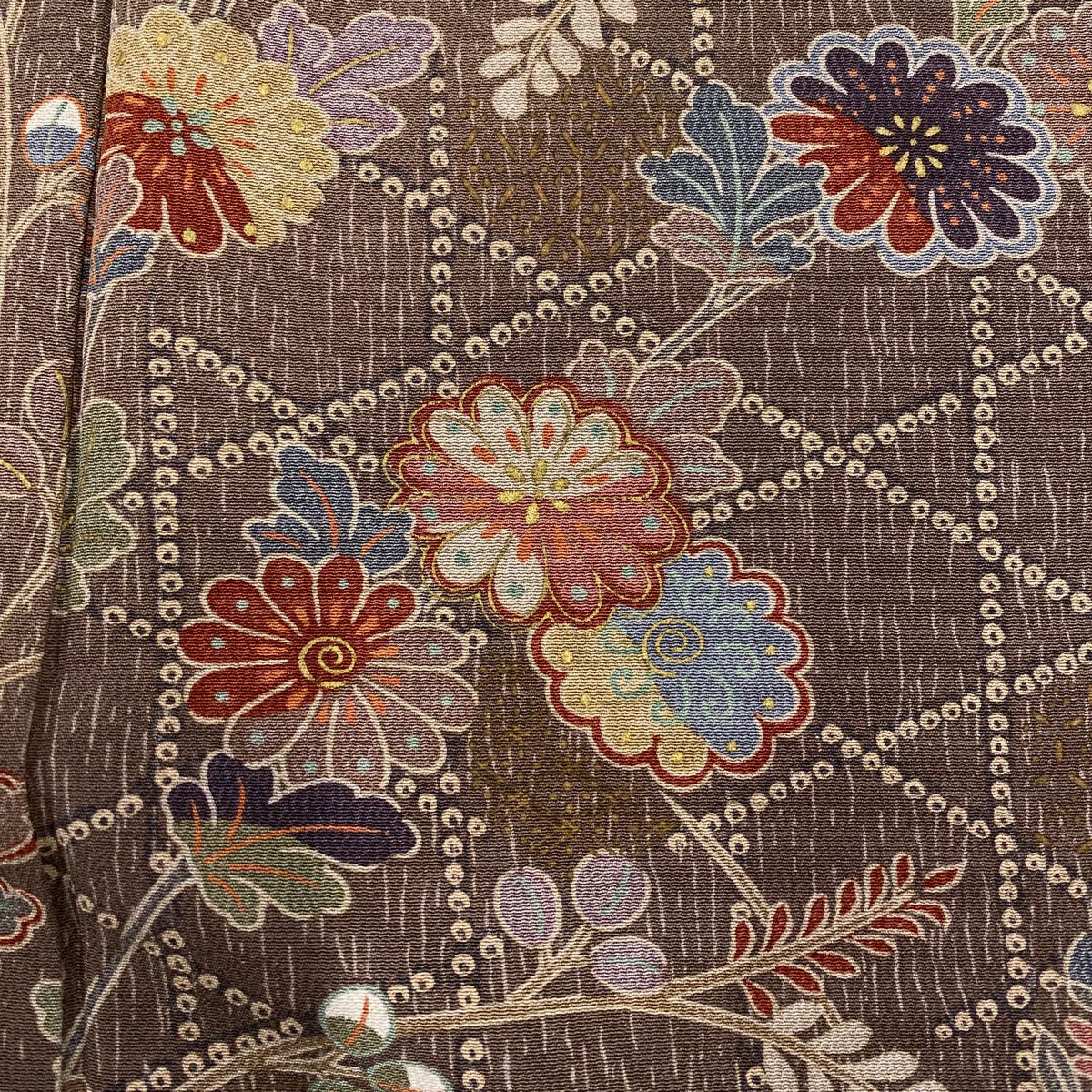 【美品】 小紋 身丈158cm 裄丈63cm S 袷 二代目 更甚 落款あり 更紗 草花 茶色 正絹 秀品