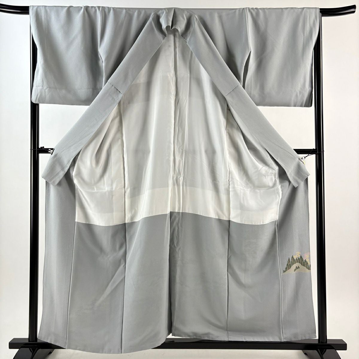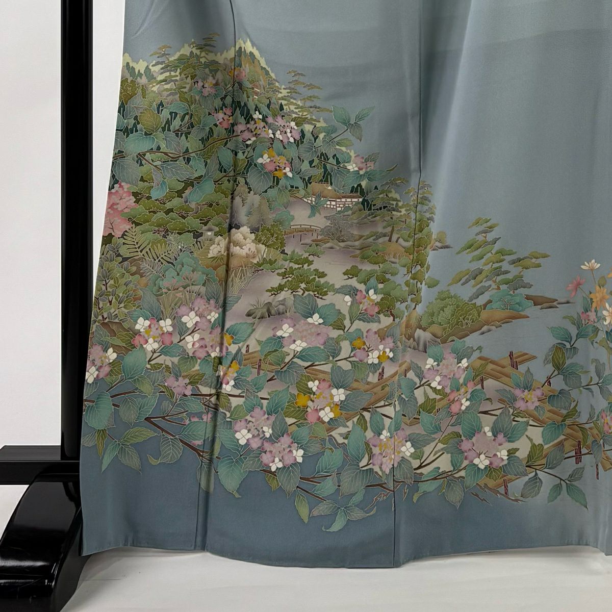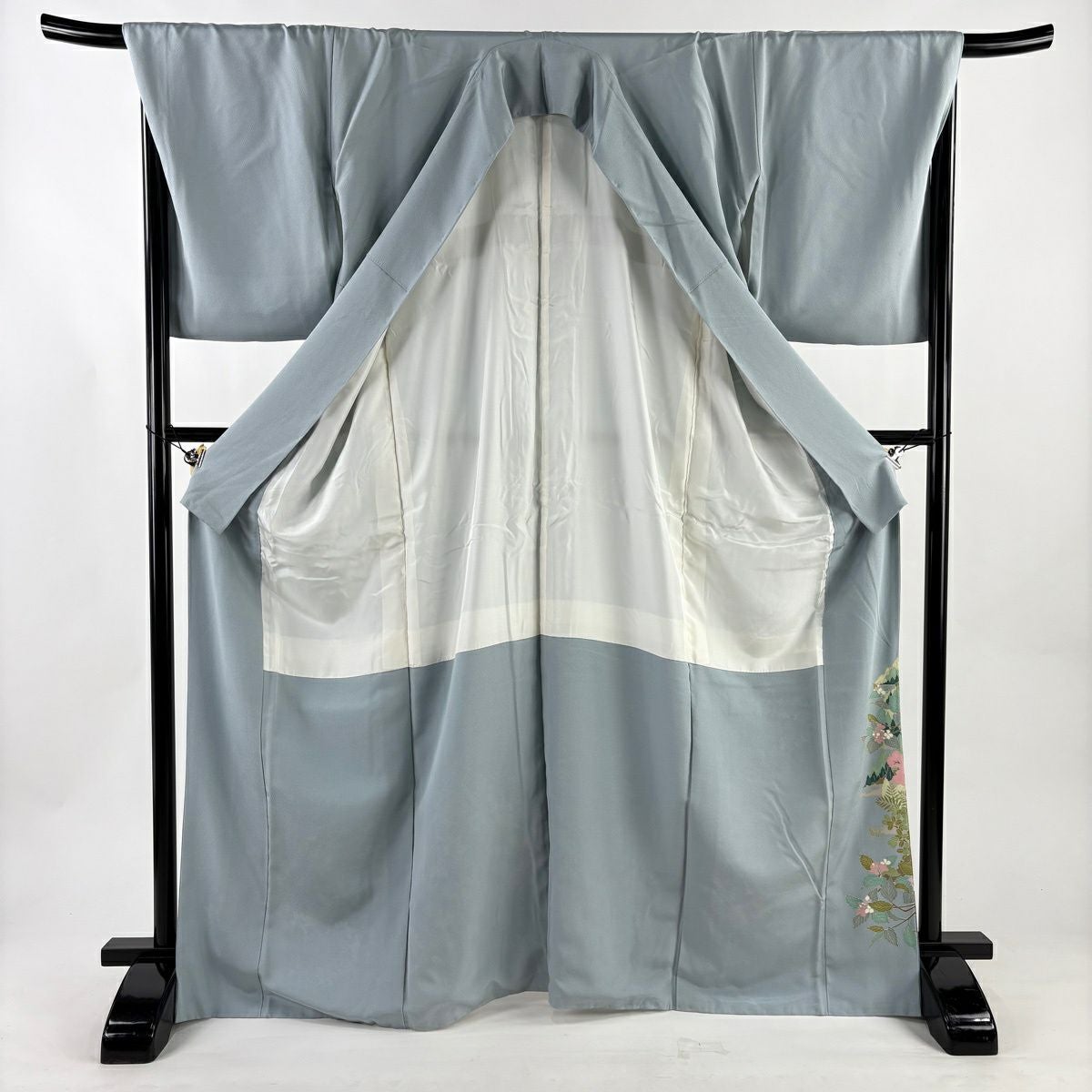 色留袖 身丈168cm 裄丈69.5cm L 袷 落款あり 風景 樹木 ぼかし 青灰色 正絹 秀品 一つ紋