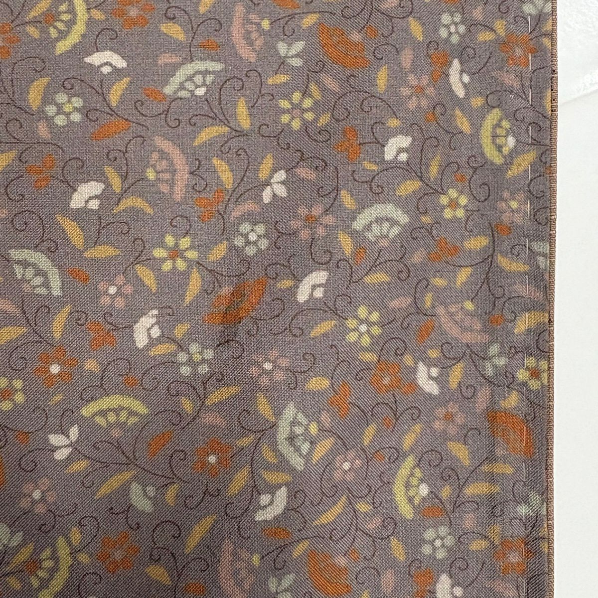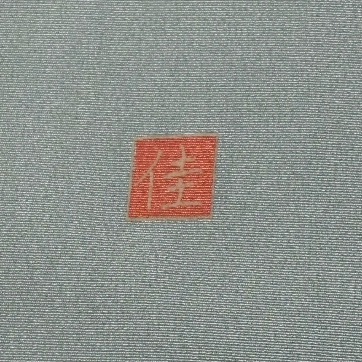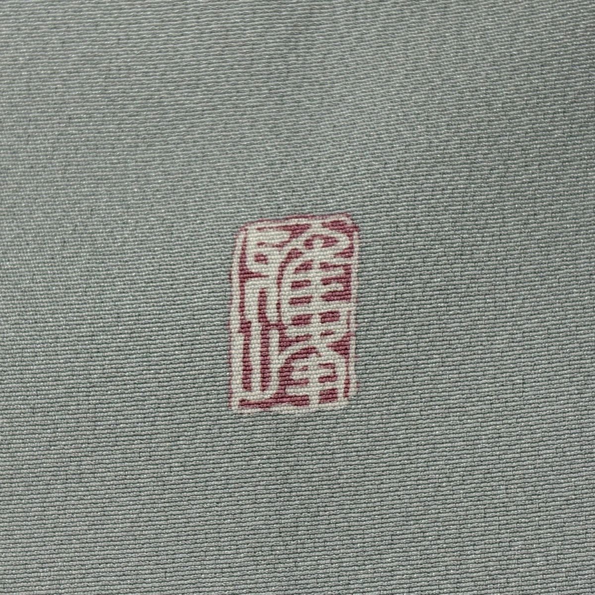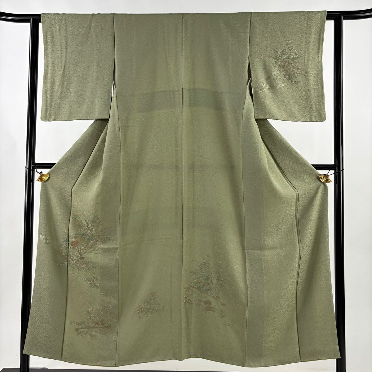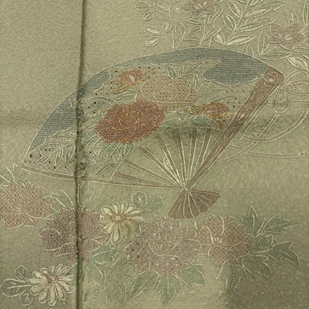 【美品】 付下げ 身丈151.5cm 裄丈61cm S 袷 鈴乃屋 扇 草花 刺繍 金糸 灰緑 正絹 秀品