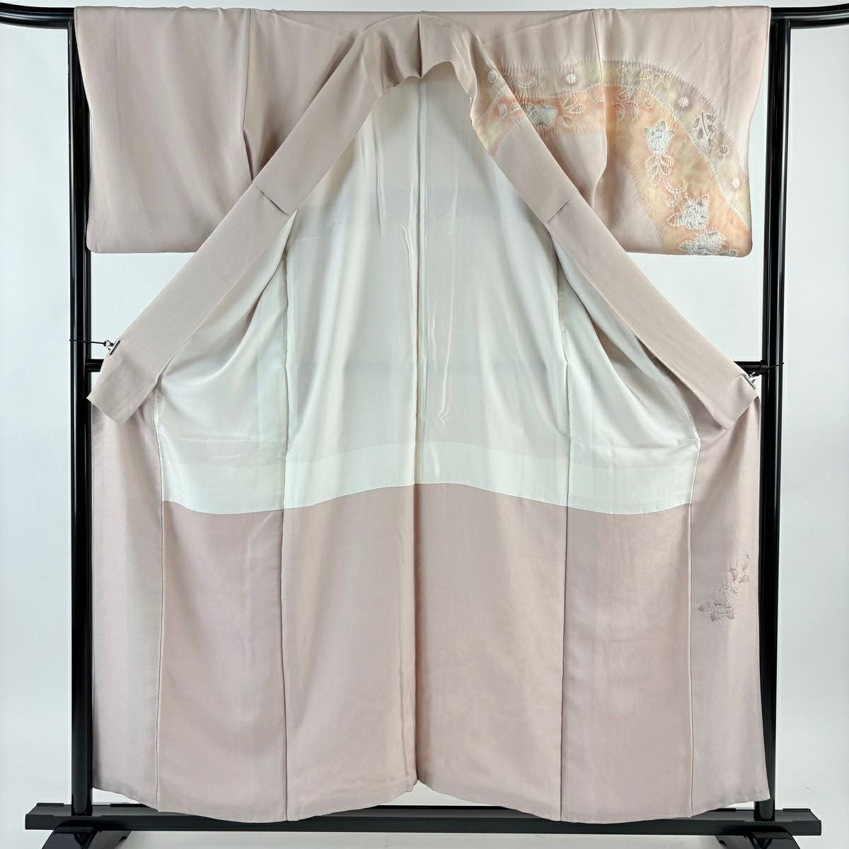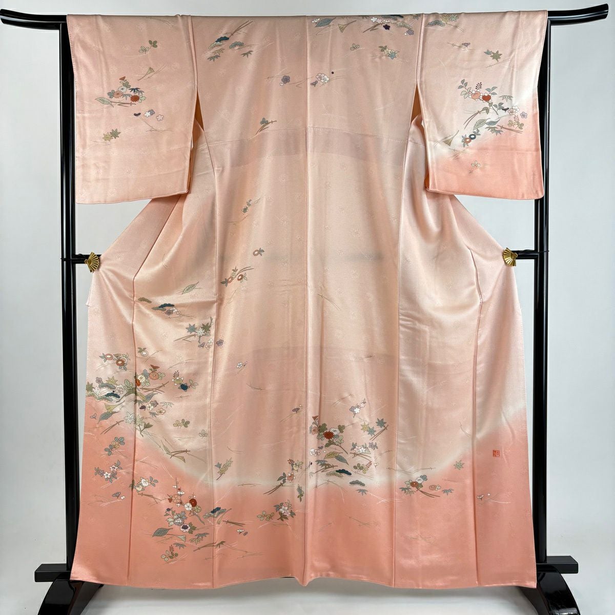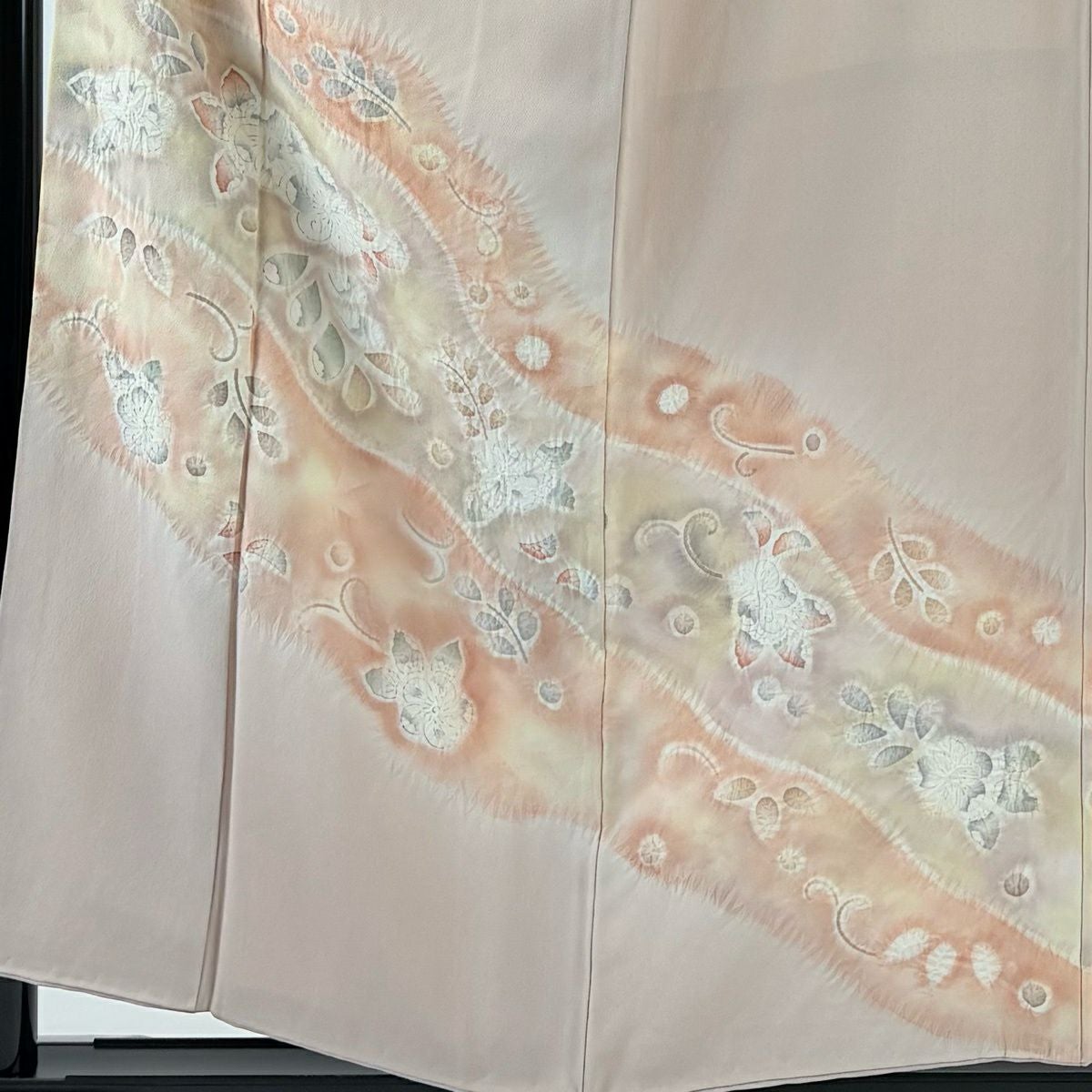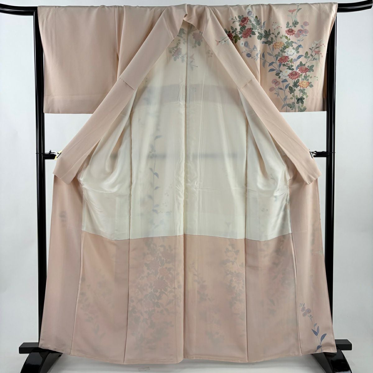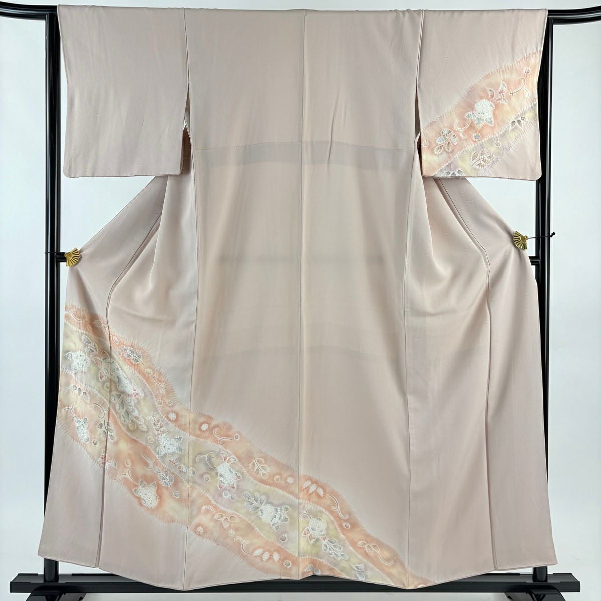 訪問着 身丈156cm 裄丈64cm M 袷 道長取 草花 ぼかし 絞り ピンクベージュ 正絹 秀品